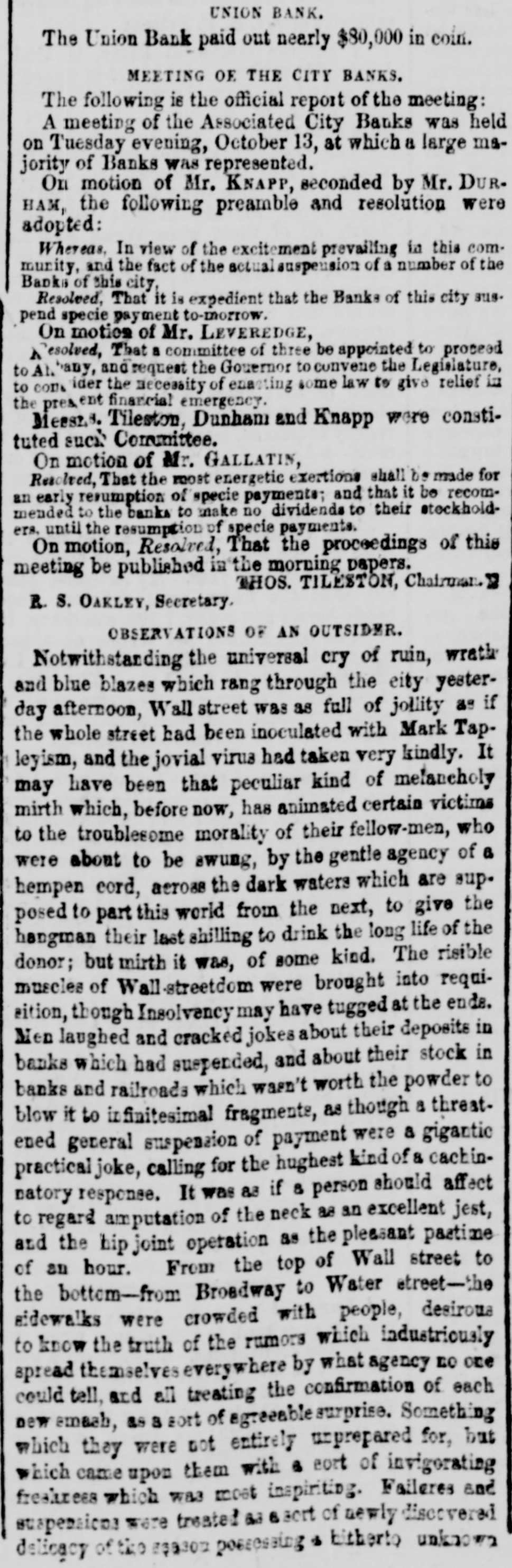 UNION BANK. The Union Bank paid out nearly $80,000 in coin. MEETING OE THE CITY BANKS. The following is the official report of the meeting: A meeting of the Associated City Banks was held on Tuesday evening, October 13, at which a large majority of Banks was represented. On motion of Mr. KNAPP, seconded by Mr. DURHAM, the following preamble and resolution were adopted: Whereas, In view of the excitement prevailing in this community, and the fact of the actual suspension of a number of the Banks of this city, Resolved, That it is expedient that the Banks of this city sus. pend specie payment to-morrow. On motion of Mr. LEVEREDGE, Resolved, That a committee of three be appointed to proceed to AM bany, and request the Gouernor to convene the Legislature, to come ider the necessity of enacting some law to give relief in the pres, ent financial emergency. Messr.8. Tileston, Dunham and Knapp were constituted such Committee. On motion of Mr. GALLATIN, Resolved, That the most energetic exertions shall be made for an early resumption of specie payments; and that it be recommended to the banks to make no dividends to their stockholders, until the resumption of specie payments. On motion, Resolved, That the proceedings of this meeting be published in the morning papers. THOS. TILESTON, Chairman. = R. S. OAKLEY, Secretary. OBSERVATIONS OF AN OUTSIDER. Notwithstanding the universal cry of ruin, wrath and blue blazes which rang through the city yesterday afternoon, Wall street was as full of jollity as if the whole street had been inoculated with Mark Tapleyism, and the jovial virus had taken very kindly. It may have been that peculiar kind of melancholy mirth which, before now, has animated certain victims to the troublesome morality of their fellow-men, who were about to be swung, by the gentle agency of a hempen cord, across the dark waters which are supposed to part this world from the next, to give the hangman their last shilling to drink the long life of the donor; but mirth it was, of some kind. The risible muscles of Wall-streetdom were brought into requisition, though Insolvency may have tugged at the ends. Men laughed and cracked jokes about their deposits in banks which had suspended, and about their stock in banks and railroads which wasn't worth the powder to blow it to infinitesimal fragments, as though a threatened general suspension of payment were a gigantic practical joke, calling for the hughest kind of a cachinnatory response. It was as if 8 person should affect to regard amputation of the neck as an excellent jest, and the hip joint operation as the pleasant pastime of an hour. From the top of Wall street to the bottom-from Broadway to Water street-the sidewalks were crowded with people, desirous to know the truth of the rumors which industriously spread themselves everywhere by what agency no one could tell, and all treating the confirmation of each new smash, as a sort of agreeable surprise. Something which they were not entirely unprepared for, but which came upon them with 6 eort of invigorating freshress which was most inspiriting. Failures and suspensions were treated as ascrt of newly discovered delicacy of the possessing $ bitherto unknown