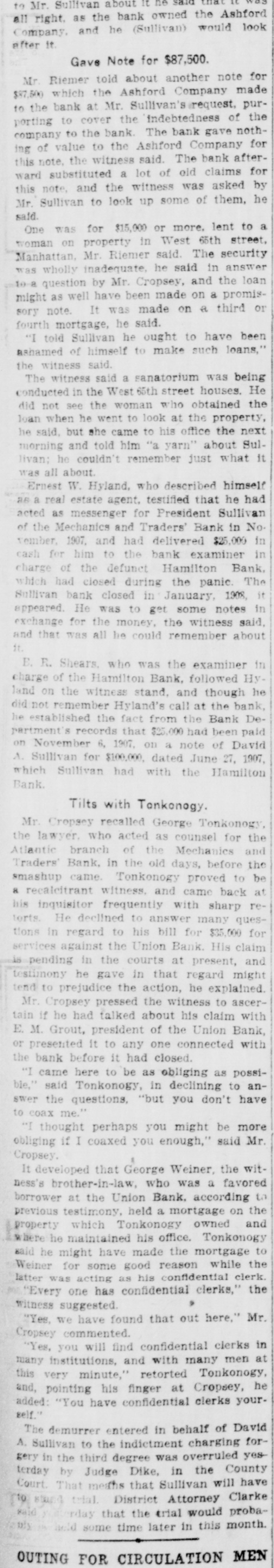 all right, as the bank owned the Ashford Company, and he (Sullivan) would look after it. Gave Note for $87,500. Mr Riemer told about another note for $87,500 which the Ashford Company made to the bank at Mr. Sullivan's request, purporting to cover the indebtedness of the company to the bank. The bank gave nothing of value to the Ashford Company for this note, the witness said. The bank afterward substituted a lot of old claims for this note, and the witness was asked by Mr. Sullivan to look up some of them, he said. One was for $15,000 or more. lent to a woman on property in West 65th street, Manhattan, Mr. Riemer said. The security was wholly inadequate, he said in answer to question by Mr. Cropsey, and the loan might as well have been made on a promissory note. It was made on a third or fourth mortgage, he said. "I told Sullivan he ought to have been ashamed of himself to make such loans," the witness said. The witness said a sanatorium was being conducted in the West 65th street houses. He did not see the woman who obtained the loan when he went to look at the property, he said, but she came to his office the next morning and told him "a yarn" about Sullivan; he couldn't remember just what it was all about. Ernest W. Hyland, who described himself as a real estate agent, testified that he had acted as messenger for President Sullivan of the Mechanics and Traders' Bank in No. vember, 1907. and had delivered $25,000 in cash for him to the bank examiner in charge of the defunct Hamilton Bank, which had closed during the panie. The Sullivan bank closed in January, 1908, it appeared. He was to get some notes in exchange for the money, the witness said, and that was all he could remember about it. B. R. Shears. who was the examiner in charge of the Hamilton Bank, followed Hyland on the witness stand, and though he did not remember Hyland's call at the bank, he established the fact from the Bank Department's records that $25,000 had been paid on November 6, 1907, on a note of David A. Sullivan for $100,000. dated June 27, 1907, which Sullivan had with the Hamilton Bank. Tilts with Tonkonogy. Mr. Cropsey recalled George Tonkonogy, the lawyer. who acted as counsel for the Atlantic branch of the Mechanics and Traders' Bank. in the old days, before the smashup came. Tonkonogy proved to be recalcitrant witness. and came back at his inquisitor frequently with sharp retorts. He declined to answer many questions in regard to his bill for $35,000 for services against the Union Bank. His claim is pending in the courts at present, and testimony he gave in that regard might tend to prejudice the action, he explained. Mr. Cropsey pressed the witness to ascertain if he had talked about his claim with E. M. Grout, president of the Union Bank, or presented it to any one connected with the bank before it had closed. "I came here to be as obliging as possible," said Tonkonogy, in declining to answer the questions, "but you don't have to coax me." "I thought perhaps you might be more obliging if I coaxed you enough," said Mr. Cropsey. It developed that George Weiner, the witness's brother-in-law, who was a favored borrower at the Union Bank, according to previous testimony, held a mortgage on the property which Tonkonogy owned and where he maintained his office. Tonkonogy said he might have made the mortgage to Weiner for some good reason while the latter was acting as his confidential clerk. "Every one has confidential clerks," the witness suggested. "Yes, we have found that out here," Mr. Cropsey commented. "Yes, you will find confidential clerks in many institutions, and with many men at this very minute," retorted Tonkonogy, and, pointing his finger at Cropsey, he added: "You have confidential clerks yourself." The demurrer entered in behalf of David A. Sullivan to the indictment charging for-