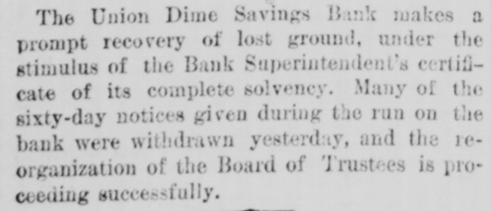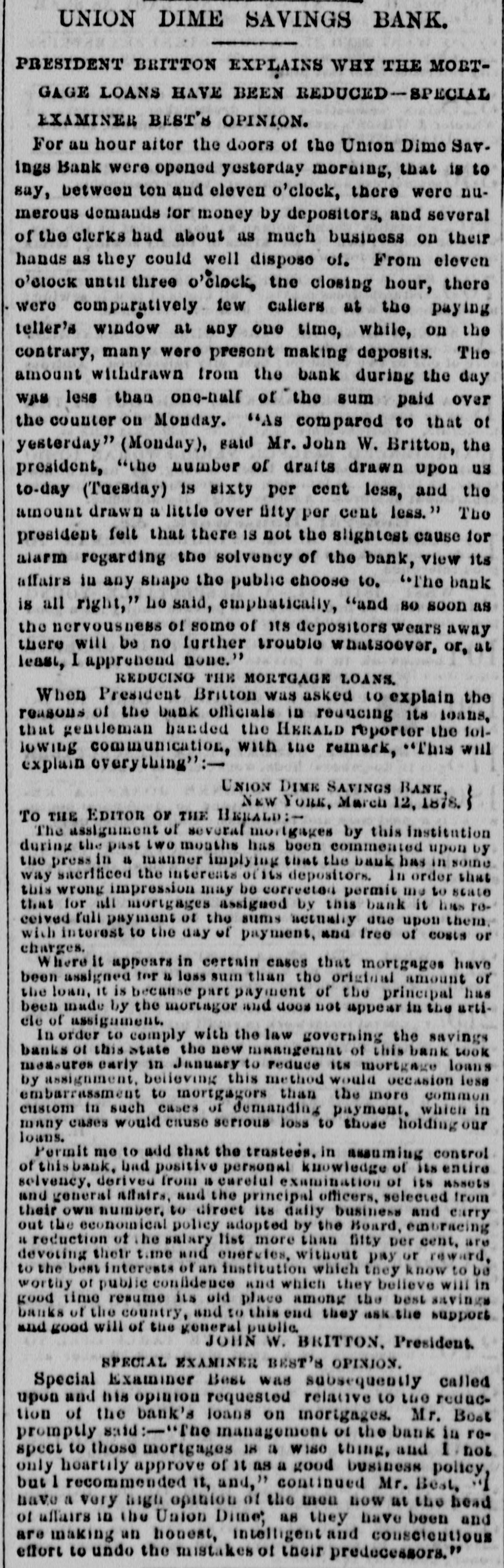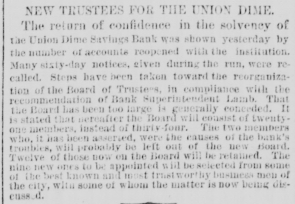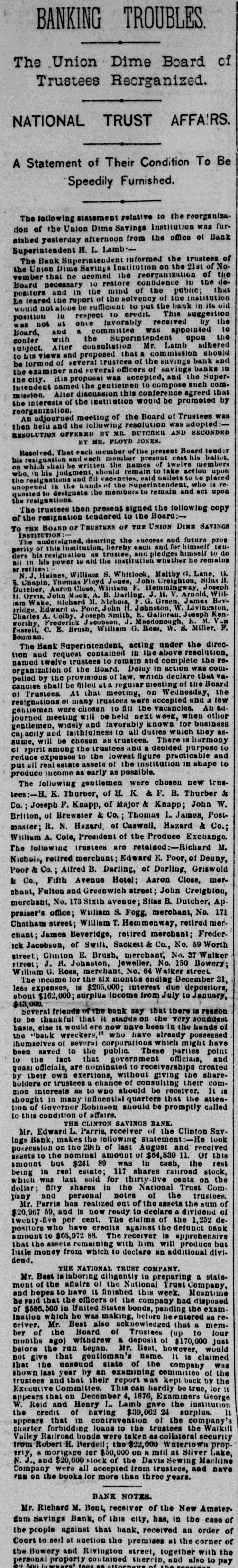 BANKING TROUBLES. The Union Dime Board of Trustees Reorganized. NATIONAL TRUST AFFAIRS. A Statement of Their Condition To Be Speedily Furnished. The following statement relative to the reorganizadon of the Union Dime Savings Institution was furaished yesterday afternoon from the office of Bank Superintendent H. L. LambThe Bank Superintendent informed the trustees of the Union Dime Savings Institution on the 21st of No. vember that he deemed the reorganization of the Board necessary to restore contidence in the depositors and in the mind of the public; that Le leared the report of the solvency of the institution would not alone be sufficient to put the bank in its old position in respect to credit. This suggestion was not at once favorably received by the Board, and a committee was appointed to conter with the Superintendent upon the subject. After consultation Mr. Lamb adhered to his views and proposed that commission should be formed of several trustees of the savings bank and the examiner and Feveral officers of savings banks in the city. His proposal was accepted, and the SuperIntendent named the gentlemen to compose such commission. After discussion this conference agreed that the interests of the institution would be promoted by reorganization. AD adjourned meeting of the Board of Trustees was then helu and the following resolution was adopted RESOLUTION OFFERED BY MR. DUTCHER AND SECONDED BY MR. FLOYD JONES. Resolved. That each member of the present Board tender his resignation and each member present cast his ballot. on which shall be written the names of twelve members who. in his judgment, should remain to take action upon the and fill vacancies, said ballots to be placed unopened in the hands of the Superintendent, who is requested to designate the members to remain and act upon the resignations. The trustees then present signed the following copy of the resignation tendered to the Board:To THE BOARD OF TRUSTEES OF THE UNION DIME SAVINGS The INSTITUTION: undersigned. desiring the success and future pros perity or this institution, hereby each and for himself tenders his resignation AS trustee, and pledges himself to do all in his power to aid the institution whether he remains or N.J. retires: Haines, William S. Whitlock, Maltby G. Lane, G. S. Chapin, Thomas Floyd Jones, John Creighton, Silas 15. Dutcher, Aaron Close, Wiltiam F. Hemmingway, Joseph H. Orvis. John Mack, B. Darling. J. H. V. Arnold, Willam Wake. Richard M. Nichois, F.G. Green. James Bevgridge. Edward as. Poor. John H. Johnston, W. Livingston. Charles A. Colby. Joseph Smith, E. Galloran. Joseph Kenworthy, Frederick Jacobson, J. Maedonough, E. M. Van Tassell. C. E. Brush, William G. Ross, W. S. Miller, F. Bonman. The Bank Superintendent, acting under the direction and request contained in the above resolution, named welve trustees to remain and complete the reorganization of the Board. Delay in action was compeliod by the provisions of law. which declare that vacancies shall be filled ata regular meeting of the Board 01 Trustees. At that meeting, on Wednesday, the resignations of many trustees were accepted and a lew gentlemen were chosen to fill the vacancies. An adjourned meeting will be held next week, when other gentlemen, widely and lavorably known for business capacity and faithiulness to all duties which they assume, will be chosen as trustees. There IS harmony of spirit among the trustees and a decided purpose to reduce expenses to the lowest figure practicable and put all real estate assets of the institution in shape to produce income as early as possible. The following gentlemen were chosen new trustees:-H. K. Thurber, of H. K. & F. B. Thurber & Co. Joseph F. Knapp, of Major & Knapp; John W. Britton, of Brewster & Co. Thomas L. James, Postmaster; R. N. Hazard, of Caswell, Hazard & Co.; William A. Cole, President of the Produce Exchange. The following trustees are retained:-Richard M. Nichols, retired merchant; Edward E. Poor, of Denny, Poor & Co.; Aifred B. Darling, of Darling, Griswold & Co., Fifth Avenue Hotel; Aaron Close, merchant, Fulton and Greenwich street; John Creighton, merchant, No. 173 Sixth avenue; Silas B. Dutcher, Ap praiser's office; William S. Fogg, merchant, No. 171 Chatham street; William T. Hemmenway, retired merchunt; James Beveridge, retired merchant; FrederICK Jacobson, of Swift, Sackett & Co., No. 59 Worth street; Chnton E. Brush, merchant, No. 37 Walker street; J. H. Johnston, jeweller, No. 150 Bowery; William G. Ross, merchant. No. 64 Walker street. The income for the six months ending December 31, less expenses, IS $205,000; interest due depositors, about $162,000; surplus Income from July to January, $43,000. Several friends of the bank say that there 18 reason to be thankful that it stands on the very soundest basis, else 11 would ere now nave been in the hands of the "bank wreckers," who have already possessed themselves of several corporations which might have been saved to the public. These parties point to the fact that government officials, and guasi officials, are nominated to receiverships created by their own exertions, without giving the sharebolders or trustees a chance of consulting their comIS mon interests as to who should be receiver. It shought in many influential quarters that the attention of Governor Robinson should be promptly called to this condition of affairs. THE CLINTON SAVINGS BANK. Mr. Edward L. Parris, receiver of the Clinton SavIngs Bank, makes the following statement:-He took possession on the 29th of last August and received assets to the nominal amount of $64,830 11. or this amount but $241 89 was in cash, the rest being in real estate; 117 shares ratiroad stock, which was last sold for thirty cents on the dollar; fifty shares in the National Trust Company and personal notes of the trustees. Mr. Parris has realized out of the assets the sum of $20,967 59, and IS now ready to declare a dividend of twenty five per cent. The claims of the 1,252 de. 
