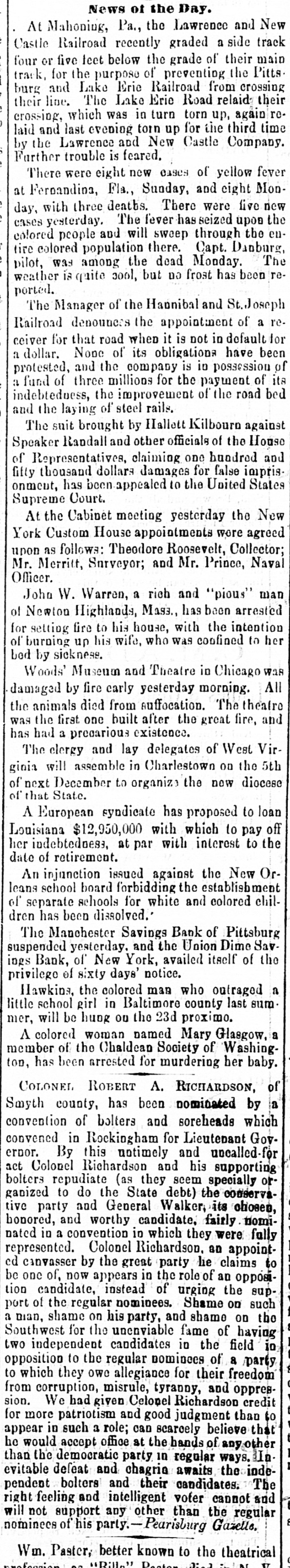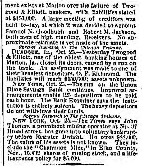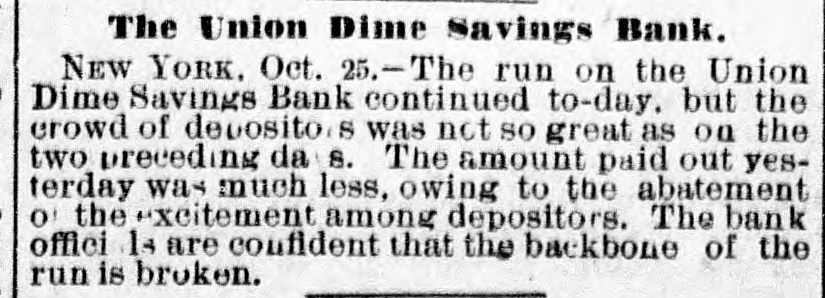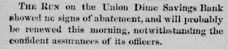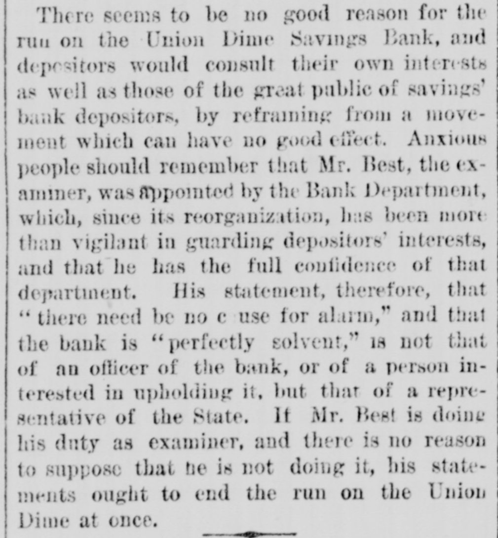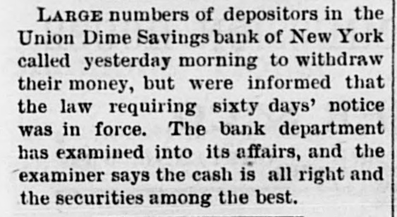 BANKING TROUBLES. The Union Dime Board of Trustees Reorganized. NATIONAL TRUST AFFAIRS. A Statement of Their Condition To Be Speedily Furnished. The following statement relative to the reorganizadon of the Union Dime Savings Institution was furaished yesterday afternoon from the office of Bank Superintendent H. L. LambThe Bank Superintendent informed the trustees of the Union Dime Savings Institution on the 21st of No. vember that he deemed the reorganization of the Board necessary to restore contidence in the depositors and in the mind of the public; that Le leared the report of the solvency of the institution would not alone be sufficient to put the bank in its old position in respect to credit. This suggestion was not at once favorably received by the Board, and a committee was appointed to conter with the Superintendent upon the subject. After consultation Mr. Lamb adhered to his views and proposed that commission should be formed of several trustees of the savings bank and the examiner and Feveral officers of savings banks in the city. His proposal was accepted, and the SuperIntendent named the gentlemen to compose such commission. After discussion this conference agreed that the interests of the institution would be promoted by reorganization. AD adjourned meeting of the Board of Trustees was then helu and the following resolution was adopted RESOLUTION OFFERED BY MR. DUTCHER AND SECONDED BY MR. FLOYD JONES. Resolved. That each member of the present Board tender his resignation and each member present cast his ballot. on which shall be written the names of twelve members who. in his judgment, should remain to take action upon the and fill vacancies, said ballots to be placed unopened in the hands of the Superintendent, who is requested to designate the members to remain and act upon the resignations. The trustees then present signed the following copy of the resignation tendered to the Board:To THE BOARD OF TRUSTEES OF THE UNION DIME SAVINGS The INSTITUTION: undersigned. desiring the success and future pros perity or this institution, hereby each and for himself tenders his resignation AS trustee, and pledges himself to do all in his power to aid the institution whether he remains or N.J. retires: Haines, William S. Whitlock, Maltby G. Lane, G. S. Chapin, Thomas Floyd Jones, John Creighton, Silas 15. Dutcher, Aaron Close, Wiltiam F. Hemmingway, Joseph H. Orvis. John Mack, B. Darling. J. H. V. Arnold, Willam Wake. Richard M. Nichois, F.G. Green. James Bevgridge. Edward as. Poor. John H. Johnston, W. Livingston. Charles A. Colby. Joseph Smith, E. Galloran. Joseph Kenworthy, Frederick Jacobson, J. Maedonough, E. M. Van Tassell. C. E. Brush, William G. Ross, W. S. Miller, F. Bonman. The Bank Superintendent, acting under the direction and request contained in the above resolution, named welve trustees to remain and complete the reorganization of the Board. Delay in action was compeliod by the provisions of law. which declare that vacancies shall be filled ata regular meeting of the Board 01 Trustees. At that meeting, on Wednesday, the resignations of many trustees were accepted and a lew gentlemen were chosen to fill the vacancies. An adjourned meeting will be held next week, when other gentlemen, widely and lavorably known for business capacity and faithiulness to all duties which they assume, will be chosen as trustees. There IS harmony of spirit among the trustees and a decided purpose to reduce expenses to the lowest figure practicable and put all real estate assets of the institution in shape to produce income as early as possible. The following gentlemen were chosen new trustees:-H. K. Thurber, of H. K. & F. B. Thurber & Co. Joseph F. Knapp, of Major & Knapp; John W. Britton, of Brewster & Co. Thomas L. James, Postmaster; R. N. Hazard, of Caswell, Hazard & Co.; William A. Cole, President of the Produce Exchange. The following trustees are retained:-Richard M. Nichols, retired merchant; Edward E. Poor, of Denny, Poor & Co.; Aifred B. Darling, of Darling, Griswold & Co., Fifth Avenue Hotel; Aaron Close, merchant, Fulton and Greenwich street; John Creighton, merchant, No. 173 Sixth avenue; Silas B. Dutcher, Ap praiser's office; William S. Fogg, merchant, No. 171 Chatham street; William T. Hemmenway, retired merchunt; James Beveridge, retired merchant; FrederICK Jacobson, of Swift, Sackett & Co., No. 59 Worth street; Chnton E. Brush, merchant, No. 37 Walker street; J. H. Johnston, jeweller, No. 150 Bowery; William G. Ross, merchant. No. 64 Walker street. The income for the six months ending December 31, less expenses, IS $205,000; interest due depositors, about $162,000; surplus Income from July to January, $43,000. Several friends of the bank say that there 18 reason to be thankful that it stands on the very soundest basis, else 11 would ere now nave been in the hands of the "bank wreckers," who have already possessed themselves of several corporations which might have been saved to the public. These parties point to the fact that government officials, and guasi officials, are nominated to receiverships created by their own exertions, without giving the sharebolders or trustees a chance of consulting their comIS mon interests as to who should be receiver. It shought in many influential quarters that the attention of Governor Robinson should be promptly called to this condition of affairs. THE CLINTON SAVINGS BANK. Mr. Edward L. Parris, receiver of the Clinton SavIngs Bank, makes the following statement:-He took possession on the 29th of last August and received assets to the nominal amount of $64,830 11. or this amount but $241 89 was in cash, the rest being in real estate; 117 shares ratiroad stock, which was last sold for thirty cents on the dollar; fifty shares in the National Trust Company and personal notes of the trustees. Mr. Parris has realized out of the assets the sum of $20,967 59, and IS now ready to declare a dividend of twenty five per cent. The claims of the 1,252 de. 