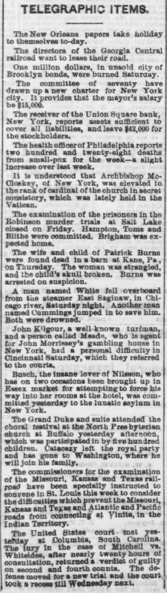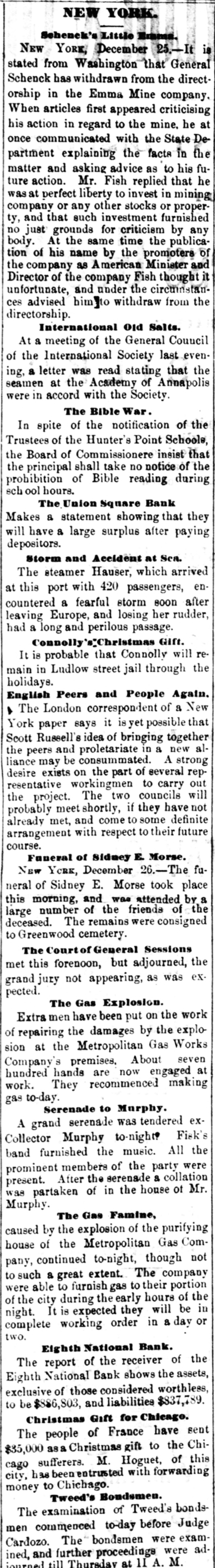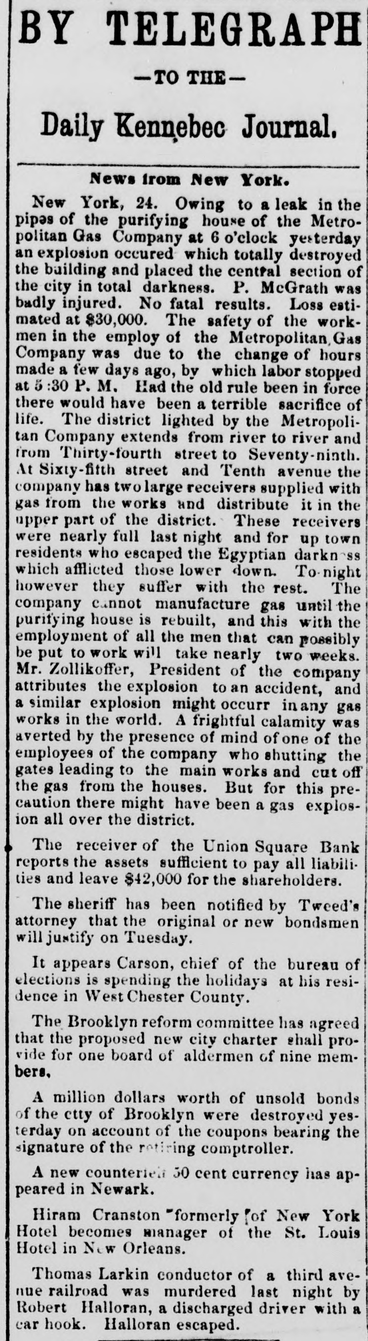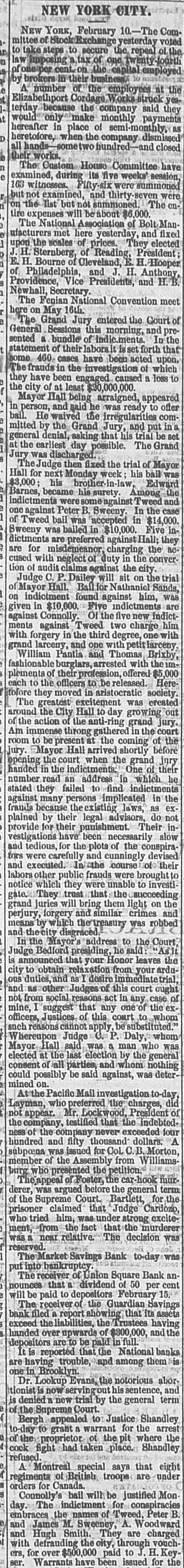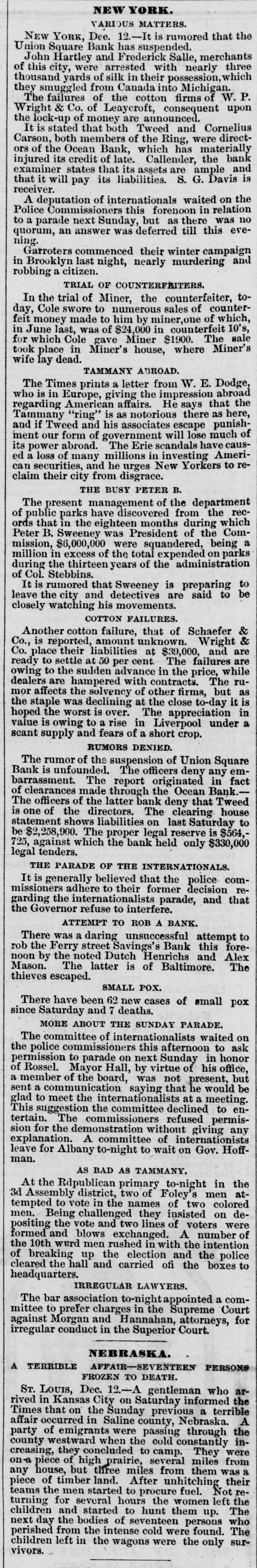 NEW YORK. VARIOUS MATTERS. NEW YORK, Dee. 12.-It is rumored that the Union Square Bank has suspended. John Hartley and Frederick Salle, merchants three this city, were arrested with nearly which of thousand yards of silk in their possession, they smuggled from Canada into Michigan. W. The failures of the cotton firms of P. Wright & Co. of Leaycroft, consequent upon the lock-up of money are announced. It is stated that both Tweed and Cornelius directCarson, both members of the Ring, were of the Ocean Bank, which has materially bank injured ors its credit of late. Callender, the and examiner states that its assets are ample Davis is that it will pay its liabilities. S. G. receiver. deputation of internationals waited relation on the Police A Commissioners this forenoon in was no to parade next Sunday, but as there evequorum, a an answer was deferred till this ning. Garroters commenced their winter campaign and in Brooklyn last night, nearly murdering robbing a citizen. TRIAL OF COUNTERFRITERS. In the trial of Miner, the counterfeiter, counter- toCole swore to numerous sales of which, day, feit money made to him by miner,one of 10's, in June last, was of $24,000 in counterfeit sale which Cole gave Miner $1900. The Miner's took for place in Miner's house, where wife lay dead. TAMMANY ABROAD. The Times prints a letter from W. E. Dodge, abroad who is in Europe, giving the impression that the regarding American affairs. He says here, Tammany "ring" is as notorious there as punishif Tweed and his associates escape much of ment and our form of government will lose have causits abroad. The Erie scandals Ameripower loss of many millions in investing to reed can a securities, and he urges New Yorkers claim their city from disgrace. THE BUSY PETER B. The present management of the department recof public parks have discovered from the which ords that in the eighteen months during ComPeter B. Sweeney was President of the mission, $6,000,000 were squandered, being parks a million in excess of the total expended on during the thirteen years of the administration of Col. Stebbins. It is rumored that Sweeney is preparing be to leave the city and detectives are said to closely watching his movements. COTTON FAILURES. Another cotton failure, that of Schaefer & & is reported, amount unknown. Wright are Co., Co. place their liabilities at $39,000, and to settle at 50 per cent. The failures while are owing ready to the sudden advance in the price, dealers are hampered with contracts. The ruaffects the solvency of other firms, but as the staple was declining at the close to-day it in is hoped the worst is over. The appreciation under a value is owing to a rise in Liverpool scant supply and fears of a short crop. RUMORS DENIED. The rumor of the suspension of Union Square Bank is unfounded. The officers deny any em- fact barrassment. The report originated in of clearances made through the Ocean Bank.The officers of the latter bank deny that Tweed is one of the directors. The clearing house statement shows liabilities on last Saturday to be $2,258,900. The proper legal reserve is $564, 725, against which the bank held only $330,000 legal tenders. THE PARADE OF THE INTERNATIONALS. It is generally believed that the police commissioners adhere to their former decision regarding the internationalists parade, and that the Governor refuse to interfere. ATTEMPT TO ROB A BANK. There was a daring unsuccessful attempt to rob the Ferry street Savings's Bank this forenoon by the noted Dutch Henrichs and Alex Mason. The latter is of Baltimore. The thieves escaped. SMALL POX. There have been 62 new cases of small pox since Saturday and 7 deaths. MORE ABOUT THE SUNDAY PARADE. The committee of internationalists waited on the police commissioners this afternoon to ask permission to parade on next Sunday in honor of Rossel. Mayor Hall, by virtue of his office, a member of the board, was not present, but communication saying internationalists at a sent glad a to meet the that he meeting. would en- be This suggestion the committee declined to tertain. The commissioners refused permission for the demonstration without giving any explanation. A committee of internationists leave for Albany to-night to wait on Gov. Hoffman. AS BAD AS TAMMANY. At the Rdpublican primary to-night in the 3d Assembly district, two of Foley's men attempted to vote in the names of two colored men. Being challenged they insisted on depositing the vote and two lines of voters were formed and blows exchanged. A number of the 10th werd men rushed in with the intention of breaking up the election and the police cleared the hall and carried ofi the boxes to headquarters. IRREGULAR LAWYERS. The bar association to-night appointed a committee to prefer charges in the Supreme Court against Morgan and Hannahan, attorneys, for irregular conduct in the Superior Court. NEBRASKA. A TERRIBLE AFFAIR-SEVENTEEN PERSONS FROZEN TO DEATH. ST. LOUIS, Dec. 12.-A gentleman who arrived in Kansas City on Saturday informed the Times that on the Sunday previous a terrible affair occurred in Saline county, Nebraska. A of emigrants were passing through the when the they concluded to camp. were creasing, county party westward cold constantly They inon-a piece of high prairie, several miles from any house, but three miles from them was of timber land. After unhitching their the men started to procure piece teams fuel. Not left the refor several hours the women and started to hunt up. children turning them who The next day the bodies of seventeen persons perished from the intense cold were found. The children left in the wagons were the only survivors.
