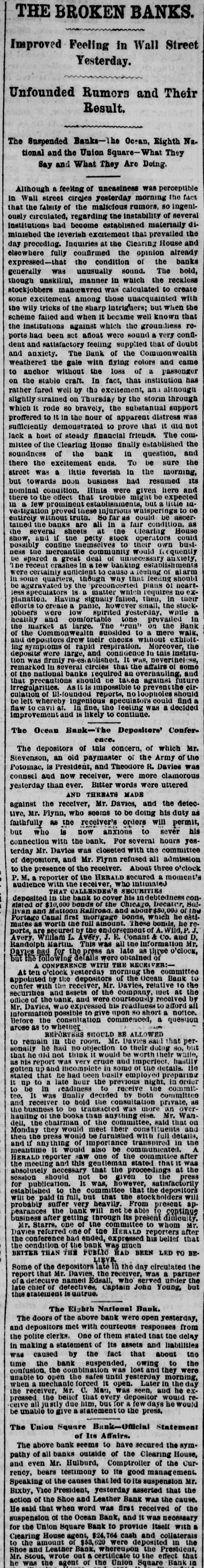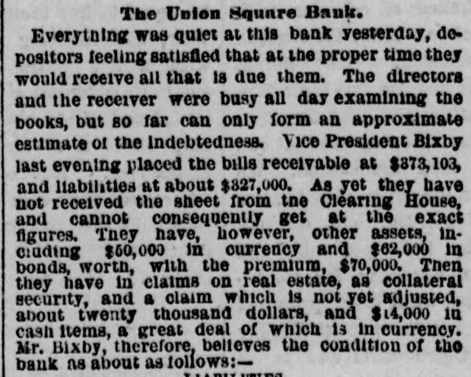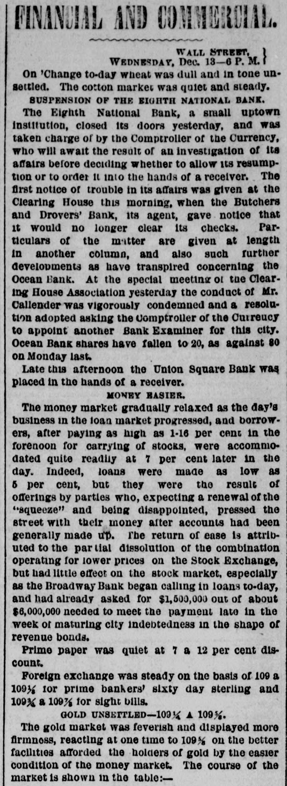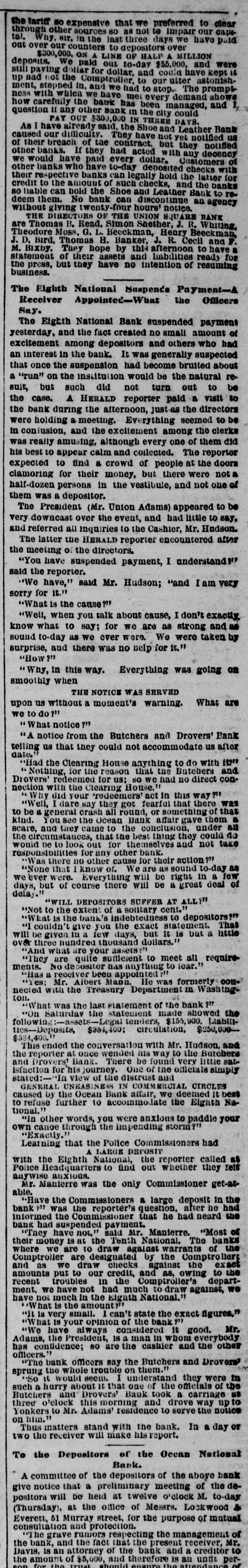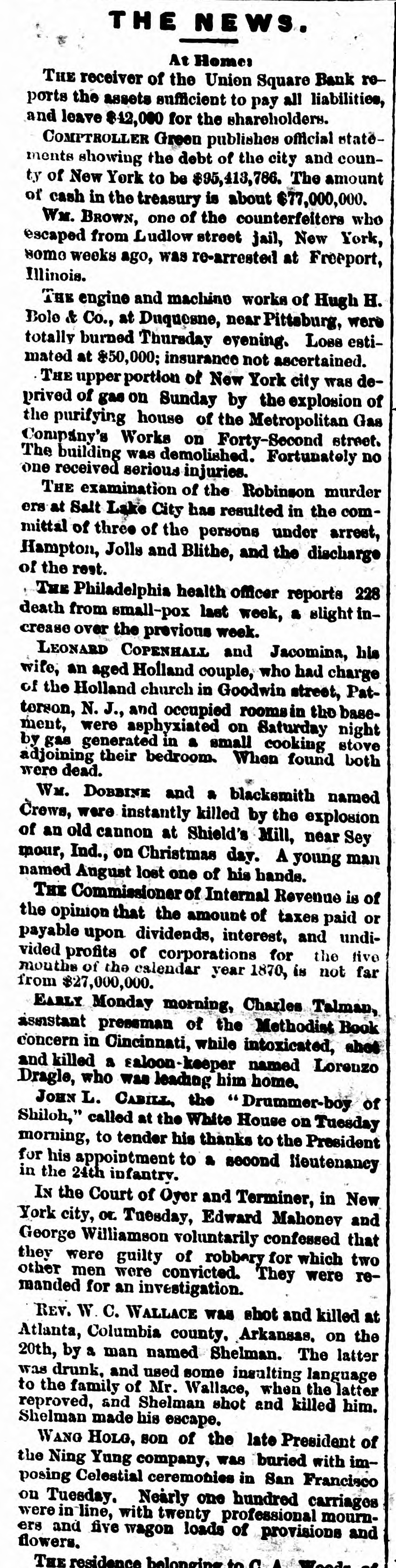 NEW YORK. VARIOUS MATTERS. NEW YORK, Dee. 12.-It is rumored that the Union Square Bank has suspended. John Hartley and Frederick Salle, merchants three this city, were arrested with nearly which of thousand yards of silk in their possession, they smuggled from Canada into Michigan. W. The failures of the cotton firms of P. Wright & Co. of Leaycroft, consequent upon the lock-up of money are announced. It is stated that both Tweed and Cornelius directCarson, both members of the Ring, were of the Ocean Bank, which has materially bank injured ors its credit of late. Callender, the and examiner states that its assets are ample Davis is that it will pay its liabilities. S. G. receiver. deputation of internationals waited relation on the Police A Commissioners this forenoon in was no to parade next Sunday, but as there evequorum, a an answer was deferred till this ning. Garroters commenced their winter campaign and in Brooklyn last night, nearly murdering robbing a citizen. TRIAL OF COUNTERFRITERS. In the trial of Miner, the counterfeiter, counter- toCole swore to numerous sales of which, day, feit money made to him by miner,one of 10's, in June last, was of $24,000 in counterfeit sale which Cole gave Miner $1900. The Miner's took for place in Miner's house, where wife lay dead. TAMMANY ABROAD. The Times prints a letter from W. E. Dodge, abroad who is in Europe, giving the impression that the regarding American affairs. He says here, Tammany "ring" is as notorious there as punishif Tweed and his associates escape much of ment and our form of government will lose have causits abroad. The Erie scandals Ameripower loss of many millions in investing to reed can a securities, and he urges New Yorkers claim their city from disgrace. THE BUSY PETER B. The present management of the department recof public parks have discovered from the which ords that in the eighteen months during ComPeter B. Sweeney was President of the mission, $6,000,000 were squandered, being parks a million in excess of the total expended on during the thirteen years of the administration of Col. Stebbins. It is rumored that Sweeney is preparing be to leave the city and detectives are said to closely watching his movements. COTTON FAILURES. Another cotton failure, that of Schaefer & & is reported, amount unknown. Wright are Co., Co. place their liabilities at $39,000, and to settle at 50 per cent. The failures while are owing ready to the sudden advance in the price, dealers are hampered with contracts. The ruaffects the solvency of other firms, but as the staple was declining at the close to-day it in is hoped the worst is over. The appreciation under a value is owing to a rise in Liverpool scant supply and fears of a short crop. RUMORS DENIED. The rumor of the suspension of Union Square Bank is unfounded. The officers deny any em- fact barrassment. The report originated in of clearances made through the Ocean Bank.The officers of the latter bank deny that Tweed is one of the directors. The clearing house statement shows liabilities on last Saturday to be $2,258,900. The proper legal reserve is $564, 725, against which the bank held only $330,000 legal tenders. THE PARADE OF THE INTERNATIONALS. It is generally believed that the police commissioners adhere to their former decision regarding the internationalists parade, and that the Governor refuse to interfere. ATTEMPT TO ROB A BANK. There was a daring unsuccessful attempt to rob the Ferry street Savings's Bank this forenoon by the noted Dutch Henrichs and Alex Mason. The latter is of Baltimore. The thieves escaped. SMALL POX. There have been 62 new cases of small pox since Saturday and 7 deaths. MORE ABOUT THE SUNDAY PARADE. The committee of internationalists waited on the police commissioners this afternoon to ask permission to parade on next Sunday in honor of Rossel. Mayor Hall, by virtue of his office, a member of the board, was not present, but communication saying internationalists at a sent glad a to meet the that he meeting. would en- be This suggestion the committee declined to tertain. The commissioners refused permission for the demonstration without giving any explanation. A committee of internationists leave for Albany to-night to wait on Gov. Hoffman. AS BAD AS TAMMANY. At the Rdpublican primary to-night in the 3d Assembly district, two of Foley's men attempted to vote in the names of two colored men. Being challenged they insisted on depositing the vote and two lines of voters were formed and blows exchanged. A number of the 10th werd men rushed in with the intention of breaking up the election and the police cleared the hall and carried ofi the boxes to headquarters. IRREGULAR LAWYERS. The bar association to-night appointed a committee to prefer charges in the Supreme Court against Morgan and Hannahan, attorneys, for irregular conduct in the Superior Court. NEBRASKA. A TERRIBLE AFFAIR-SEVENTEEN PERSONS FROZEN TO DEATH. ST. LOUIS, Dec. 12.-A gentleman who arrived in Kansas City on Saturday informed the Times that on the Sunday previous a terrible affair occurred in Saline county, Nebraska. A of emigrants were passing through the when the they concluded to camp. were creasing, county party westward cold constantly They inon-a piece of high prairie, several miles from any house, but three miles from them was of timber land. After unhitching their the men started to procure piece teams fuel. Not left the refor several hours the women and started to hunt up. children turning them who The next day the bodies of seventeen persons perished from the intense cold were found. The children left in the wagons were the only survivors.