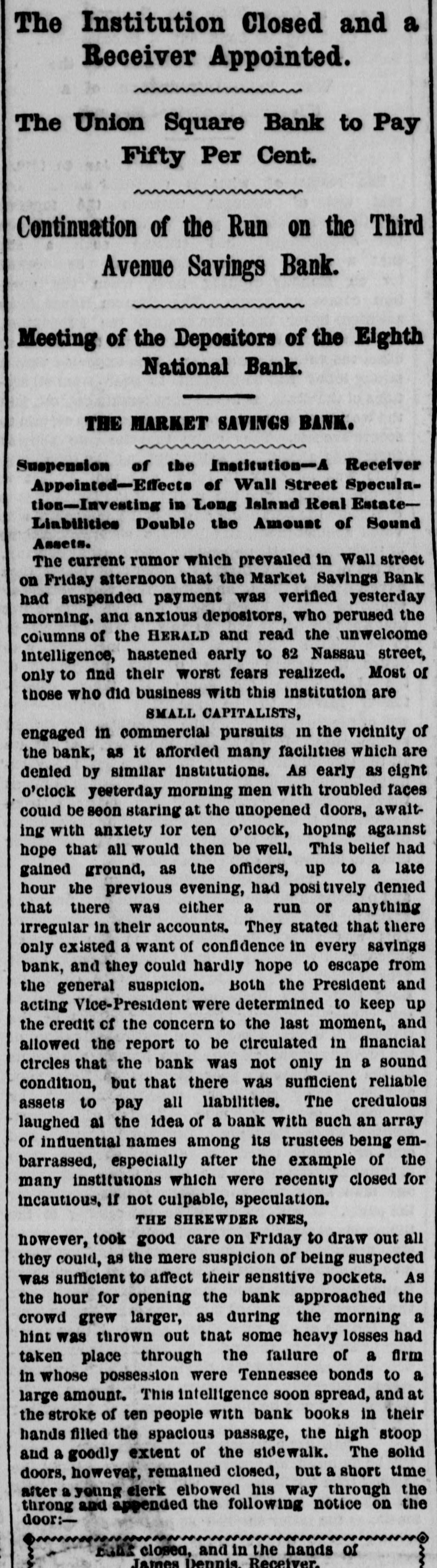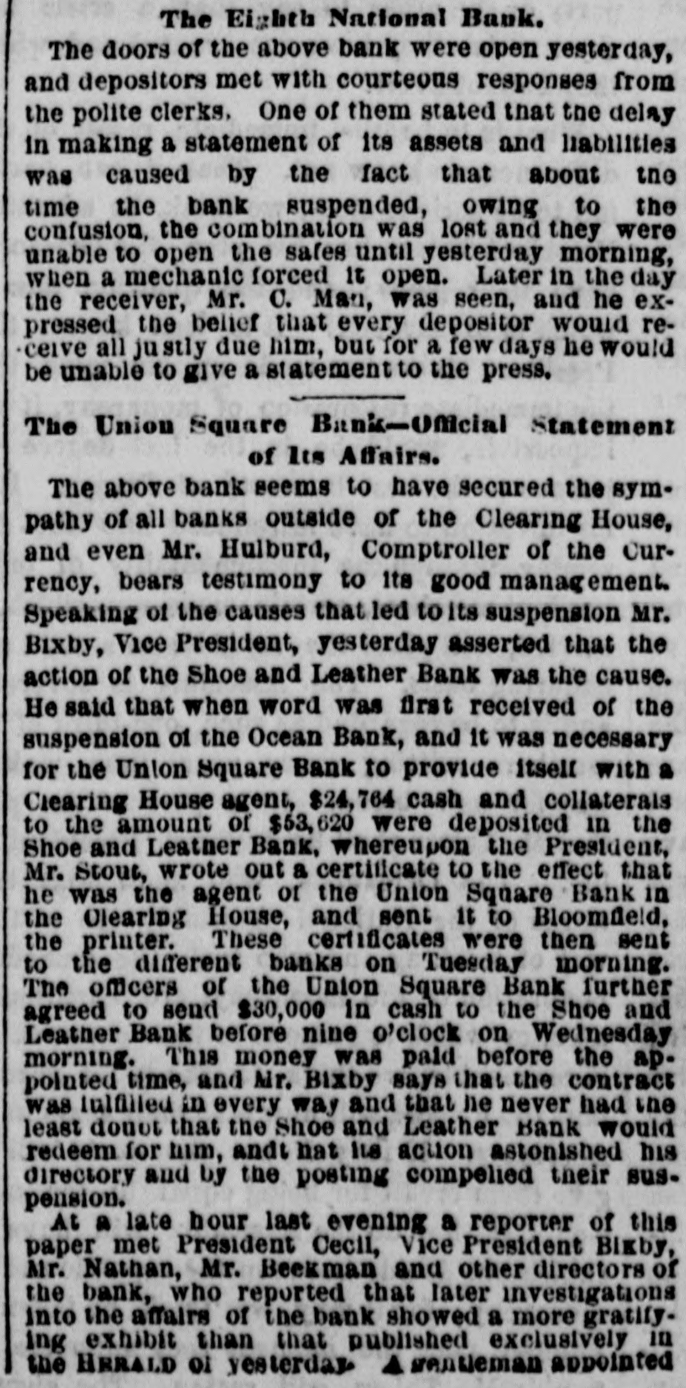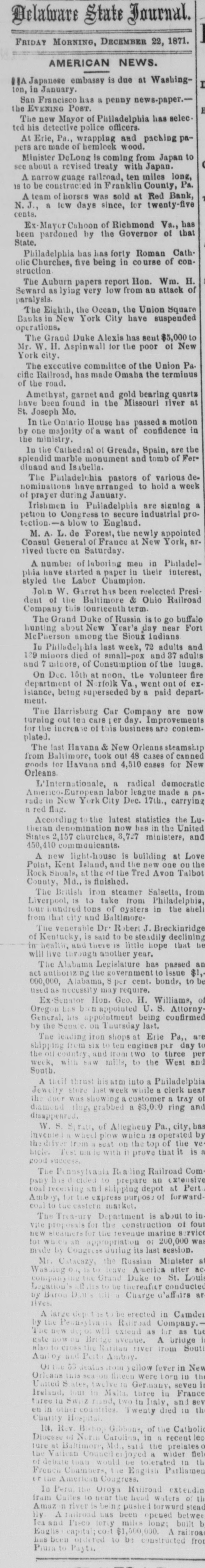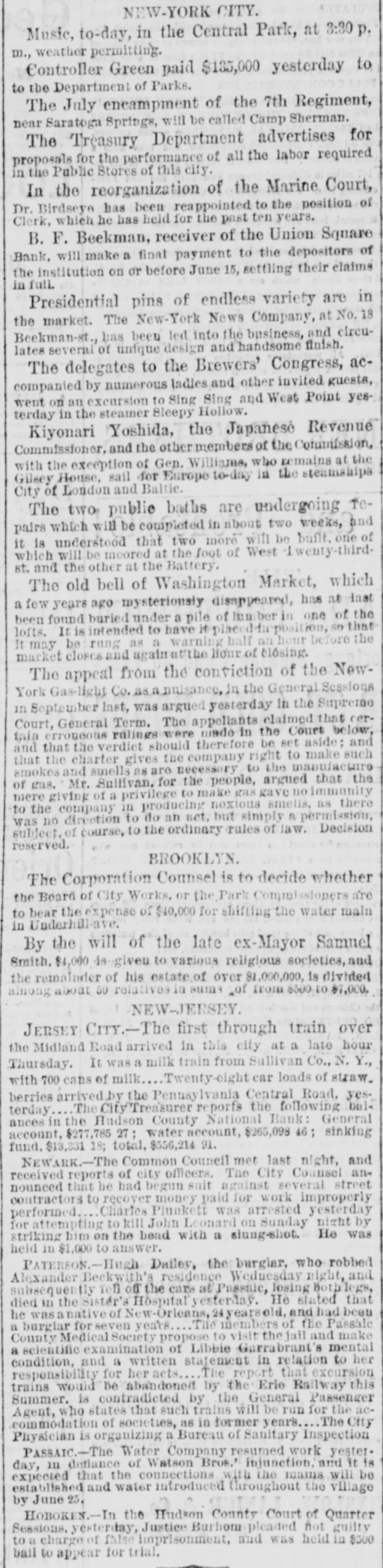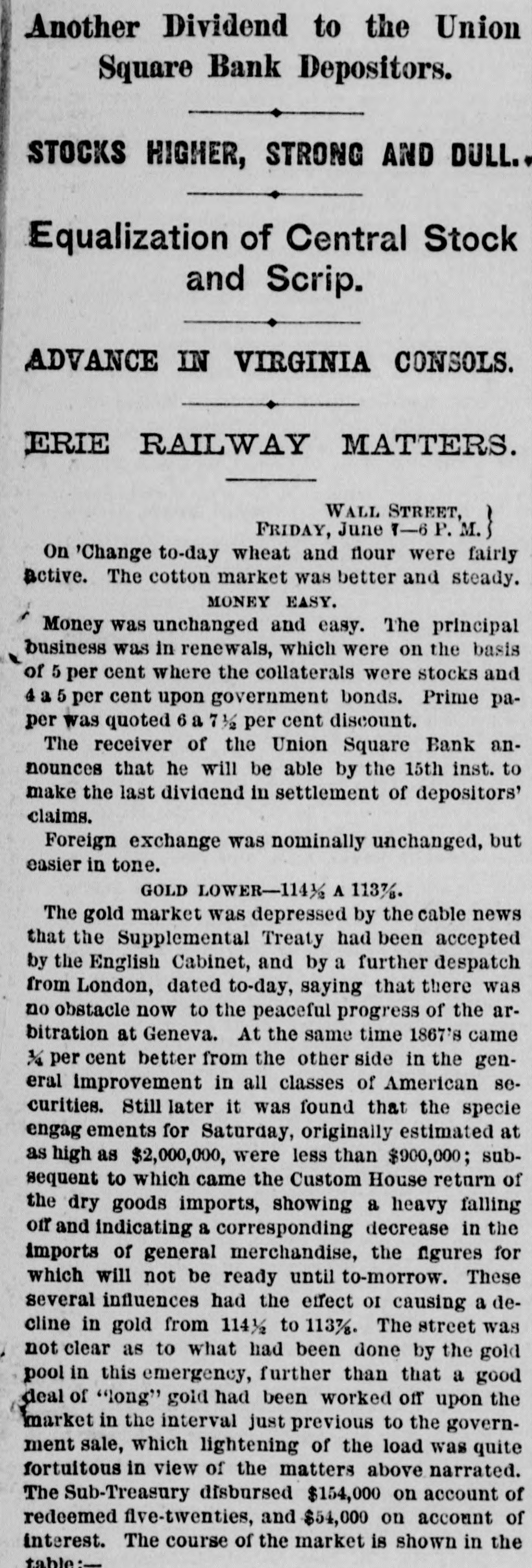 NEW YORK. VARIOUS MATTERS. NEW YORK, Dee. 12.-It is rumored that the Union Square Bank has suspended. John Hartley and Frederick Salle, merchants three this city, were arrested with nearly which of thousand yards of silk in their possession, they smuggled from Canada into Michigan. W. The failures of the cotton firms of P. Wright & Co. of Leaycroft, consequent upon the lock-up of money are announced. It is stated that both Tweed and Cornelius directCarson, both members of the Ring, were of the Ocean Bank, which has materially bank injured ors its credit of late. Callender, the and examiner states that its assets are ample Davis is that it will pay its liabilities. S. G. receiver. deputation of internationals waited relation on the Police A Commissioners this forenoon in was no to parade next Sunday, but as there evequorum, a an answer was deferred till this ning. Garroters commenced their winter campaign and in Brooklyn last night, nearly murdering robbing a citizen. TRIAL OF COUNTERFRITERS. In the trial of Miner, the counterfeiter, counter- toCole swore to numerous sales of which, day, feit money made to him by miner,one of 10's, in June last, was of $24,000 in counterfeit sale which Cole gave Miner $1900. The Miner's took for place in Miner's house, where wife lay dead. TAMMANY ABROAD. The Times prints a letter from W. E. Dodge, abroad who is in Europe, giving the impression that the regarding American affairs. He says here, Tammany "ring" is as notorious there as punishif Tweed and his associates escape much of ment and our form of government will lose have causits abroad. The Erie scandals Ameripower loss of many millions in investing to reed can a securities, and he urges New Yorkers claim their city from disgrace. THE BUSY PETER B. The present management of the department recof public parks have discovered from the which ords that in the eighteen months during ComPeter B. Sweeney was President of the mission, $6,000,000 were squandered, being parks a million in excess of the total expended on during the thirteen years of the administration of Col. Stebbins. It is rumored that Sweeney is preparing be to leave the city and detectives are said to closely watching his movements. COTTON FAILURES. Another cotton failure, that of Schaefer & & is reported, amount unknown. Wright are Co., Co. place their liabilities at $39,000, and to settle at 50 per cent. The failures while are owing ready to the sudden advance in the price, dealers are hampered with contracts. The ruaffects the solvency of other firms, but as the staple was declining at the close to-day it in is hoped the worst is over. The appreciation under a value is owing to a rise in Liverpool scant supply and fears of a short crop. RUMORS DENIED. The rumor of the suspension of Union Square Bank is unfounded. The officers deny any em- fact barrassment. The report originated in of clearances made through the Ocean Bank.The officers of the latter bank deny that Tweed is one of the directors. The clearing house statement shows liabilities on last Saturday to be $2,258,900. The proper legal reserve is $564, 725, against which the bank held only $330,000 legal tenders. THE PARADE OF THE INTERNATIONALS. It is generally believed that the police commissioners adhere to their former decision regarding the internationalists parade, and that the Governor refuse to interfere. ATTEMPT TO ROB A BANK. There was a daring unsuccessful attempt to rob the Ferry street Savings's Bank this forenoon by the noted Dutch Henrichs and Alex Mason. The latter is of Baltimore. The thieves escaped. SMALL POX. There have been 62 new cases of small pox since Saturday and 7 deaths. MORE ABOUT THE SUNDAY PARADE. The committee of internationalists waited on the police commissioners this afternoon to ask permission to parade on next Sunday in honor of Rossel. Mayor Hall, by virtue of his office, a member of the board, was not present, but communication saying internationalists at a sent glad a to meet the that he meeting. would en- be This suggestion the committee declined to tertain. The commissioners refused permission for the demonstration without giving any explanation. A committee of internationists leave for Albany to-night to wait on Gov. Hoffman. AS BAD AS TAMMANY. At the Rdpublican primary to-night in the 3d Assembly district, two of Foley's men attempted to vote in the names of two colored men. Being challenged they insisted on depositing the vote and two lines of voters were formed and blows exchanged. A number of the 10th werd men rushed in with the intention of breaking up the election and the police cleared the hall and carried ofi the boxes to headquarters. IRREGULAR LAWYERS. The bar association to-night appointed a committee to prefer charges in the Supreme Court against Morgan and Hannahan, attorneys, for irregular conduct in the Superior Court. NEBRASKA. A TERRIBLE AFFAIR-SEVENTEEN PERSONS FROZEN TO DEATH. ST. LOUIS, Dec. 12.-A gentleman who arrived in Kansas City on Saturday informed the Times that on the Sunday previous a terrible affair occurred in Saline county, Nebraska. A of emigrants were passing through the when the they concluded to camp. were creasing, county party westward cold constantly They inon-a piece of high prairie, several miles from any house, but three miles from them was of timber land. After unhitching their the men started to procure piece teams fuel. Not left the refor several hours the women and started to hunt up. children turning them who The next day the bodies of seventeen persons perished from the intense cold were found. The children left in the wagons were the only survivors.