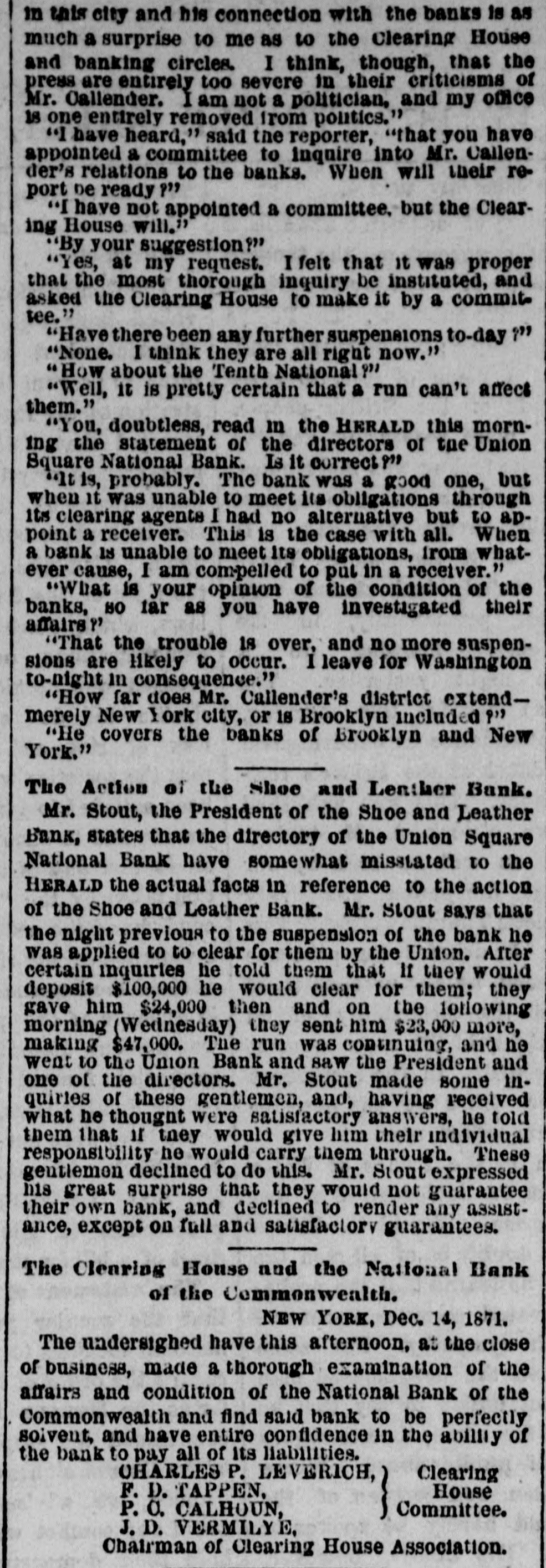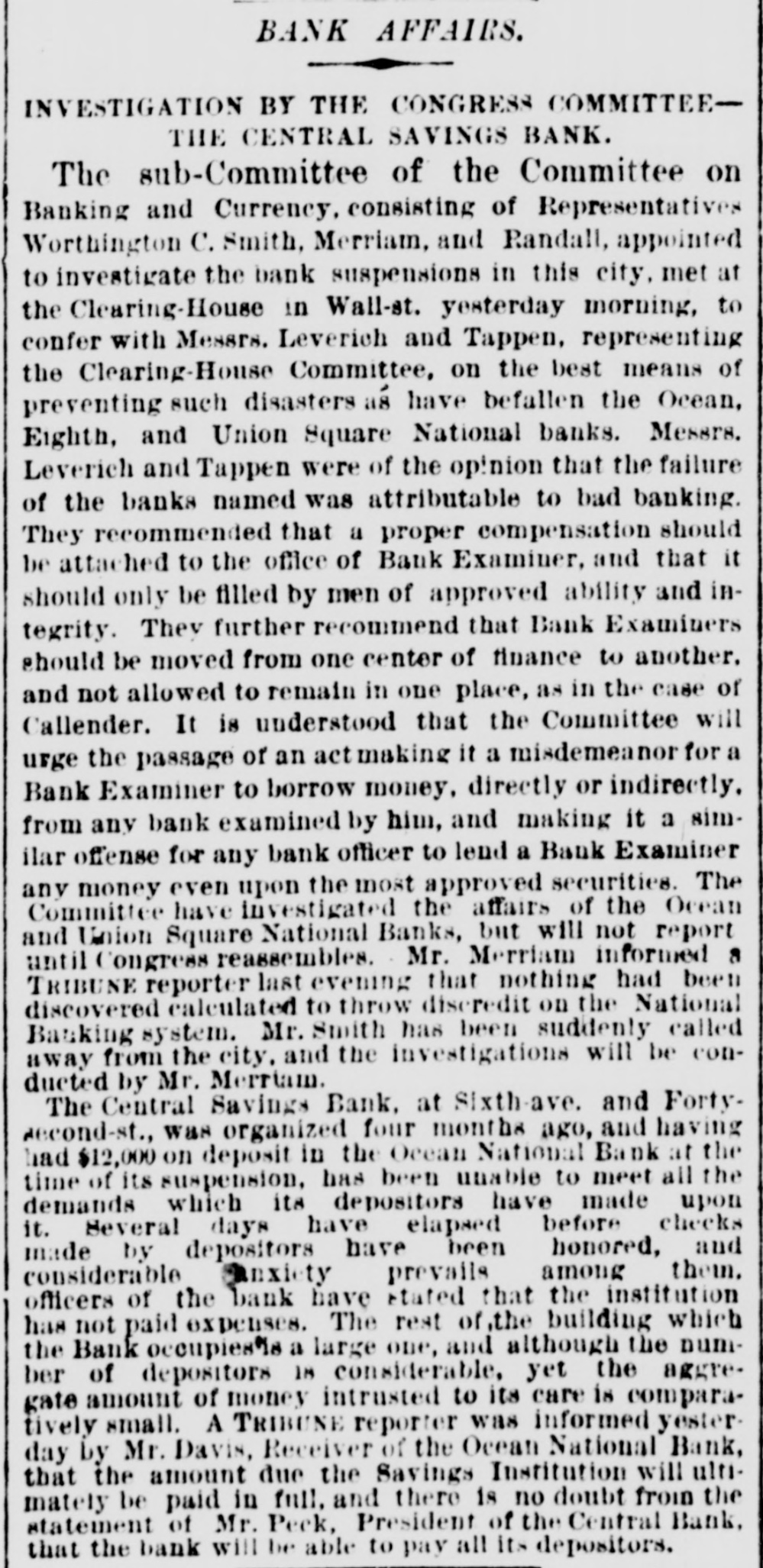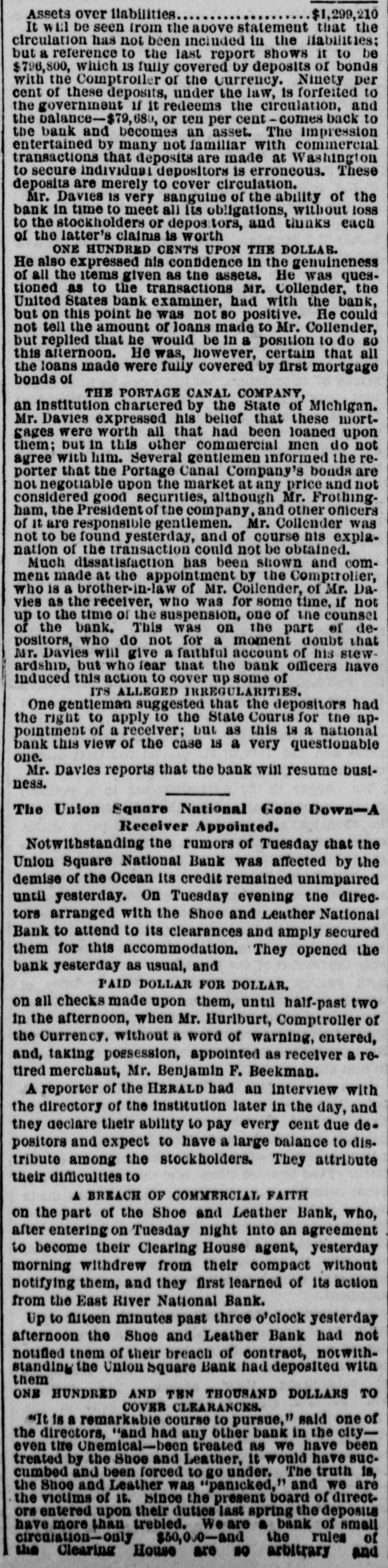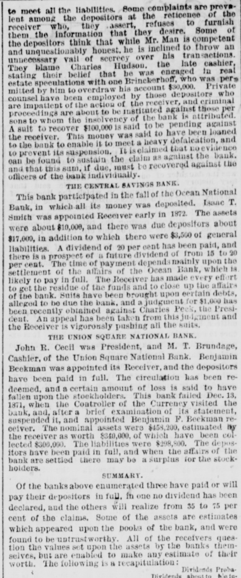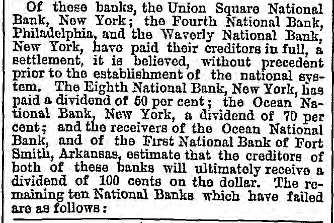 curity, or as collateral security, for any loan of money, or for a consideration shall agreeAto withhold the same from use, or shall offer or receive the custod or promise of custody of such notes as security, or as collateral security or consideration, for any lloan of money." 5th of April last the Controller was advised that bank On the in the City of New-York, with a capital of $1,000,000, a and whose average exchanges at the Clearinghouse did not exceed $300,000, was that morning creditor at the Clearing-house for $4,770,000. A8 it was evident that this large credit was not the result of legitimate business, the examiner was directed to make an exam ination of the bank, which was immediately done, 114 connection with a member of the Clearing-house committee. From the examination, which was thoroughly and carefully conducted, it appeared that deposits had been made in that bank, by one individual, upon the morning of April 5 to the amount of $4,100,000, the whole of which was drawn out upon the same day, upon the checks of the depositor, in legal-tender notes. The president of the bank denied that the bank had any interest in these trans actions, and there was no evidence of any loan, or of ad. vances in any shape. upon these deposits. These traus actions were the subject, subsequently, of an investiga tion by the Bank Committee of the House of Represent tarives, and, although it was clear that the spirit of the law had been violated, no evidence could be obtained to warrant the commencement of a suit for the recovery of the penalty prescribed in the act referred to. The in vestigation undoubtedly had the effect to prevent the repetition of similar transactions; no offenses of this been kind, on the part of any national bank, having since brought to the attention of the Controller. The New-York Clearing house Association subse quently passed a resolution declaring "that the Clearinghouse Committee be and is hereby directed, whenever it appears, in its judgment, that legal-tender notes have been withdrawn from use through the agency of any bank, members of the association, to make an immediate examination of the bank in question, and should there appear to be complicity on the part of the bank or its officials, to suspend said bank from the Clearing house until action of the association shall be taken there on." The withdrawal of currency for illegitimate purposes has, however, since been accomplished without the assistance of the banks. The rigid enforcement of the resolution of the Clearing-house will prevent complicity on the part of banks in such transactions; and it the New-York Stock Board and the leading banking houses will unite with the Clearing-house, and refuse to transact business with unserupulous men. who do not hesitate to embarrass legitimate business for the parpose of increasing or diminishing the values of stocks or bonds in which they are temporarily interested, they can do more to prevent such operations team any Congress enactment. INSOLVENT BANKS. Twenty-one national banks, organized in 11 different States, with an aggregate capital of $1,236,100, have failed since the organization of the system in 1863 The total circulation of these banks was $2,942,793. of which $2,441,430 has been redeemed in full, leaving a belance still outstanding of $501,363, which will also be redeemed, upon presentation to the Treasurer of the United States, from the avails of United States bonds held as security for that purpose. Of these banks, five have been finally closed (two during the past year), baying paid dividends to their ereditors. Six national banks have fatted during the past year. New-York: Of these, the Union Square National Bank, the Fourth National Bank, Philadelphia, and the Waverley National Bank, New-York, have paid their creditors in full-a settlement, it is believed, without a precedent prior to the establishment of the national system. The Eighth National Bank, New-York, has paid dividend of 50 per cent; the Ocean National Bank, New-York, a dividend of 70 per cent; and the receiver of the Ocean National Bank, and of the First National Bank of Fort Smith, Ark., estimate that the creditors of both these banks will últimately receive a dividend of 100 cents on the dollar. The Venango National Bank of Franklin, Penn.: the Merchants' National Bank of Washington. D. C. the First National Bank of Selma, Ala., and the First National Bank of New-Orleans, were United States depositories. e-final dividend in favor of the creditors of the First National Bank of Vicksburg has been unexpectedly delayed by the recent presentation of a claim of the United States for money alleged to have been illegally deposited by the Collector of Internal Revenue of that district, in the year 1868. Since that time no lesses have occurred to the Government by deposits made in the national banks, although many millions of dollars have been continually on deposit with banks which are designated as depositories. The three a first-named banks, at the time of their failure, had large amount of Government funds on deposit. SURPLUS AND SPECIE-EXTENDING THE LIMIT OF SURPLUS. The law requires that every national bank shall carry one-tenth part of its profits to surplus-fund account before the declaration of a dividend, until the same shall amount to 20 per cent of its capital stock. This wise provision has been generally observed. and the returns show that the banks now have a surplus of more than $100,000,000, and considerably more than onefifth of their capital in surplus account. The act also limits the liabilities of any association, person, com pany, or corporation, for money borrowed, to one-tenth of the capital stock paid in. The Controller recommends that this limit be extended to one-tenth of the capital and surplu. which will have a tendency to 10. crease the surplus fund beyond the limit required by the law. The following table will exhibit the aggregate amount of specie held by the national