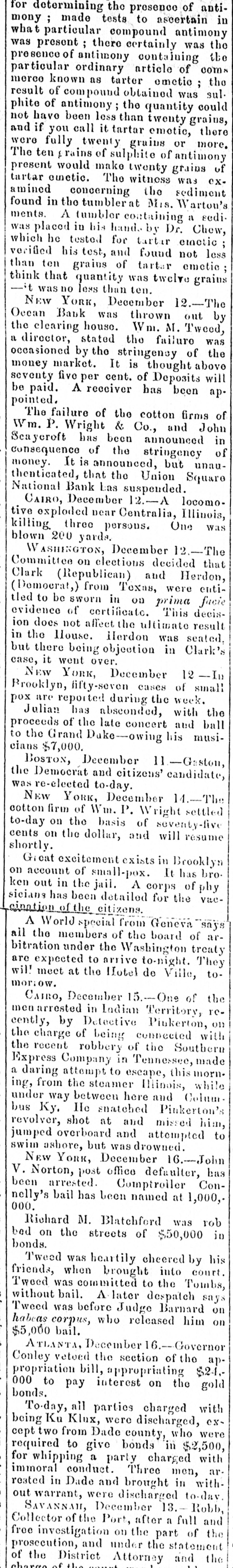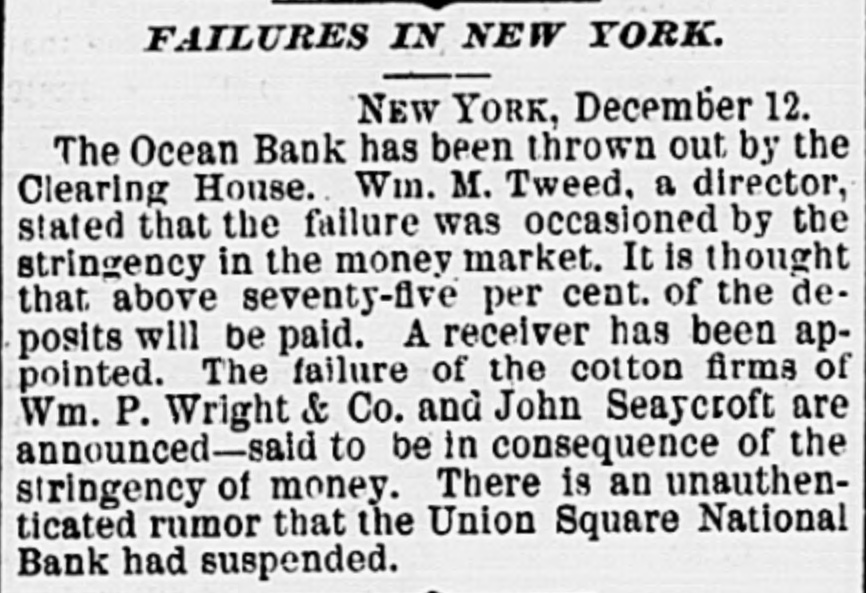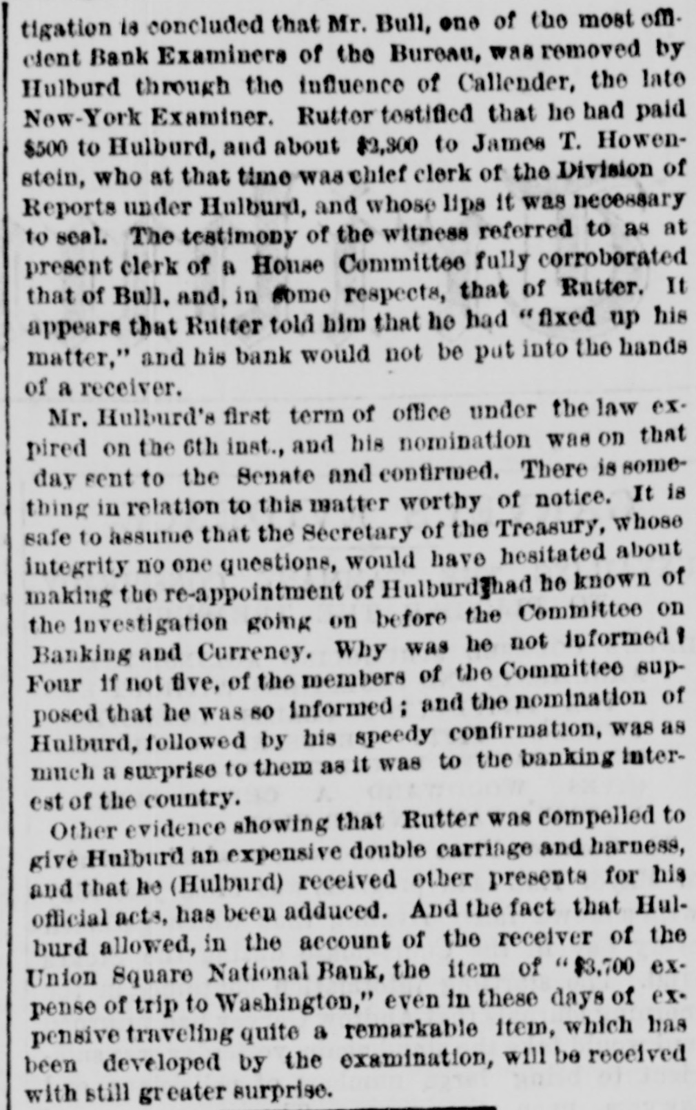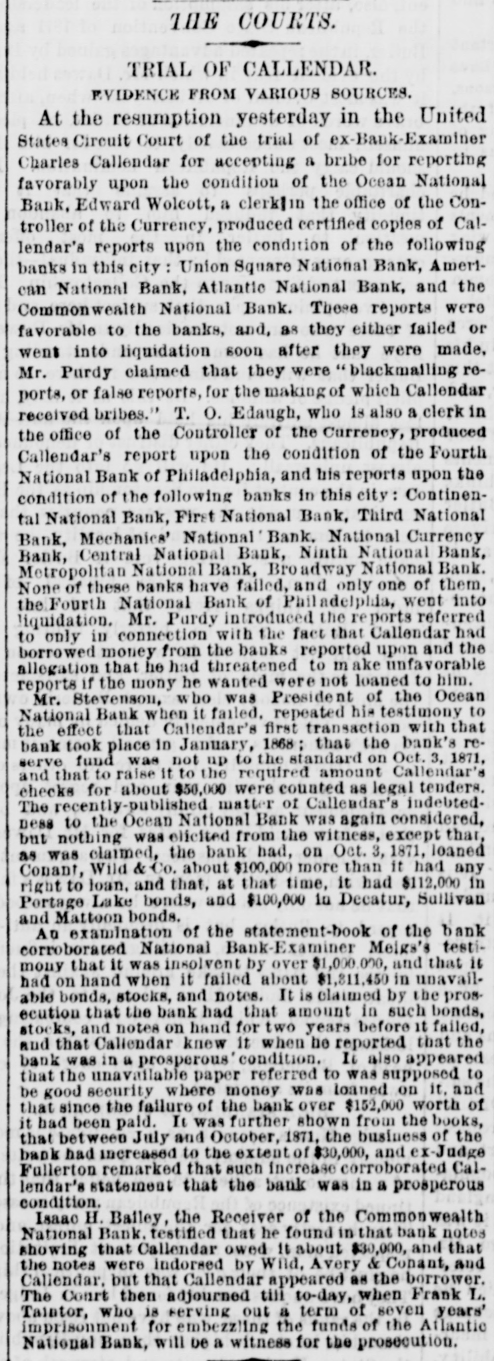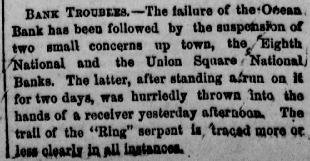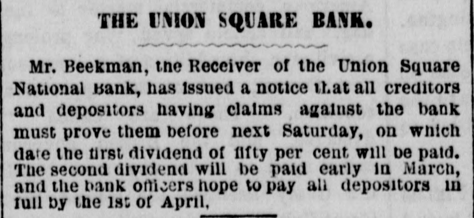 curity, or as collateral security, for any loan of money, or for a consideration shall agreeAto withhold the same from use, or shall offer or receive the custod or promise of custody of such notes as security, or as collateral security or consideration, for any lloan of money." 5th of April last the Controller was advised that bank On the in the City of New-York, with a capital of $1,000,000, a and whose average exchanges at the Clearinghouse did not exceed $300,000, was that morning creditor at the Clearing-house for $4,770,000. A8 it was evident that this large credit was not the result of legitimate business, the examiner was directed to make an exam ination of the bank, which was immediately done, 114 connection with a member of the Clearing-house committee. From the examination, which was thoroughly and carefully conducted, it appeared that deposits had been made in that bank, by one individual, upon the morning of April 5 to the amount of $4,100,000, the whole of which was drawn out upon the same day, upon the checks of the depositor, in legal-tender notes. The president of the bank denied that the bank had any interest in these trans actions, and there was no evidence of any loan, or of ad. vances in any shape. upon these deposits. These traus actions were the subject, subsequently, of an investiga tion by the Bank Committee of the House of Represent tarives, and, although it was clear that the spirit of the law had been violated, no evidence could be obtained to warrant the commencement of a suit for the recovery of the penalty prescribed in the act referred to. The in vestigation undoubtedly had the effect to prevent the repetition of similar transactions; no offenses of this been kind, on the part of any national bank, having since brought to the attention of the Controller. The New-York Clearing house Association subse quently passed a resolution declaring "that the Clearinghouse Committee be and is hereby directed, whenever it appears, in its judgment, that legal-tender notes have been withdrawn from use through the agency of any bank, members of the association, to make an immediate examination of the bank in question, and should there appear to be complicity on the part of the bank or its officials, to suspend said bank from the Clearing house until action of the association shall be taken there on." The withdrawal of currency for illegitimate purposes has, however, since been accomplished without the assistance of the banks. The rigid enforcement of the resolution of the Clearing-house will prevent complicity on the part of banks in such transactions; and it the New-York Stock Board and the leading banking houses will unite with the Clearing-house, and refuse to transact business with unserupulous men. who do not hesitate to embarrass legitimate business for the parpose of increasing or diminishing the values of stocks or bonds in which they are temporarily interested, they can do more to prevent such operations team any Congress enactment. INSOLVENT BANKS. Twenty-one national banks, organized in 11 different States, with an aggregate capital of $1,236,100, have failed since the organization of the system in 1863 The total circulation of these banks was $2,942,793. of which $2,441,430 has been redeemed in full, leaving a belance still outstanding of $501,363, which will also be redeemed, upon presentation to the Treasurer of the United States, from the avails of United States bonds held as security for that purpose. Of these banks, five have been finally closed (two during the past year), baying paid dividends to their ereditors. Six national banks have fatted during the past year. New-York: Of these, the Union Square National Bank, the Fourth National Bank, Philadelphia, and the Waverley National Bank, New-York, have paid their creditors in full-a settlement, it is believed, without a precedent prior to the establishment of the national system. The Eighth National Bank, New-York, has paid dividend of 50 per cent; the Ocean National Bank, New-York, a dividend of 70 per cent; and the receiver of the Ocean National Bank, and of the First National Bank of Fort Smith, Ark., estimate that the creditors of both these banks will últimately receive a dividend of 100 cents on the dollar. The Venango National Bank of Franklin, Penn.: the Merchants' National Bank of Washington. D. C. the First National Bank of Selma, Ala., and the First National Bank of New-Orleans, were United States depositories. e-final dividend in favor of the creditors of the First National Bank of Vicksburg has been unexpectedly delayed by the recent presentation of a claim of the United States for money alleged to have been illegally deposited by the Collector of Internal Revenue of that district, in the year 1868. Since that time no lesses have occurred to the Government by deposits made in the national banks, although many millions of dollars have been continually on deposit with banks which are designated as depositories. The three a first-named banks, at the time of their failure, had large amount of Government funds on deposit. SURPLUS AND SPECIE-EXTENDING THE LIMIT OF SURPLUS. The law requires that every national bank shall carry one-tenth part of its profits to surplus-fund account before the declaration of a dividend, until the same shall amount to 20 per cent of its capital stock. This wise provision has been generally observed. and the returns show that the banks now have a surplus of more than $100,000,000, and considerably more than onefifth of their capital in surplus account. The act also limits the liabilities of any association, person, com pany, or corporation, for money borrowed, to one-tenth of the capital stock paid in. The Controller recommends that this limit be extended to one-tenth of the capital and surplu. which will have a tendency to 10. crease the surplus fund beyond the limit required by the law. The following table will exhibit the aggregate amount of specie held by the national