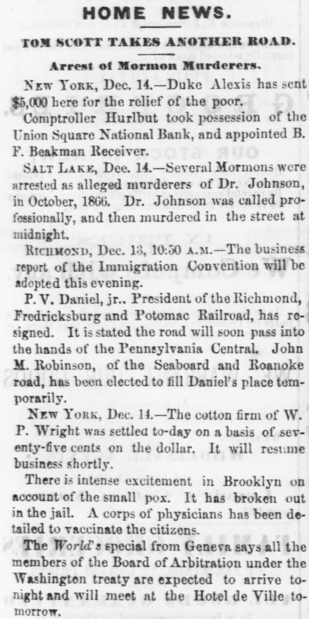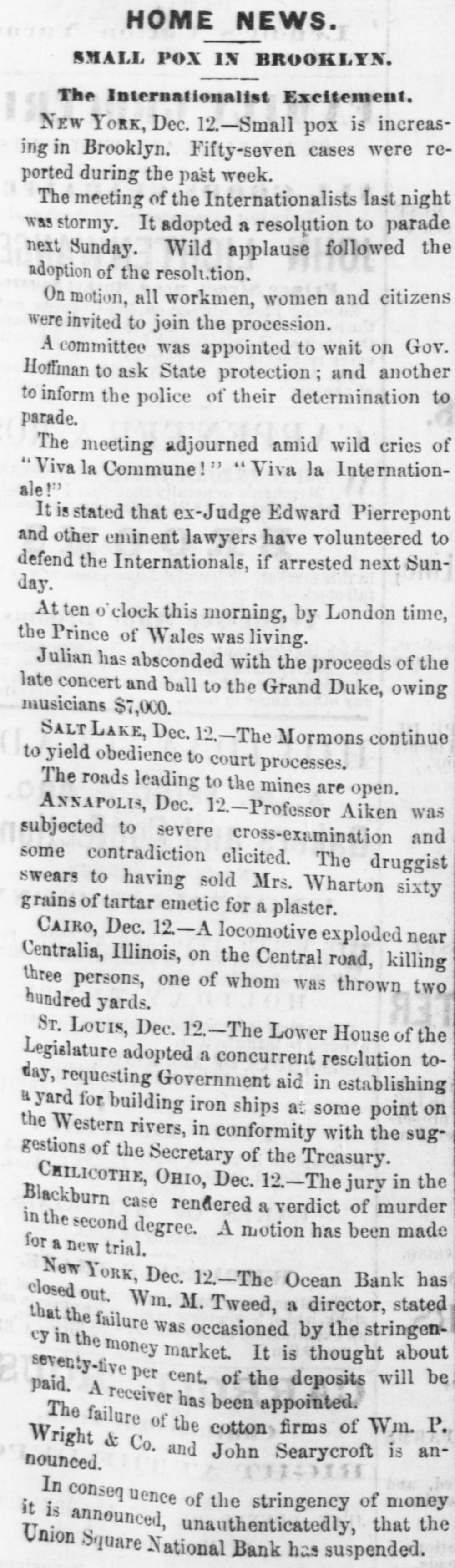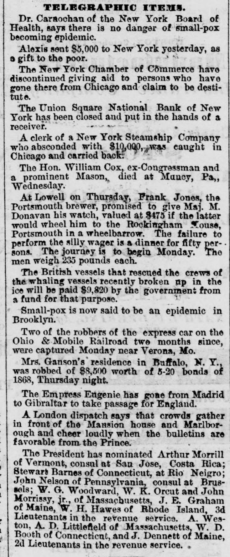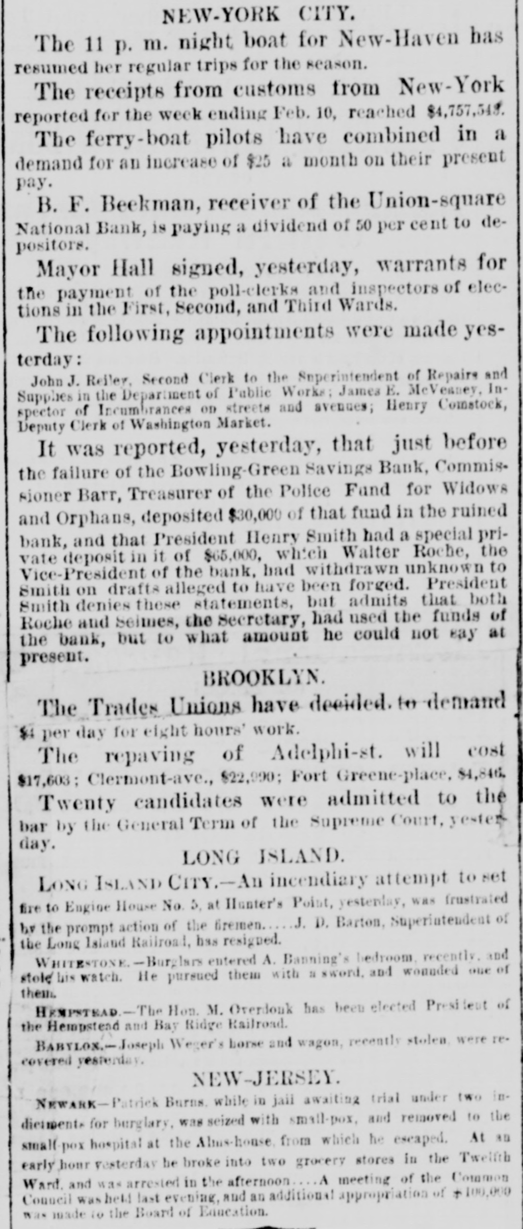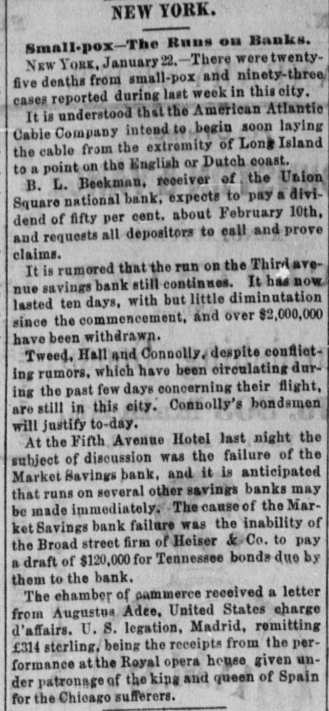 curity, or as collateral security, for any loan of money, or for a consideration shall agreeAto withhold the same from use, or shall offer or receive the custod or promise of custody of such notes as security, or as collateral security or consideration, for any lloan of money." 5th of April last the Controller was advised that bank On the in the City of New-York, with a capital of $1,000,000, a and whose average exchanges at the Clearinghouse did not exceed $300,000, was that morning creditor at the Clearing-house for $4,770,000. A8 it was evident that this large credit was not the result of legitimate business, the examiner was directed to make an exam ination of the bank, which was immediately done, 114 connection with a member of the Clearing-house committee. From the examination, which was thoroughly and carefully conducted, it appeared that deposits had been made in that bank, by one individual, upon the morning of April 5 to the amount of $4,100,000, the whole of which was drawn out upon the same day, upon the checks of the depositor, in legal-tender notes. The president of the bank denied that the bank had any interest in these trans actions, and there was no evidence of any loan, or of ad. vances in any shape. upon these deposits. These traus actions were the subject, subsequently, of an investiga tion by the Bank Committee of the House of Represent tarives, and, although it was clear that the spirit of the law had been violated, no evidence could be obtained to warrant the commencement of a suit for the recovery of the penalty prescribed in the act referred to. The in vestigation undoubtedly had the effect to prevent the repetition of similar transactions; no offenses of this been kind, on the part of any national bank, having since brought to the attention of the Controller. The New-York Clearing house Association subse quently passed a resolution declaring "that the Clearinghouse Committee be and is hereby directed, whenever it appears, in its judgment, that legal-tender notes have been withdrawn from use through the agency of any bank, members of the association, to make an immediate examination of the bank in question, and should there appear to be complicity on the part of the bank or its officials, to suspend said bank from the Clearing house until action of the association shall be taken there on." The withdrawal of currency for illegitimate purposes has, however, since been accomplished without the assistance of the banks. The rigid enforcement of the resolution of the Clearing-house will prevent complicity on the part of banks in such transactions; and it the New-York Stock Board and the leading banking houses will unite with the Clearing-house, and refuse to transact business with unserupulous men. who do not hesitate to embarrass legitimate business for the parpose of increasing or diminishing the values of stocks or bonds in which they are temporarily interested, they can do more to prevent such operations team any Congress enactment. INSOLVENT BANKS. Twenty-one national banks, organized in 11 different States, with an aggregate capital of $1,236,100, have failed since the organization of the system in 1863 The total circulation of these banks was $2,942,793. of which $2,441,430 has been redeemed in full, leaving a belance still outstanding of $501,363, which will also be redeemed, upon presentation to the Treasurer of the United States, from the avails of United States bonds held as security for that purpose. Of these banks, five have been finally closed (two during the past year), baying paid dividends to their ereditors. Six national banks have fatted during the past year. New-York: Of these, the Union Square National Bank, the Fourth National Bank, Philadelphia, and the Waverley National Bank, New-York, have paid their creditors in full-a settlement, it is believed, without a precedent prior to the establishment of the national system. The Eighth National Bank, New-York, has paid dividend of 50 per cent; the Ocean National Bank, New-York, a dividend of 70 per cent; and the receiver of the Ocean National Bank, and of the First National Bank of Fort Smith, Ark., estimate that the creditors of both these banks will últimately receive a dividend of 100 cents on the dollar. The Venango National Bank of Franklin, Penn.: the Merchants' National Bank of Washington. D. C. the First National Bank of Selma, Ala., and the First National Bank of New-Orleans, were United States depositories. e-final dividend in favor of the creditors of the First National Bank of Vicksburg has been unexpectedly delayed by the recent presentation of a claim of the United States for money alleged to have been illegally deposited by the Collector of Internal Revenue of that district, in the year 1868. Since that time no lesses have occurred to the Government by deposits made in the national banks, although many millions of dollars have been continually on deposit with banks which are designated as depositories. The three a first-named banks, at the time of their failure, had large amount of Government funds on deposit. SURPLUS AND SPECIE-EXTENDING THE LIMIT OF SURPLUS. The law requires that every national bank shall carry one-tenth part of its profits to surplus-fund account before the declaration of a dividend, until the same shall amount to 20 per cent of its capital stock. This wise provision has been generally observed. and the returns show that the banks now have a surplus of more than $100,000,000, and considerably more than onefifth of their capital in surplus account. The act also limits the liabilities of any association, person, com pany, or corporation, for money borrowed, to one-tenth of the capital stock paid in. The Controller recommends that this limit be extended to one-tenth of the capital and surplu. which will have a tendency to 10. crease the surplus fund beyond the limit required by the law. The following table will exhibit the aggregate amount of specie held by the national