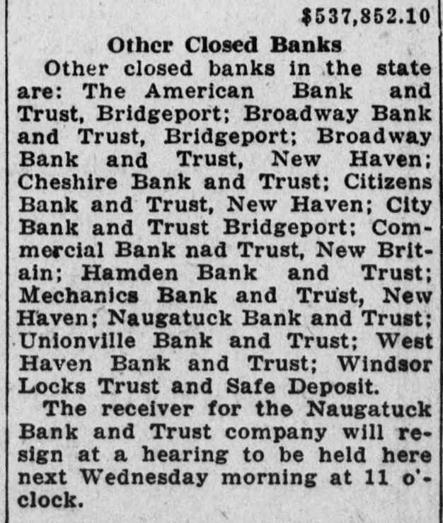 $537,852.10 Other Closed Banks Other closed banks in the state are: The American Bank and Trust, Bridgeport; Broadway Bank and Trust, Bridgeport; Broadway Bank and Trust, New Haven; Cheshire Bank and Trust; Citizens Bank and Trust, New Haven; City Bank and Trust Bridgeport: Commercial Bank nad Trust, New Britain; Hamden Bank and Trust; Mechanics Bank and Trust, New Haven; Naugatuck Bank and Trust; Unionville Bank and Trust; West Haven Bank and Trust; Windsor Locks Trust and Safe Deposit. The receiver for the Naugatuck Bank and Trust company will resign at a hearing to be held here next Wednesday morning at 11 o'clock.