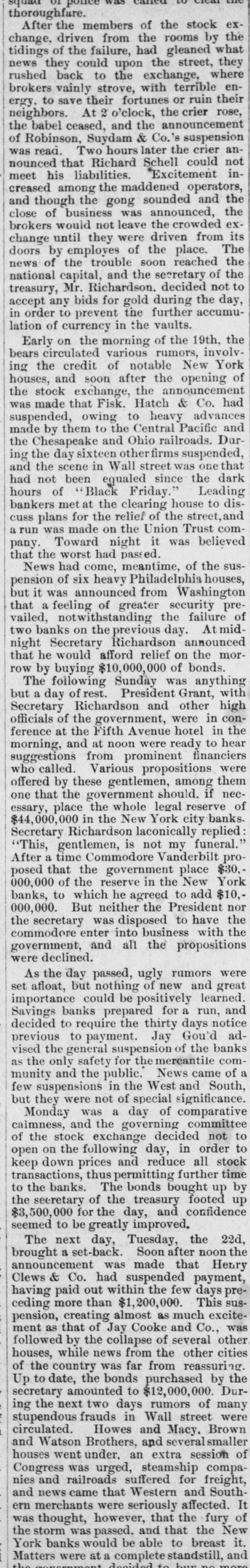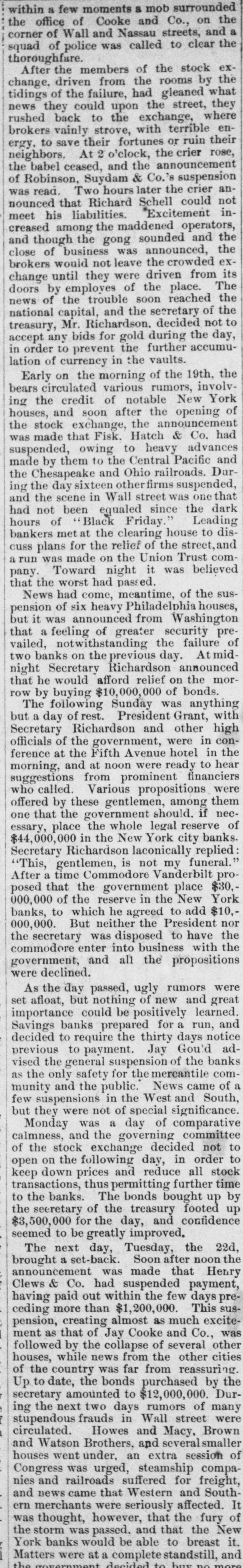 within a few moments a mob surrounded the office of Cooke and Co., on the corner of Wall and Nassau streets, and a squad of police was called to clear the thoroughfare. After the members of the stock exchange, driven from the rooms by the tidings of the failure, had gleaned what news they could upon the street, they rushed back to the exchange, where brokers vainly strove, with terrible energy, to save their fortunes or ruin their neighbors. At 2 o'clock, the crier rose, the babel ceased, and the announcement of Robinson, Suydam & Co.'s suspension was read. Two hours later the crier announced that Richard Schell could not meet his liabilities. Excitement increased among the maddened operators, and though the gong sounded and the close of business was announced, the brokers would not leave the crowded exchange until they were driven from its doors by employes of the place. The news of the trouble soon reached the national capital, and the secretary of the treasury, Mr. Richardson, decided not to accept any bids for gold during the day, in order to prevent the further accumulation of currency in the vaults. Early on the morning of the 19th, the bears circulated various rumors, involving the credit of notable New York houses, and soon after the opening of the stock exchange, the announcement was made that Fisk, Hatch & Co. had suspended, owing to heavy advances made by them to the Central Pacific and the Chesapeake and Ohio railroads. During the day sixteen other firms suspended, and the scene in Wall street was one that had not been equaled since the dark hours of "Black Friday." Leading bankers met at the clearing house to discuss plans for the relief of the street, and a run was made on the Union Trust company. Toward night it was believed that the worst had passed. News had come, meantime, of the suspension of six heavy Philadelphia houses, but it was announced from Washington that a feeling of greater security prevailed, notwithstanding the failure of two banks on the previous day. At midnight Secretary Richardson announced that he would afford relief on the morrow by buying $10,000,000 of bonds. The following Sunday was anything but a day of rest. President Grant, with Secretary Richardson and other high officials of the government, were in conference at the Fifth Avenue hotel in the morning, and at noon were ready to hear suggestions from prominent financiers who called. Various propositions were offered by these gentlemen, among them one that the government should, if necessary, place the whole legal reserve of $44,000,000 in the New York city banks. Secretary Richardson laconically replied: "This, gentlemen, is not my funeral." After a time Commodore Vanderbilt proposed that the government place $30,000,000 of the reserve in the New York banks, to which he agreed to add $10,000,000. But neither the President nor the secretary was disposed to have the commodore enter into business with the government, and all the propositions were declined. As the day passed, ugly rumors were set afloat, but nothing of new and great importance could be positively learned. Savings banks prepared for a run, and decided to require the thirty days notice previous to payment. Jay Gou'd advised the general suspension of the banks as the only safety for the mercantile community and the public. News came of a few suspensions in the West and South, but they were not of special significance. Monday was a day of comparative calmness, and the governing committee of the stock exchange decided not to open on the following day, in order to keep down prices and reduce all stock transactions, thus permitting further time to the banks. The bonds bought up by the secretary of the treasury footed up $3,500,000 for the day, and confidence seemed to be greatly improved. The next day, Tuesday, the 22d, brought a set-back. Soon after noon the announcement was made that Henry Clews & Co. had suspended payment, having paid out within the few days preceding more than $1,200,000. This suspension, creating almost as much excitement as that of Jay Cooke and Co., was followed by the collapse of several other houses, while news from the other cities of the country was far from reassuring. Up to date, the bonds purchased by the secretary amounted to $12,000,000. During the next two days rumors of many stupendous frauds in Wall street were circulated. Howes and Macy, Brown and Watson Brothers, and several smaller houses went under, an extra session of Congress was urged, steamship companies and railroads suffered for freight, and news came that Western and Southern merchants were seriously affected. It was thought, however, that the fury of the storm was passed, and that the New York banks would be able to breast it. Matters were at a complete standstill, and the government decided to buy no more