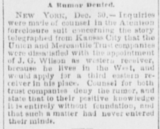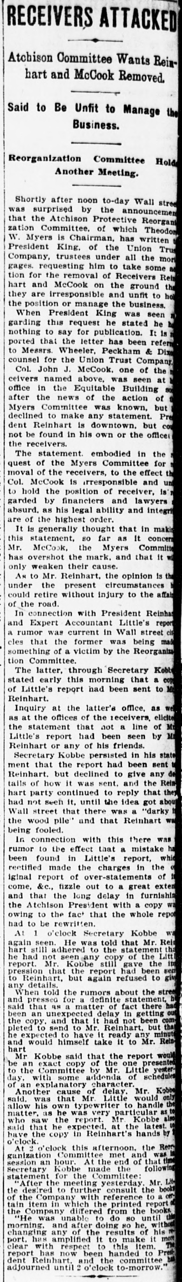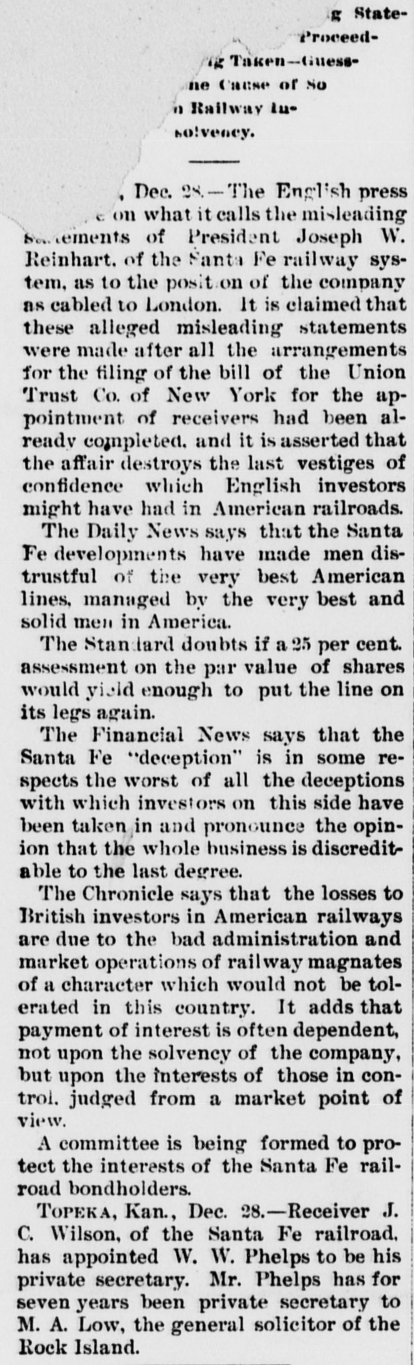g StateProceed12 Taken-Guessne Cause of No n Railway insolveney. , Dec. 28.- The English press on what it calls the misleading Sevements of President Joseph W. Reinhart. of the Santa Fe railway system, as to the position of the company as cabled to London. It is claimed that these alleged misleading statements were made after all the arrangements for the filing of the bill of the Union Trust Co. of New York for the appointment of receivers had been already completed. and it is asserted that the affair destroys the last vestiges of confidence which English investors might have had in American railroads. The Daily News says that the Santa Fe developments have made men distrustful of the very best American lines, managed by the very best and solid men in America. The Standard doubts if a 25 per cent. assessment on the par value of shares would yield enough to put the line on its legs again. The Financial News says that the Santa Fe "deception" is in some respects the worst of all the deceptions with which investors on this side have been taken in and pronounce the opinion that the whole business is discreditable to the last degree. The Chronicle says that the losses to British investors in American railways are due to the bad administration and market operations of railway magnates of a character which would not be tolerated in this country. It adds that payment of interest is often dependent, not upon the solvency of the company, but upon the interests of those in control. judged from a market point of view. A committee is being formed to protect the interests of the Santa Fe railroad bondholders. TOPEKA, Kan., Dec. 28.-Receiver J. C. Wilson, of the Santa Fe railroad. has appointed W. W. Phelps to be his private secretary. Mr. Phelps has for seven years been private secretary to M. A. Low, the general solicitor of the Rock Island.