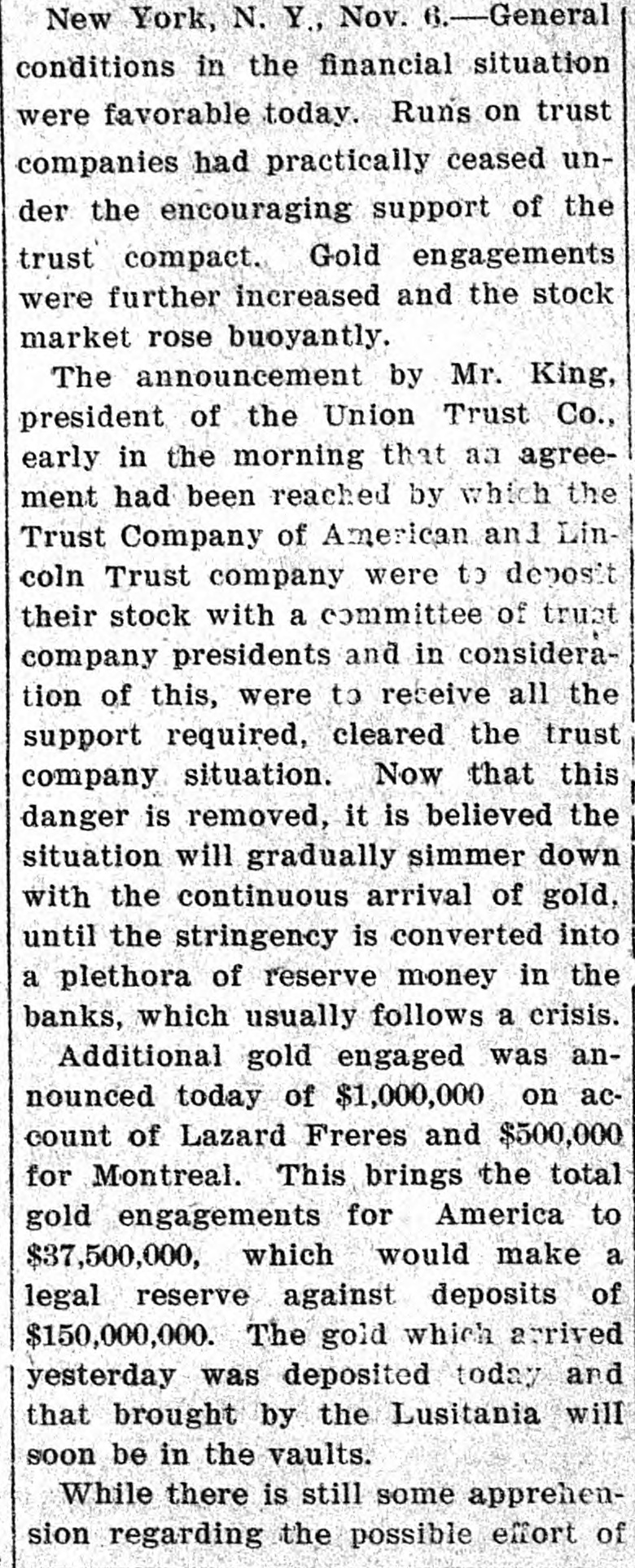 New York, N. Y., Nov. 6.-General conditions in the financial situation were favorable today. Runs on trust companies had practically ceased under the encouraging support of the trust compact. Gold engagements were further increased and the stock market rose buoyantly. The announcement by Mr. King, president of the Union Trust Co., early in the morning that aa agreement had been reached by which the Trust Company of American and Lincoln Trust company were to deposit their stock with a committee of trust company presidents and in consideration of this, were to receive all the support required, cleared the trust company situation. Now that this danger is removed, it is believed the situation will gradually simmer down with the continuous arrival of gold, until the stringency is converted into a plethora of reserve money in the banks, which usually follows a crisis. Additional gold engaged was announced today of $1,000,000 on account of Lazard Freres and $500,000 for Montreal. This brings the total gold engagements for America to $37,500,000, which would make a legal reserve against deposits of $150,000,000. The gold which arrived yesterday was deposited today and that brought by the Lusitania will soon be in the vaults. While there is still some apprehension regarding the possible effort of