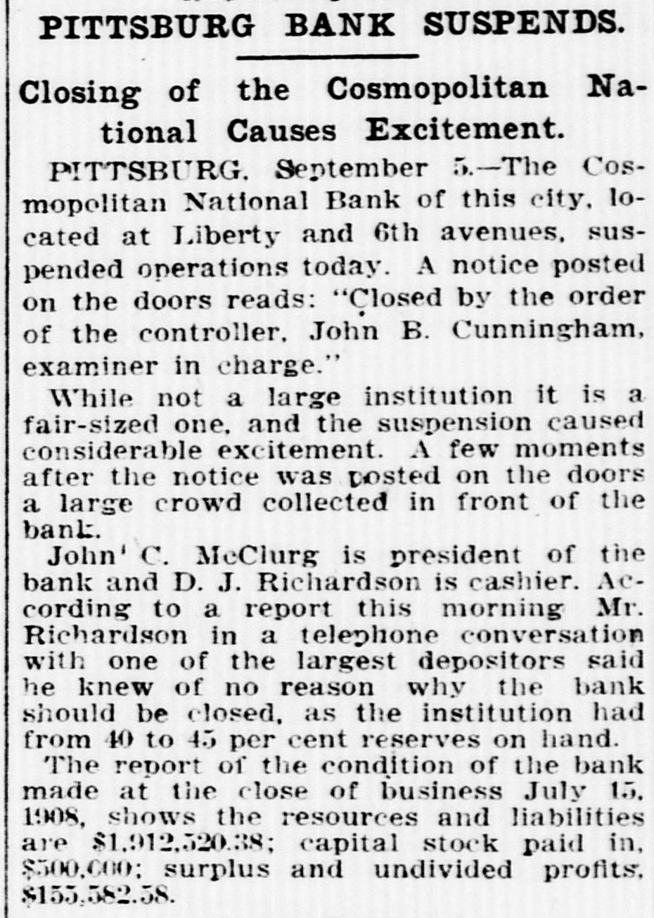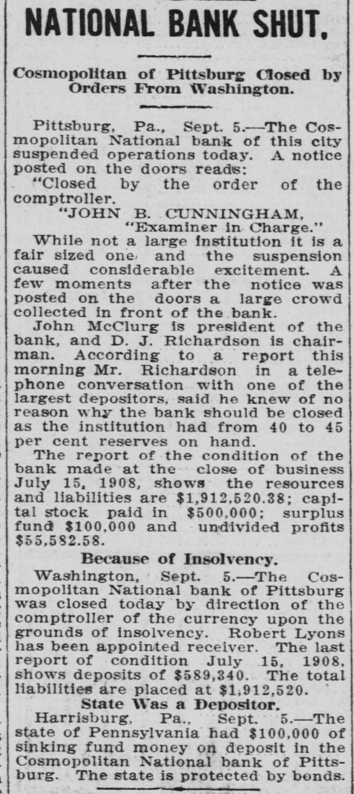 BY TELEGRAPH Domestic Directors of the Cosmopolitan National Bank, of Pittsburg, will demand that the institution be allowed to continue business. They insist that the comptroller's action in closing it was unwarranted. A man who gave the name of William Hatfield, but who is thought to be James C. Durham, charged with the murder of six people in California, is under arrest in Texas. Several Japanese are reported to have been killed as the result of a bloody feud between Japanese and Portugese at the Alaskan salmon canneries. Gisainto Rosino murdered the daughter of Dominick Scionto, whom he was visiting, in Cliffwood, N. J., after having criminally assaulted Acting Attorney General Hayden Clement, of Raleigh, N. C., has declared that his State cannot accept or care for John R. Early, of Lynn, N. C., a leper, now quarantined in the District of Columbia. The late Frederick Cooper Hewitt bequeathed $2,000,000 to the New York Post Graduate Medical School and Hospital, $1,500,000 to the Metropolitan Museum of Art and $500,000 to Yale University. Judge Vandeventer, in the United States Circuit Court at St. Paul, granted the injunction asked for by roads operating in Arkansas, and which prevents the enforcement of the two-cent rate. Some unknown person put dynamite in the chimney at the home of John Silock, Laurel Hill, Pa., and Mrs. Silock and her son were injured. An effort made to have Harry K. Thaw transferred from the Poughkeepsie Jail failed. He will remain where he is until the hearing this month. Orville Wright mace a flight in the aeroplane he made for the Signal Corps in the presence of a number of Army officers at Fort Myer. Mrs. O. L. Godfrey, wife of a wealthy Colorado Springs banker, is in Chicago being treated for rabies, having been bitten by a pet dog. J. Pierpont Morgan and Charles Steele have returned from a trip to Europe and report conditions as quite satisfactory. A panic in a Chicago street car resulted in the death of a baby, which was knocked to the floor and trampled upon. Chief of Police Woodruff, of Atlantic City, claims to be on the trail of a new suspect in-the Roberts shooting case, declaring that neither jealousy nor robbery was the motive for the crime, and that he expects to make an arrest in a few days. Dr. Bellisario Arrutia Suarez, private secretary of President Figueroa, of San Salvador, who is in New York, says there is no friction between his country and the Central American republics. The Iron Trade Review of Cleveland declares August has been the best month of the year in the iron business, and looks for a satisfactory condition of the industry by January 1, 1909. City Engineer Keefe, of New York, says the introduction of electricity in the operation of railroads tends to increase the amount of coal used. The Detroit police are investigating the death of a woman, who was reported as drowned, but who was afterward found to have a broken neck. Dr. J. D. Burke, principal of the Teachers' Training School, at Albany, N. Y., has returned from an investigating trip to the Philippines. The Pittsburg Police have found a letter which may help in identifying the man who burned his face with acid before killing himself there. The hearing of the suits brought by the government against various powder concerns will be heard at Wilmington, Del., September 22. Mrs. Bertha Gresham, widow of Lieutenant Gresham, United States Navy, has been kidnapped from her New York home. Fire at Cleveland, O., destroyed