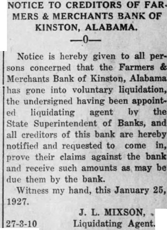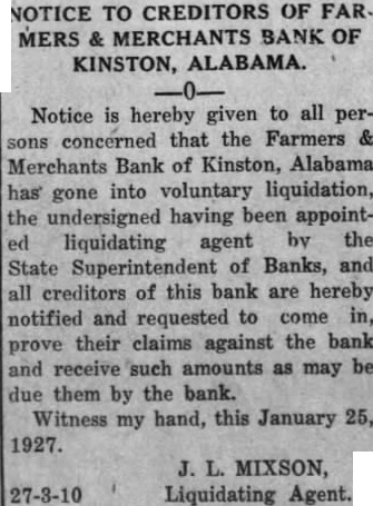 NOTICE TO CREDITORS OF FAR. MERS MERCHANTS BANK OF KINSTON, ALABAMA. Notice is hereby given to all perconcerned that the Farmers & Merchants Bank of Kinston, Alabama has gone into voluntary liquidation, the undersigned having been appointliquidating agent by the State Superintendent of Banks, and all creditors of this bank are hereby notified and requested to come in, prove their claims against the bank and receive such amounts as may be due them by the bank. Witness my hand, this January 25, 1927. 27-3-10 J. MIXSON, Liquidating Agent.
