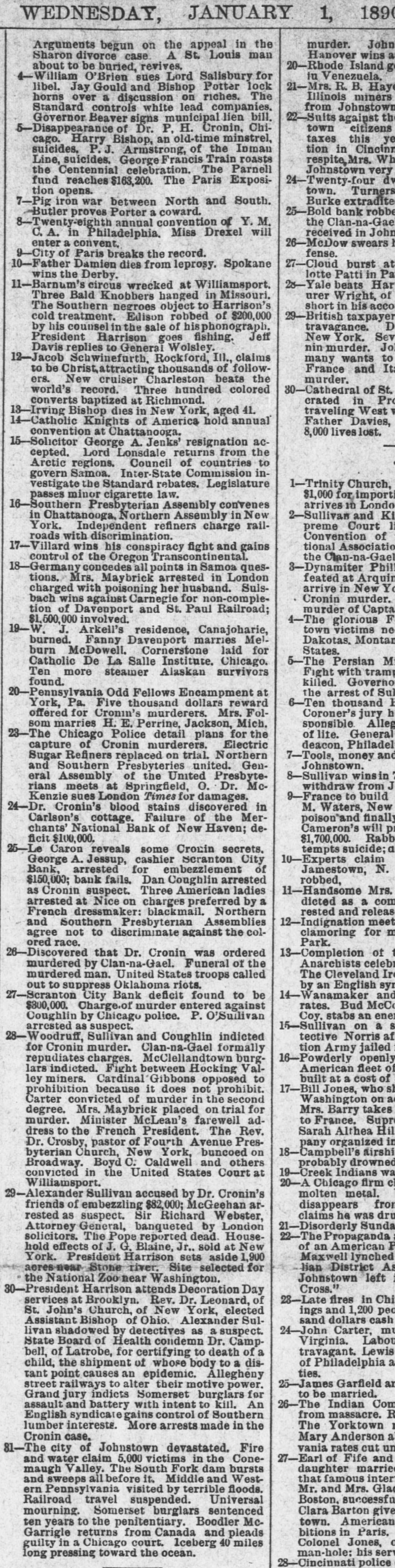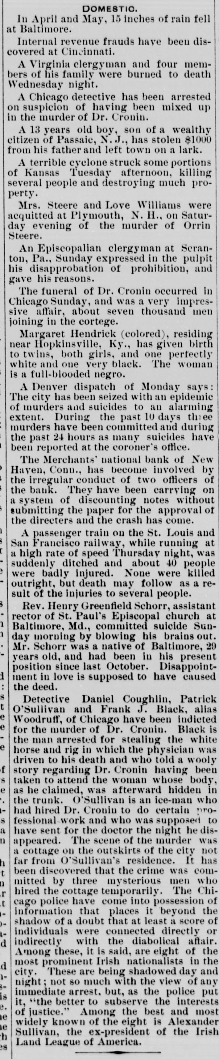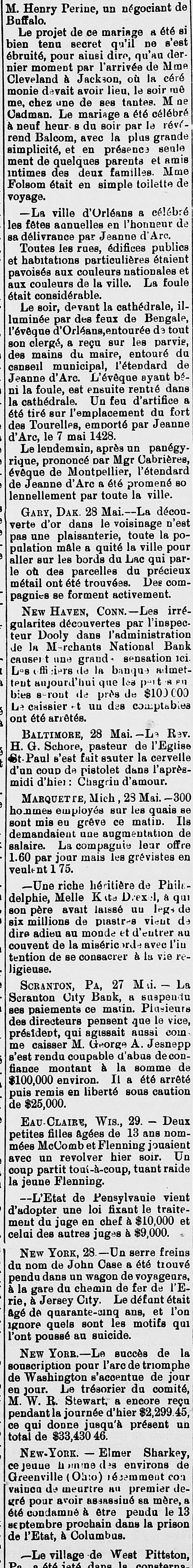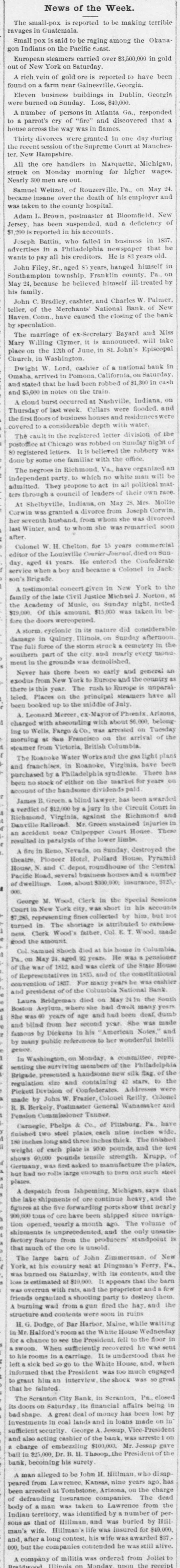 out of New York on Saturday. A rich vein of gold ore is reported to have been found on farm near Gainesville, Georgia. Eleven business buildings in Dublin, Georgia were burned on Sunday. Loss, $40,000. A number of persons in Atlanta Ga., responded to a parrot's cry of "fire" and discovered that a house across the way was in flames. Thirty divorces were granted in one day during the recent session of the Supreme Court at Manchester. New Hampshire. All the ore handlers in Marquette, Michigan, struck on Monday morning for higher wages. Nearly 300 men are out. Samuel Weitzel. of Rouzerville, Pa., on May 24. became insane over the death of his employer and was taken to the county hospital. Adam L. Brown, postmaster at Bloomfield, New Jersey, has been suspended. and a deficiency of $1,200 is reported in his accounts. Joseph Battin, who failed in business in 1837. advertises in Philadelphia newspaper that he wants to pay all his creditors. He is 83 years old. John Filey, Sr.,aged 83 years, hanged himself in Southampton township. Franklin county. Pa., on May 24, because he believed himself ill treated by his family John C. Bradley eashier, and Charles W. Palmer, teller, of the Merchants' National Bank of New Haven. Conn. have caused the closing of the bank by speculation. The marriage of ex-Secretary Bayard and Miss Mary Willing Clymer, it is announced. will take place on the 12th of June, in St. John's Episcopal Church, in Washington. Dwight W. Lord, cashier of a national bank in Omaha, arrived in Pomona California on Saturday and stated that he had been robbed of $1,300 in cash and $5,000 in notes on the train. A cloud burst occurred at Nashville, Indiana, on Thursday of last week. Cellars were flooded. and the first floors of business houses and residences covered to considerable depth with water. The vault in the registered letter division of the postoffice at Chicago was robbed on Sunday night of 80 registered letters. It is believed the robbery was done by some one familiar with the office. The negroes in Richmond. Va., have organized an independent party to which no white man will be admitted. They propose to act in all political mat ters through a council of leaders of their own race. At Shelbyville, Indiana, on May 28, Mrs. Mollie Corwin was granted a divorce from Joseph Corwin her seventh husband. from whom she was divorced last Winter, and to whom she was remarried soon after. Colonel W. H. Chelton. for 15 years commercial editor of the Louisville Courier-Journal, died on Sun day. aged 41 years. He entered the Confederate service when boy and became a Colonel in Jack son's Brigade. A testimonial concert given in New York to the family of the late Civil Justice Michael J. Norton, at the Academy of Music, on Sunday night, netted $19,000 of this amount $15,000 was taken in before the doors wereopened. A storm. eyclonic in its nature did considerable damage in Quincy Illinois, on Sunday afternoon. The full force of the storm struck cemetery in the southern part of the city and nearly every monu ment in the grounds was demolished. Never has there been so early and general an exodus from New York to Europe and the country as there is this year. The rush to Europe is unparal leled. Places on the principal steamers have all been booked up to the middle of July. A. Leonard Mercer ex Mayorof Phoenix Arizona, charged with absconding with about $6,000, belong Ing to Wells, Fargo & Co., was arrested on Tuesday morning at San Francisco on the arrival of the steamer from Victoria, British Columbia. The Roanoke Water Worksand the gas light plant and franchises, in Roanoke, Virginia. have been purchased by & Philadelphia syndicate There has been no stock of either on the market for years on account of the handsome dividends paid. James B. Green a blind lawyer, has been awarded a verdiet of $12,000 by jury in the Circuit Court in Richmond, Virginia, against the Richmond and Danville Railroad. Mr. Green sustained injuries in an accident near Culpepper Court House. These resulted in paralysis of the lower limbs. A fire in Reno, Nevada on Sunday, destroyed the theatre. Ploneer Hotel, Pollard House, Pyramid House, N. and C. depot, roundhouse of the Central Pacific Road, several business houses and number of dwellings. Loss, about $300,000; insurance, $123,000. George M. Wood, Clerk in the Special Sessions Court in New York city, was short in his accounts $7,283, representing fines collected by him, but not turned in The shortage is attributed to carcless ness. Clerk Wood's father. Col. E. T. Wood, made good the amount Col. Samuel Shoch died as his home in Columbia Pa., on May 24. aged 92 years. He was a pensioner of the war of 1812, and was clerk of the State House of Representatives in 1833. and of the constitutional convention of 1807. For many years be was cashier and president of of the Columbia National Bank Laura Bridgeman died on May 24 in the South Boston Asylum. where she had dwelt many years She was (1) years of age and had been deaf. dumb and blind from her second year. She was made famous by Dickens in his American Notes." and by many public references to her wonderful intelli gence. In Washington, on Monday. & committee representing the surviving members of the Philadelphia Brigade, presented & handsome new silk ftag. of the regulation size and containing e stars, to the Pickett Division of Confederates Addresses were made by John W. Frazier, Colonel Reilly, Colonel R. B. Berkely, Postmaster General Wanamaker and Pension Commissioner Tenner Carnegie, Phelps & Co., of Pittsburg. Pa., have finished two steel plates, each nine inches wide. 180 inches long and three inches The finished weight of each plate is sexe pounds, and the test shows 60,000 pounds tensile strength. Krupp. of Germany was first asked to manufacture the plates, but had no rulls large enough to turn ont such steel plates. A despatch from Ishpeming Michigan, says that the lake shipments of are continue heavy and the figures at t