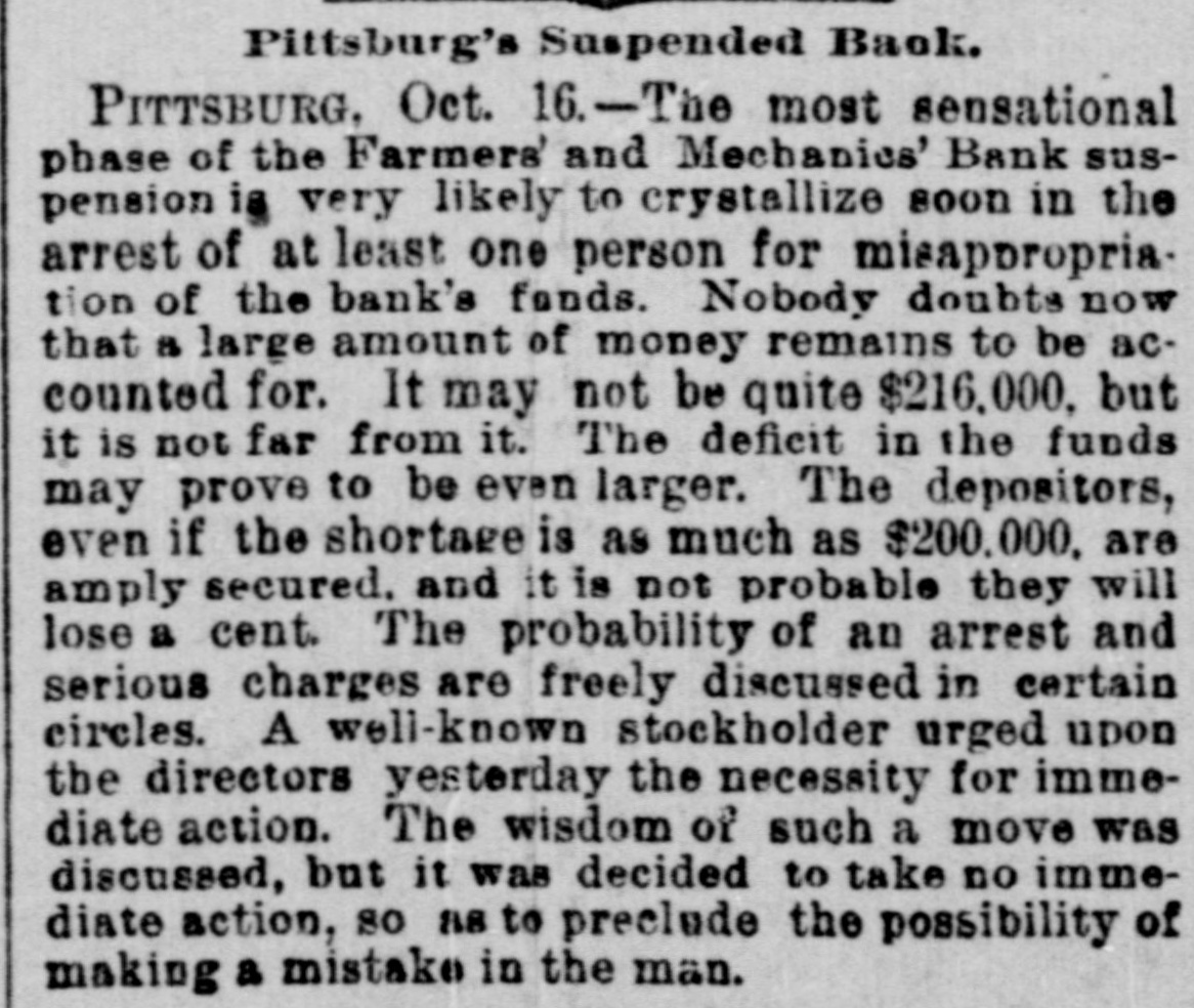 bus Territorial bill was passed substitute for the Senate measure by party vote of pus out, 1031 'sAuu :801 South Dakota, Washington and Montana Ter ritories. Thirty private pensign bills were session Sujueso em 10 pessed DOMESTIC. THE National Dairy Fair Association of 18 4791 1he uo organized SUM America Springtield, III. The purpose of the incorArtig 10 exhibitions DATE 07 SI D products. GILA BENITA, a cowboy in Montana, while 1314 the uo Indian Appach UB SU pessorp attacked a party of Mexican herders, killing five and wounding one. AT Marietta, U., William Weitzel, aged sixteen years, shot George Farnsworth on the 15th, killing him instantly GEORGE MEADOWS, the negro who re. cently assaulted Mrs. Kellam near Pratt 041 uo qour 8 sq peSueq SEM Ala Minos, 1514 MRS. EMMA THOMPSON brought suit in Cincinnati on the 15th for divorce, charg ing that her husband, John I. Thompson, had wives living in six different cities. J J. CLARK and Mrs. M. J. Wright, clairvoyants, were arrested in New Haven, MBI blue PIO uu Jepun 4391 the uo which provides for the punishment of fortune-tellers. WILLIAM WENTZEL shot and killed Frank Farnsworth on the 15th at Marietta, O., while the two were playing White Caps. B pournq 1514 the tto Mara V factory in New York, and three girls lost their lives in the flames. WILLIAM HODGES, a young boy living near Atlanta, Ga., committed suicide on up steep 01 p101 SEM life because 4721 en the kitchen. MRS. ARTHUR RODDEY was burned to B an poan(u) her puu d fire in a small dwelling at Pittsburgh, Pa., 1664 out uo HARRISON DAWLEY, of Rochester, III., December Sop a B sq bitten SEM oqm 3, died on the 16th of hydrophobia. MRS. COURTNEY, living near Hale's Springs, Tenn., went to church on the 16th, first locking up her two children in the house. Upon her return she found both her little ones dead, their clothes having ignited from the place. IN Pittsburgh on the 16th T. V. Powderly denounced Barry as an Anarchist, and XO SUAL ou reason that 101 SEM # pies pelled from the Knights of Labo MRS. JOHN GREER, wife of a lumberman at Sunshine, Pa., killed her babe and Sujen 1974. the uo subject committed then out 40J имоия SUM osneo No 8 deed. 140 that 4791 the uo SEM 11 puq "puI 18 Kanf ривля found indictments against thirty five persons for violation of the election law u! 4191 eye uo pepp Alsace township, Pa., aged eighty years. When twenty-two years old deceased be10 pojed e aoj pus came siq up 188J SEM 04 Areas every KIJU 07 mill puos 07 refusits spuers his "moor unitsu us AN old man, rudely clad and with unkept hair and beard, who gave his name as A. Squires, went into the Philadelphia on claim his релола puu 4391 the uo quiut at there SEAL that plos up $2.200 1855. SUM ese JO Fords not NVW V captured while running wild near James town, Ky., on the 16th. He lived on roots, siq 1101 you could pue bothing puu sinu name AN unknown man, assisted by a little 001 JO teller the thicked 11118 10.8 pue 4191 1he 110 "end "Iⁿᴴ 18 Bank 009'2$ 4714 AUMB IT was announced on the 16th that the IV 18 [ Chinese B 10 and peq Francisco use mo.r "Bg 'Sueq cipitated a genuine war of races, with the negro women on the one side and the terrified Chinaman on the other. HUTTON PARK, at West Orange, N. J., was Products our 000'1218 JOJ 1044 our uo PIO8 was originally purchased from the Indithere 'sunD OM1 JOJ 1291 'gI Marroh sue coats and thirteen cans of rum. WILLIAM JAMES, a farmer living four miles east of Somerset, Ky., struck a stream of pure petroleum on the 16th. SEVERAL citizens of Wabash, Ind,, re ceived notices on the 17th from White Caps stating that unless they mended their ways they would be whipped. THE dealers in washboards, clothespins and similar articles of domestic use formed a trust in New York on the 17th. A BOY named Chandler was caught in the machinery of a cigarette factory at Lynchburg, Va., on the 17th and crushed dealh 07 ALL the miners at Bromwell, W. Va, and in the immediate section, over four thousand in number, went out on a strike Include JOAO SUM thouble 140 4721 the uo cars. MOONSHINERS were causing much trouble Charlotte 30 Atentity our ut 4721 the uo ON AT Sioux City, Ia., Mrs. C. A. Ralph, an English woman, rose from the dinner deed berson the pue 4721 the uo table H. F. VOIGHT, former cashier of the Farmers and Mechanics' Bank of Pitts burgh, Pa, which failed in September with liabilities of $250,000, was arrested e JO charge the uo 421 140 uo 0000002$ EORGE HACKER, an Indianapolis Anarchist who stabbed his employer, James Bruce, because the latter expressed gratification at the election of General Har-inoj 01 4721 the uo servenced SEAL teen years in the penitentiary AT the death on the 17th of William -sip SEM 91 'Roqsmen Louis 78 e Reane's covered that he had amassed a fortune of $18,050, the largest portion of which was invested in bonds and securities. June p.1 cithts pun porpuny euo and versary of Benjamin Franklin's natal day was fittingly observed in various places on the 17th by typographical societies. ADAM BERKELS, of Hillsboro, O., brought suit on the 17th for damages against sixteen citizens of Brown County for an assault committed upon him in their capacity as "White Caps. JAMES P. NEARY, cashier of the Mutual Union Telegraph Company of Boston, was arrested on the 17th, charged with embezzling $2,000 of the company's money. GEORGE MEADOWS, the negro who was recently lynched at Pratt Mines, Ala., as the assailant of Mrs. Kellmer, was on the 17th found to have been innocent of the crime for which he died. The real culprit 1181 u! peuguoo SUM A MAN named Beecher, living near the Buck Shoals silver mines in Indiana, was carelessly handling a can of blasting powder on the 17th when it exploded, blowing away half his head and one hand. uo Monats SUM 1 JO VIGA V Mitheral 10 north mille 8 1184 4721 our SIM Point рошви now OM1 I I Potesn' 1V and Harris shot each other to death on the the possector OUAL bystander 8 pus 4721 рерипом S