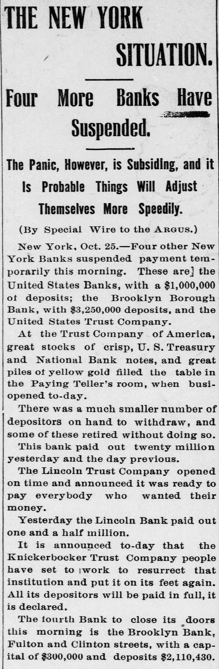 THE NEW YORK SITUATION. Four More Banks Have Suspended. The Panic, However, is Subsiding, and it Is Probable Things Will Adjust Themselves More Speedily. (By Special Wire to the ARGUS.) New York, Oct. 25.-Four other New York Banks suspended payment temporarily this morning. These are] the United States Banks, with a $1,000,000 of deposits; the Brooklyn Borough Bank, with $3,250,000 deposits, and the United States Trust Company. At the Trust Company of America, great stocks of crisp, U.S. Treasury and National Bank notes, and great piles of yellow gold filled the table in the Paying Teller's room, when busiopened to-day. There was a much smaller number of depositors on hand to withdraw, and some of these retired without doing so. This bank paid out twenty million yesterday and the day previous. The Lincoln Trust Company opened on time and announced it was ready to pay everybody who wanted their money. Yesterday the Lincoln Bank paid out one and a half million. It is announced to-day that the Knickerbocker Trust Company people have set to work to resurrect that institution and put it on its feet again. All its depositors will be paid in full, it is declared. The fourth Bank to close its doors this morning is the Brooklyn Bank, Fulton and Clinton streets, with a capital of $300,000 and deposits $2,110,430.