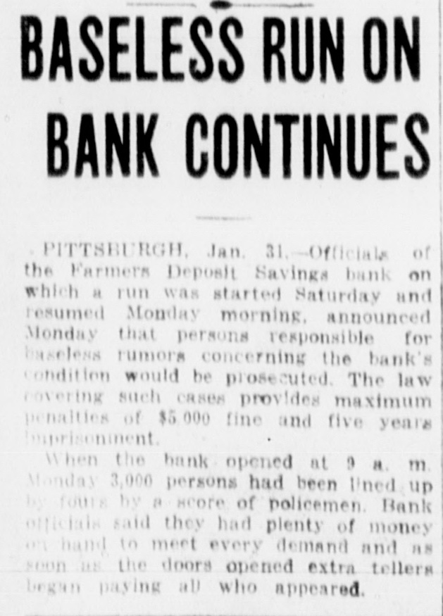 RUN ON A SAVINGS BANK IN PITTSBURGH. Crowd of 3,000 Depositors Kept in Line by 25 or 30 Policemen. Pittsburgh, Pa., Jan. 31.-When the doors of the Farmers' Deposit Savings bank, on which a run was-started Saturday at noon and continued until the bank closed at 9 o'clock that night, were thrown open today, fully 3,000 persons were waiting to withdraw their deposits. The crowd was kept in line by 25 or 30 policemen. Bank officials said they had plenty of money on hand to meet every demand, and when the doors were opened extra tellers began paying all who appeared. As on Saturday, the bank did not take advantage of the law which limits demand withdrawals of savings accounts to $100, but closed out all accounts where the full deposit was asked. Members of the clearing house committee said the bank was in position to take care of the run, but, if the time came when it could not meet withdrawals, the clearing house had made every arrangement to pay the remaining obligations. It was announced today that persons responsible for the baseless rumors concerning the bank's condition would be prosecuted under the Pennsylvania law which provides maximum penalties of $5,000 fine and five years' imprisonment.