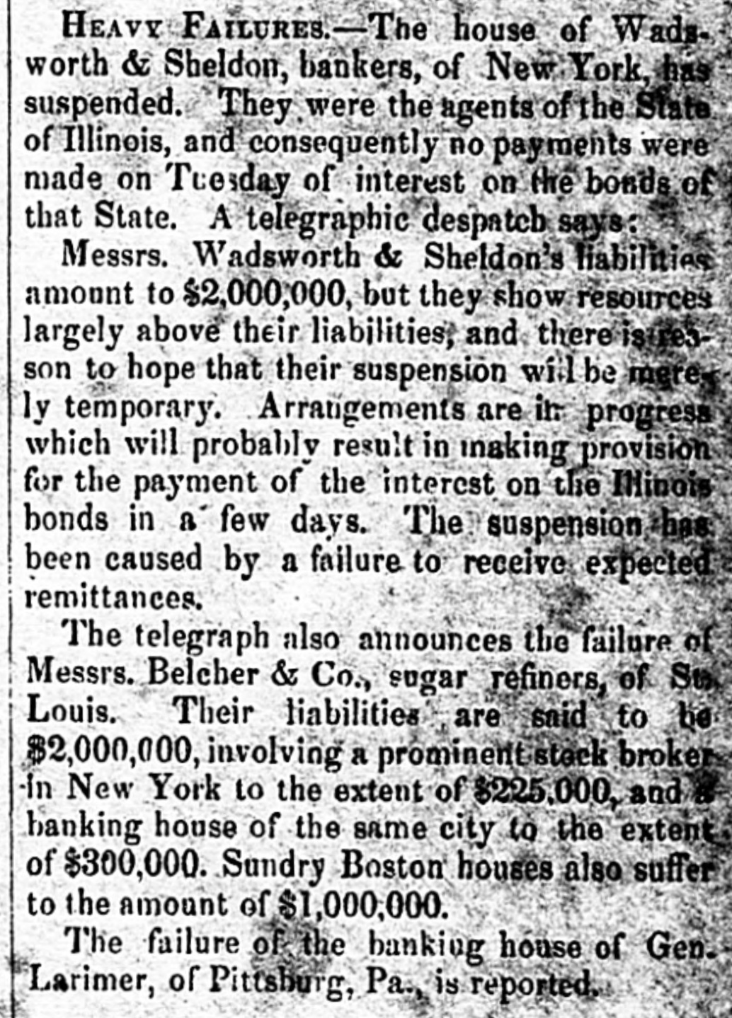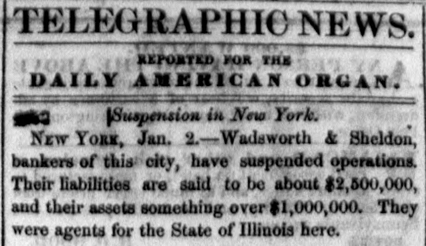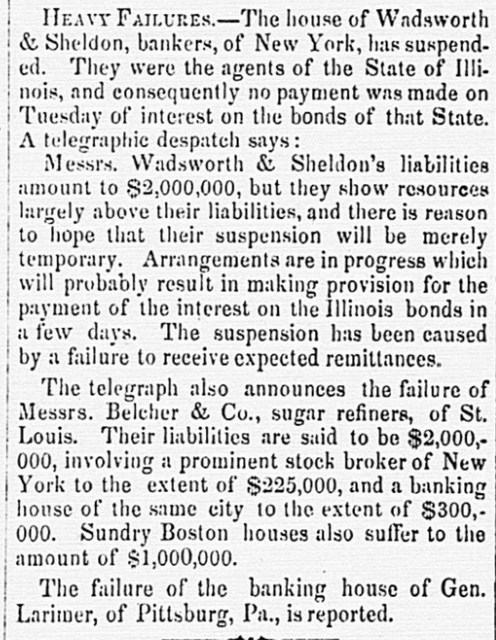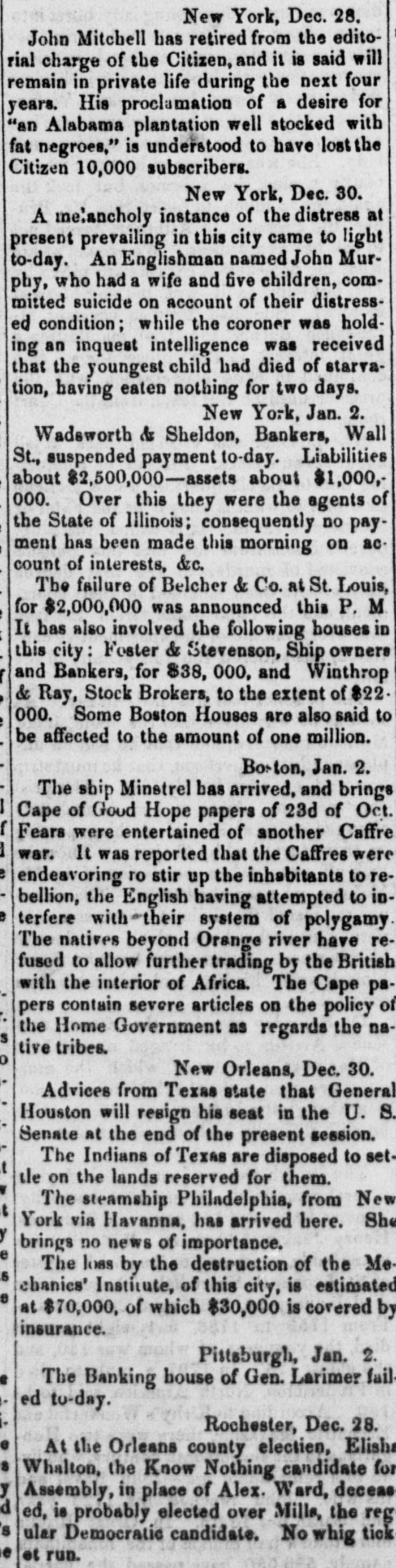 BY TELEGRAPH. Message of Goe. Clark, of New York. Albany, Jan. 2.-The governor's manage has been delivared to the legislature. It states that the receipts to the oral fund of the State have been for the year $1,965,000, and the expenditures for the same period have been $1,817,000. He anticipates considerable reduction in the receipts during the present year in consequence of the reduction of taxes, and also of receipts from canal tolls. The debt of the general fund on the 30th September was $6,355,000. The capital of the school fund has increased $42,000 during the year. The receipts from canals amount to $2,989,000, and the expenditures $1,238,000. The surples does not meet the purposes for which it was designed by $104,000. This deficit he attributes to the general commercial embarrassement and the short crops of last fall. The banking statistics show an increase of capital, during the year, of $7,081,000. He recommends a medification of the law allowing the deposite of bonds and mortgages as security; and also a repeal of the law imprisoning witnesses : and favors further encouragement of the free-school system. On the liquor question, Governor Clark defines his views at considerable length, and strongly advocates an entire prolibition of the sale of ardent spirita, citing many and fareible arguments in favor of such an enactment. He considers such probibition clearly within the limits of the constitution, and hopes a bill will be framed that will effectuall suppress the sale without infringing upon just personal rights. The goverage recounts the particulars of the Lemmon slave case and of the attitude assumed by Virginia, and recommends that provision be made to defend the rights and interents of the State. He regrets the veto of the river and harbor bill of the last session of Congress, and considers that a proper tariff would have obvisted the present commercial and general distress. He strongly denounces the repeal of the Missouri Compromise, and considers that its restoration is essential for the security, peace, and permanent welfare of the country begislature of Pennsylvania, HARRISBURG, Jan. 2.-The house was organized this morning. On the first ballot Henry K. Strong (fasionist) was elected speaker by 76 votes-scattering 21. The senate is to meet at o'clock. Hendricks (fusionist) is the caucus candidate, and Hamlin the democratic candidate for speaker. Meeting of the New York Legislature. ALBANY, Jan. 1-The legislature met this morning, and Mr. Littlejohn (whig) was elected speaker. All the officers of the assembly are fusionists, and were elected by large majorities. Legislature of Delaware. BALTIMORE, January 2.-The legislature of Delaware met at Dover to-day. Daniel Curry, fusionist, was elected speaker of the senate, and Samuel Biddle, know-nothing, speaker of the House. The Baltimore councils have finally adjourned. There is evidently serious trouble brewing among the know-nothings. There is some talk of Mayor Hinks resigning his office. Meeting of the Unemployed. NEW YORK, Jan. 2-A large meeting was held in the Park this forenoon, composed of unemployed operatives of all trades. Many inflammatory speeches were delivered, but no disturbance occurred. | New York City Government. NEW York, Jan. 3.-The city government was organized this morning by the election of Issue 0. Barker, eag., as president of the board of aldermen, and D. D. Connor president of the common council. Suspension in New York. New York, Jan. 2.-Wadsworth & Sheldon, bankers of this city, have suspended operations. Their liabilities are said to be about $2,500,000, and their assets something over $1,000,000. They were agents for the State of Illinois here. Markets. NEW York, Jan. 2.-Cotton-the market is unchanged, with a limited business at previous rates. Flour has advanced 25 cents per barrel, with sales of 3,000 bartels good Ohio at $9 50 a $9 873/4; southern has advanced 12% cents-sales of 1,400 barrels at $9.50 a $10 1234. Wheat-prices are a trifle higher-southern white at $2 28; Michigan, $2 38. Cornthe market is firm, with sales of 62,000 bushels western mixed at $1 a $1 001/2. Pork is dull, with & downward tendency. Beef is firm, and tending upward. Lard is firm and upward. Whiskey is heavy, with sales of Ohio at 373/2 cents. BALTIMORE, Jan. 2.-Flour-bolders are asking $9, but no sales. Wheat-4,000 bushels offered-sales of white at $2 05 a $2 15; red at Corn-sales of 22,000 bushels of yellow and white at 90 cents. NEW ORLEANS, Dec. 30.-Cotton-the sales of Friday were 4,500 bales, and for the week 35,000 bales. The stock of American, exclusive of shipboard, was 150,000 bales. The receipts at all southern ports are 27,000 bales less than last year. Sales of 15,000 bales middling at 8-95.