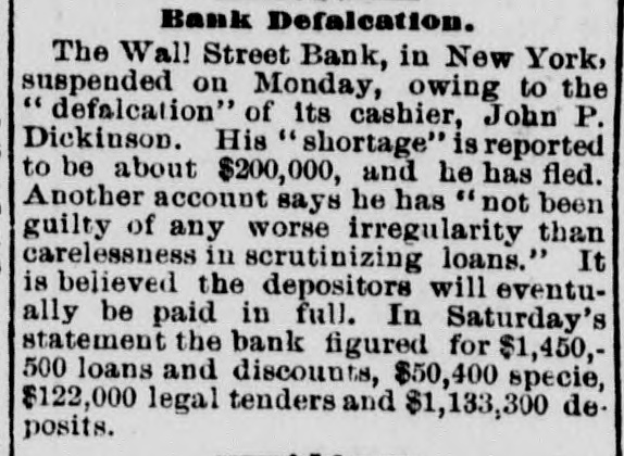 Bank Defalcation. The Wall Street Bank, in New York, suspended on Monday, owing to the "defalcation" of its cashier, John P. Dickinson. His "shortage" is reported to be about $200,000, and he has fled. Another account says he has "not been guilty of any worse irregularity than carelessness in scrutinizing loans." It is believed the depositors will eventually be paid in full. In Saturday's statement the bank figured for $1,450,500 loans and discounts, $50,400 specie, $122,000 legal tenders and $1,133,300 deposits.