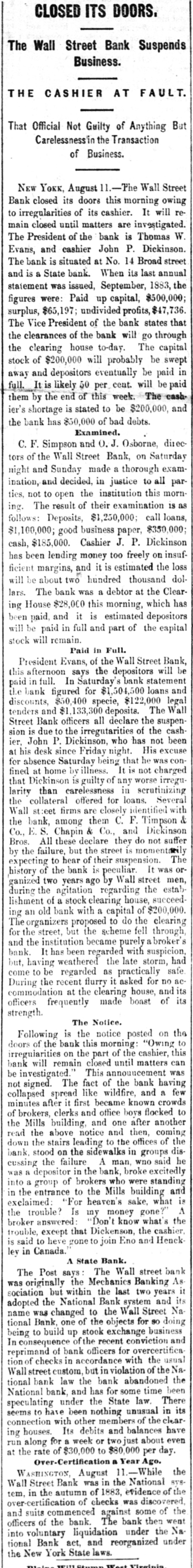 The Wall Street Bank (New York) suspended on Aug 11, 1884 due to a $200,000 shortage/defalcation by its cashier John P. Dickinson. A receiver (C. J. Osborn) was later appointed, and the bank reopened/was reported opened later in August (papers dated Aug 26 report it opened Monday Aug 25). Depositors were paid dividends under receiver. No clear evidence of a distinct depositor-initiated run prior to suspension; primary trigger was cashier defalcation (bank-specific adverse information).