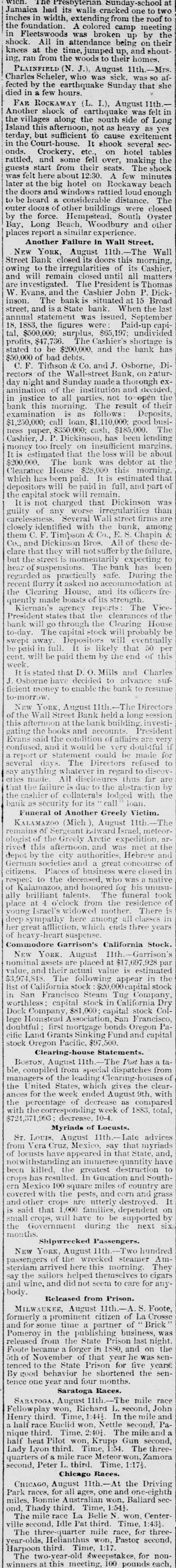to be $200,000, and the bank 50,000 of bad debts. C.F. Timson & Co. and J. Osborne, ectors of the Wall-street Bank, on Sa night and Sunday madea thorough mination of the institution and deci justice to all parties. not to open this morning. The result of t xamination is as follows Depo $1,250,000; call loan, $1,110,000; good b paper, $350,000; cash, $185,000. Cashier, J. P. Dickinson, has been lene noney too freely on insufficient mare is estimated that the loss will be al The bank was debtor at learance House $28,000 this morn vhich has been paid. It is estimated lepositors will be paid in full, and par he capital stock will remain. It is not charged that Dickinson guilty of any worse irregularities t arelessness. Several Wall street firms identified with the bank, am C. F. Timpson & Co., E. S. Chapi and Dickinson Bros. All of these that they will not suffer by the fail the street is momentarily expecting of suspensions. The bank has 1 regarded as practically safe. During flurry it asked no accommodation Clearing House, and its officers quently made boasts of its strength. Kiernan's agency reports: The V President states that the clearances of will go through the Clearing H o-day. The capital stock will probabl away. Depositors will eventu paid in full. It is likely that 50 will be paid them by the end of It is stated that D.O. Mills and Cha Osborne have decided to advance money to enable the bank to rest 0-morrow. NEW YORK, August 11th.-The Direc the Wall Street Bank held a long ses afternoon at the bank building. inv the books and accounts. Presio Evans said the condition of affairs are onfused, and it would be very doubtfi report or statement could be made everal days. The Directors refused anything whatever in regard to dis made. All disclosures thus far the failure is due to the abstraction cashier of collaterals lodged with as security for its call loan. Funeral of Another Greely Victim KALAMAZOO (Mich ), August 11th.emains of Sergeant Edward Israel, met logist of the Greely Arctic expedition this afternoon, and was met at by the city authorities, Hebrew German societies and a great concours Places of business were close to the deceased, who was a na Kalamazoo, and honored for his un brilliant talents. The funeral t at 4 o'clock from the residenc Israel's widowed mother. Ther sympathy here among all classe great affliction, which ends three y heavy-heart suspense. Commodore Garrison's California Ste NEW YORK. August 11th.-Garris ominal assets are placed at $17,697,928 and their actual value is estima 3,974,848. The following appear in of California stock $20,000 capital st San Francisco Steam Tug Comp: vorthless: capital stock in California Company, $81,000; capital stock Homstead Association, San Franci loubtful first mortgage bonds Oregon Land Grants Sinking Fund and cap tock Oregon Pacific, $97,500. Clearing-house Statements. BOSTON, August 11th.-The Post has compiled from special dispatches f nanagers of the leading Clearing-house United States, which gives the el for the week ended August 9th, \ percentage of decrease as compa with the corresponding week of 1883, to 724,371,993; decrease. 10-4. Myriads of Locusts. Sr. LOUIS. August 11th.-Late adv Vera Cruz, Mexico. say that myr locusts have appeared in that State, otwithstanding an immensequantity I killed, the greatest destruction has resulted. In Gucation and So Mexico 100 square miles of country overed with the pests, and corn and g other crops are utterly destroyed said that 1,000 families, dependent mall crops, will have to be supported Government during the next nonths. Shipwrecked Passengers. NEW YORK, August 11th.-Two hung passengers of the wrecked steamer terdam arrived here this morning. T the sailors helped themselves to ci wine, and did not seem to care for : Released from Prison. MILWAUKEE, August 11th.-A.S Fo ormerly a prominent citizen of La Cr for some time a partner of Bri Pomeroy in the publishing business, from the State Prison last ni Foote became a forger in 1880, and on of November of that year he was enced to the State Prison for five ye good behavior he shortened the one year and four months. Saratoga Races. SARATOGA, August 11th.-The mile fellowplay won, Richard L. second, J Henry third. Time, 1:441. In the mile half race Euclid won, Nettle second, third. Time, 2:401. The mile al heat Pilot won, Krupp Gun seco Lady Lyon third. Time, 1:54. The th juarters of & mile race Meteor won, Zan econd, Peter L. third. Time, 1:171. Chicago Races. CHICAGO, August 11th.-At the Drive races, for all ages, one and one-eig Bonnie Australian won. Ballard Thady third. Time, 1:54}. The mile race La Belle N. won, Cen second Idle Pat third Time 1:43