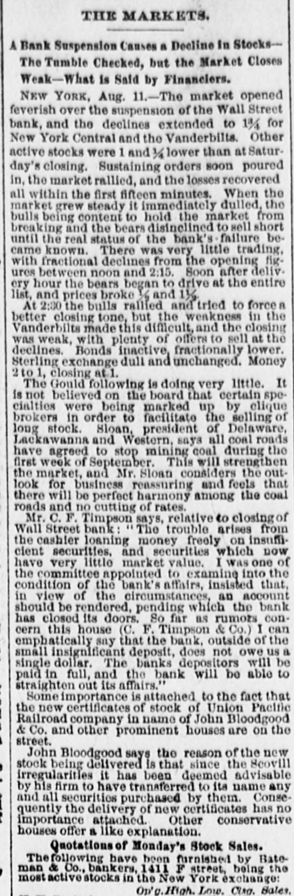 THE MARKETS. A Bank Suspension Causes a Decline in StocksThe Tumble Checked, but the Market Closes Weak-What is Said by Financiers. NEW YORK, Aug. 11.-The market opened feverish over the suspension of the Wall Street bank, and the declines extended to 1ª/4 for New York Central and the Vanderbilts. Other active stocks were 1 and ½ lower than at Saturday's closing. Sustaining orders soon poured in, the market rallied, and the losses recovered all within the first fifteen minutes. When the market grew steady it immediately dulled, the bulls being content to hold the market from breaking and the bears disinclined to sell short until the real status of the bank's failure became known. There was very little trading, with fractional declines from the opening figures between noon and 2:15. Soon after delivcry hour the bears began to drive at the entire list, and prices broke 1/2 and 11/2. At 2:30 the bulls rallied and tried to force a better closing tone, but the weakness in the Vanderbilts made this difficult, and the closing was weak, with plenty of offers to sell at the declines. Bonds inactive, fractionally lower. Sterling exchange dull and unchanged. Money 2to 1, closing at 1. The Gould following is doing very little. It is not believed on the board that certain specialties were being marked up by clique brokers in order to facilitate the selling of long stock. Sloan, president of Delaware, Lackawanna and Western, says all coal roads have agreed to stop mining coal during the first week of September. This will strengthen the market, and Mr. Sloan considers the outlook for business reassuring and feels that there will be perfect harmony among the coal roads and no cutting of rates. Mr. C. F. Timpson says, relative to closing of Wall Street bank: The trouble arises from the cashier loaning money freely on insufficient securities, and securities which now have very little market value. I was one of the committee appointed to examine into the condition of the bank's affairs, insisted that, in view of the circumstances, an account should be rendered, pending which the bank has closed its doors. So far as rumors concern this house (C. F. Timpson & Co.) I can emphatically say that the bank, outside of the small insignificant deposit, does not owe us a single dollar. The banks depositors will be paid in full, and the bank will be able to straighten out its affairs." Some importance is attached to the fact that the new certificates of stock of Union Pacific Railroad company in name of John Bloodgood & Co. and other prominent houses are on the street. John Bloodgood says the reason of the new stock being delivered is that since the Scovill irregularities it has been deemed advisable by his firm to have transferred to its name any and all securities purchased by them. Consequently the delivery of new certificates has no importance attached. Other conservative houses offer a like explanation. Quotations of Monday's Stock Sales. The following have been furnished by Bateman & Co., bankers, 1411 F street, being the most active stocks in the New York exchange: Op'g. High. Low. Clarg. Sales.