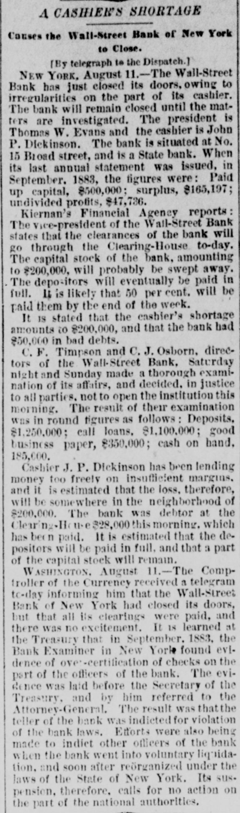 4 CASHIER'S SHORTAGE Causes the Wall-Street Bank of New York to Close. [By telegraph to the Dispatch.] NEW YORK, August 11.-The Wall-Street Bank has just closed its doors, owing to irregularities on the part of its cashier. The bank will remain closed until the matters are investigated. The president is Thomas W. Evans and the cashier is John P. Dickinson. The bank is situated at No. 15 Broad street, and is a State bank. When its last annual statement was issued, in September. 1883, the figures were: Paid up capital, $500,000; surplus, $165,197; undivided profits, $47,736. Kiernan's Financial Agency reports: The vice-president of the Wall-Street Bank states that the clearances of the bank will go through the Clearing-House to-day. The capital stock of the bank, amounting to $200,000, will probably be swept away. The depositors will eventually be paid in full. It is likely that 50 per cent. will be paid them by the end of the week. It IS stated that the eashier's shortage amounts to $200,000, and that the bank had $50,000 in bad debts. C.F. Timpson and C. J. Osborn, directors of the Wall-Street Bank, Saturday night and Sunday made a thorough examination of its affairs, and decided, in justice to all parties. not to open the institution this morning. The result of their examination was in round figures as follows Deposits, $1,250,000; call loans, $1,100,000; good business paper, $350,000; cash on hand, 185,000. Cashier J. P. Dickinson has been lending money too freely on insufficient margins, and it is estimated that the loss, therefore, will be somewhere in the neighborhood of $200,000. The bank was debtor at the Clearing-Ho $28,000 this morning. which has bec paid. It is estimated that the depositors will be paid in full, and that 3 part of the capital stock will remain. WASHINGTON. August 11.-The Comptroller of the Currency received a telegram to-day informing him that the Wall-Street Bank of New York had closed its doors, but that all its clearings were paid, and there was no excitement. It 18 learned at the Treasury that in September. 1883, the Bank Examiner in New York found evidence of ove:-certification of checks on the part of the officers of the bank. The evidence was laid before the Secretary of the Treasury, and by him referred to the Attorney-General. The result was that the teller of the bank was indicted for violation of the bank laws. Efforts were also being made to indiet other officers of the bank when the bank went into voluntary liquidation, and soon after reörganized under the laws of the State of New York. Its suspension, therefore, calls for no action on the part of the national authorities.