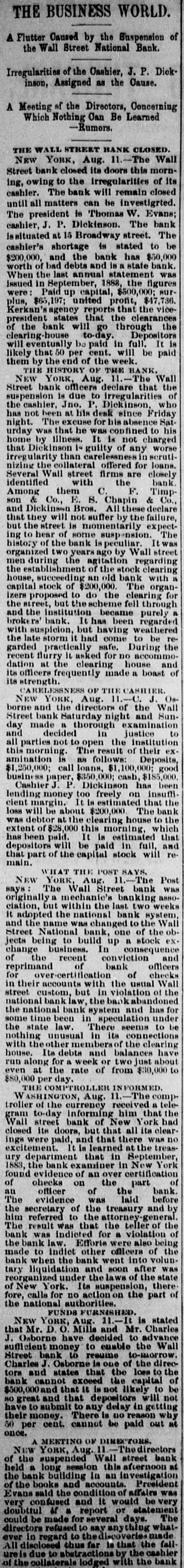 THE BUSINESS WORLD. A Flutter Caused by the Suspension of the Wall Street National Bank. Irregularities of the Cashier, J. P. Diokinson, Assigned as the Cause. A Meeting of the Directors, Concerning Which Nothing Can Be Learned --Rumors. THE WALL STREET BANK CLOSED. NEW YORK, Aug. 11.-The Wall Street bank closed its doors this morning, owing to the irregularities of its cashier. The bank will remain closed until all matters can be investigrted. The president is Thomas W. Evans; cashier, J. P. Dickinson. The bank issituated at 15 Broadway street. The cashier's shortage is stated to be $200,000, and the bank has $50,000 worth of bad debts and is a state bank. When the last annual statement was issued in September, 1888, the figures were: Paid up capital, $500,000; surplus, $65,197; united profit, $47,736. Kerkan's agency reports that the vicepresident states that the clearances of the bank will go through the clearing-house to-day. Depositors will eventually be paid in full. It is likely that 50 per cent. will be paid them by the end of the week. THE HISTORY OF THE BANK. NEW YORK, Aug. 11. -The Wall Street bank officers declare that the suspension is due to irregularities of the cashier, Jno. P. Dickinson, who has not been at his desk since Friday night. The excuse for his absence Saturday Was that he was confined to his home by illness. It is not charged that Dickinson 14 guilty of any worse irregularity than carelessness in scrutinizing the collateral offered for loans. Several Wall street firms are closely identified with the bank. them F. C. Among Timpson & Co., E. S. Chapin & Co., and Dickinsen Bros. All these declare that they will not suffer by the failure, but the street is momentarily expecting to hear of some suspension. The history of the bank is peculiar. It was organized two years ago by Wall street men during the agitation regarding the establishment of the stock clearing house, succeeding an old bank with 16 capital stock of $200,000. The organizers proposed to do the clearing for the street, but the scheme fell through and the institution became purely a broke rs bank. It has been regarded with suspicion, but having weathered the late storm it had come to be regarded practically safe, During the recent flurry it asked for no accommodation at the clearing house and its officers frequently made a boast of its strength. CARELESSNESS OF THE CASHIER. NEW YORK, Aug. 11.-C. J. Osborne and the directors of the Wall Street bank Saturday night and Sunday made a thorough examination to and decided in justice all parties not to open the institution this morning. The result of their examination is as follows: Deposits, $1,250,000; call loans, $1,100,000; good business paper, $350.0 cash, $185,000. Cashier J. P. Dickinson has been lending money too freely on insufficient margin. It is estimated that the loss will be about $200,000. The bank was debtor at the clearing house to the extent of $28,000 this morning, which has been paid. It is estimated that depositors will be paid in full, and that part of the capital stock will remain. WHAT THE POST SAYS. NEW YORK, Aug. 11.-The Post says The Wall Street bank was originally a mechanic's banking association, but within the last two weeks it adopted the national bank system, and the name was changed to the Wall Street National bank, one of the objects being to build up a stock exchange business. In consequence of the recent conviction and reprimand of bank officers for over-certification of checks in their accounts with the usual Wall street custom, but in violation of the national bank law, the bankabandoned the national bank system and has for some time been in speculation under the state law. There seems to be nothing unusual in its connections with theother members of the clearing house. Its debts and balances have run along for a week or two just about even at the rate of from $30,000 to $80,000 per day. THE COMPTROLLER INFORMED. ASHINGTON, Aug. 11.-The comptroller of the currency received a telegram to-day informing him that the Wall street bank of New York had closed its doors, but that all its clearings were paid, and that there was no excitement. It is learned at the treasury department that in September, 1883, the bank examiner in New York found evidence of an over certification of of ohecks on the part an officer of the bank. The evidence was laid before the secretary of the treasury and by him referred to the attorney-general. The result was that the teller of the bank was indicted for a violation of the bank law. Efforts were also being made to Indict other officers of the bank when the bank went into voluntary liquidation and soon after was reorganized under the laws of the state of New York. Its suspension, there fore, calls for no action on the part of the national authorities. FUNDS FURNISHED. NEW YORK, Aug. 11.-It is stated that Mr. D. O. Mills and Mr. Charles J. Osborne have decided to advance sufficient money to enable the Wall Street bank to resume to-morrow. Charles J. Osborne is one of the directors and states that the loes to the bank cannot exceed the capital of $500,000 and that it is not likely to be so great and that depositors will not have to submit to any delay in getting their money. There is no reason why 50 per cent. cannot be paid out at once.