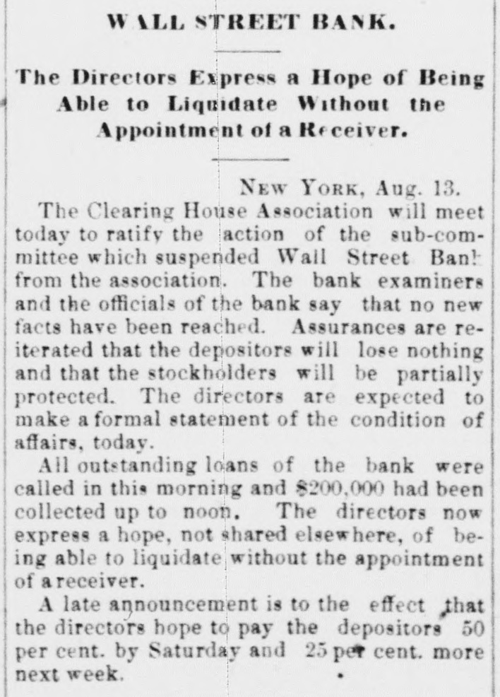 ALL STREET BANK. The Directors Express a Hope of Being Able to Liquidate Without the Appointment of a Receiver. NEW YORK, Aug. 13. The Clearing House Association will meet today to ratify the action of the sub-committee which suspended Wall Street Ban! from the association. The bank examiners and the officials of the bank say that no new facts have been reached. Assurances are reiterated that the depositors will lose nothing and that the stockholders will be partially protected. The directors are expected to make a formal statement of the condition of affairs, today. All outstanding loans of the bank were called in this morning and $200,000 had been collected up to noon. The directors now express a hope, not shared elsewhere, of being able to liquidate without the appointment of a receiver. A late announcement is to the effect that the directors hope to pay the depositors 50 per cent. by Saturday and 25 per cent. more next week.