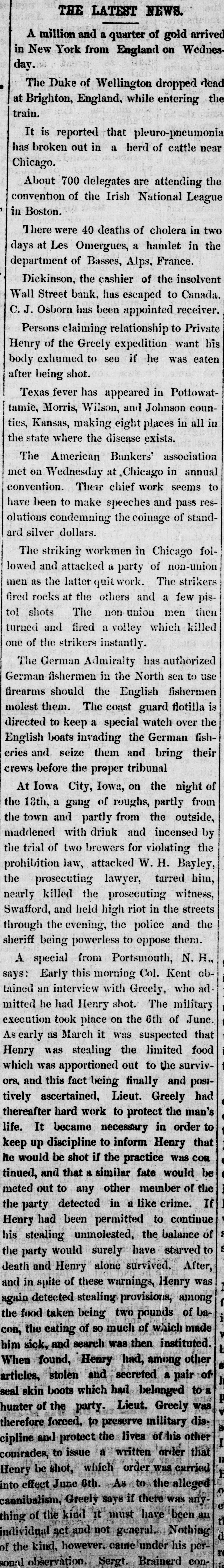 # THE LATEST NEWS. A million and a quarter of gold arrived in New York from England on Wednesday. The Duke of Wellington dropped dead at Brighton, England, while entering the train. It is reported that pleuro-pneumonia has broken out in a herd of cattle near Chicago. About 700 delegates are attending the convention of the Irish National League in Boston. There were 40 deaths of cholera in two days at Les Omergues, a hamlet in the department of Basses, Alps, France. Dickinson, the cashier of the insolvent Wall Street bank, has escaped to Canada. C. J. Osborn has been appointed receiver. Persons claiming relationship to Private Henry of the Greely expedition want his body exhumed to see if he was eaten after being shot. Texas fever has appeared in Pottowattamie, Morris, Wilson, and Johnson counties, Kansas, making eight places in all in the state where the disease exists. The American Bankers' association met on Wednesday at Chicago in annual convention. Their chief work seems to have been to make speeches and pass resolutions condemning the coinage of standard silver dollars. The striking workmen in Chicago followed and attacked a party of non-union men as the latter quit work. The strikers fired rocks at the others and a few pistol shots The non union men then turned and fired a volley which killed one of the strikers instantly. The German Admiralty has authorized German fishermen in the North sea to use firearms should the English fishermen molest them. The coast guard flotilla is directed to keep a special watch over the English boats invading the German fisheries and seize them and bring their crews before the proper tribunal At Iowa City, Iowa, on the night of the 13th, a gang of roughs, partly from the town and partly from the outside, maddened with drink and incensed by the trial of two brewers for violating the prohibition law, attacked W. H. Bayley, the prosecuting lawyer, tarred him, nearly killed the prosecuting witness, Swafford, and held high riot in the streets through the evening, the police and the sheriff being powerless to oppose them. A special from Portsmouth, N. H., says: Early this morning Col. Kent obtained an interview with Greely, who admitted he had Henry shot. The military execution took place on the 6th of June. As early as March it was suspected that Henry was stealing the limited food which was apportioned out to the survivors, and this fact being finally and positively ascertained, Lieut. Greely had thereafter hard work to protect the man's life. It became necessary in order to keep up discipline to inform Henry that he would be shot if the practice was continued, and that a similar fate would be meted out to any other member of the the party detected in a like crime. If Henry had been permitted to continue his stealing unmolested, the balance of the party would surely have starved to death and Henry alone survived. After, and in spite of these warnings, Henry was again detected stealing provisions, among the food taken being two pounds of bacon, the eating of so much of which made him sick, and search was then instituted. When found, Henry had, among other articles, stolen and secreted a pair of seal skin boots which had belonged to a hunter of the party. Lieut. Greely was therefore forced, to preserve military discipline and protect the lives of his other comrades, to issue a written order that Henry be shot, which order was carried into effect June 6th. As to the alleged cannibalism, Greely says if there was anything of the kind it must have been an individual act and not general. Nothing of the kind, however, came under his personal observation. Sergt. Brainerd con- i P I 1 e t