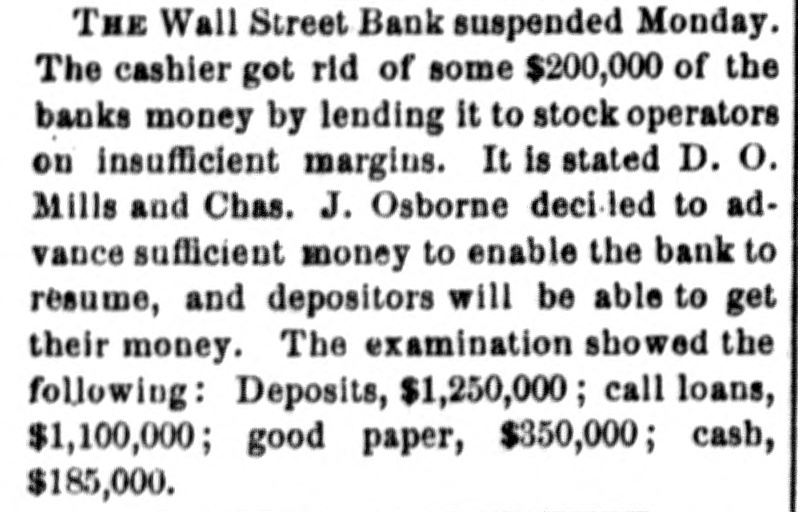 THE Wall Street Bank suspended Monday. The cashier got rid of some $200,000 of the banks money by lending it to stock operators on insufficient margins. It is stated D. O. Mills and Chas. J. Osborne decided to advance sufficient money to enable the bank to resume, and depositors will be able to get their money. The examination showed the following: Deposits, $1,250,000; call loans, $1,100,000; good paper, $350,000; cash, $185,000.