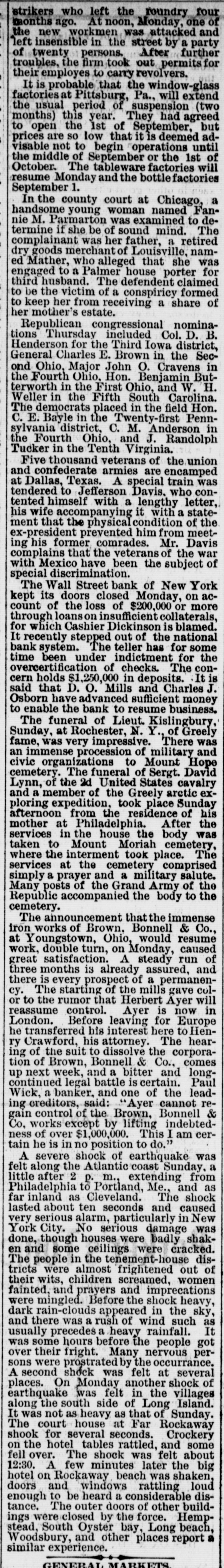 strikers who left the roundry four months ago. At noon, Monday, one of the new workmen was attacked and left insensible in the street by a party of twenty persons. After further troubles, the firm took out permits for their employes to carry revolvers. It is probable that the window-glass factoriesat Pittsburg, Pa., will extend the usual period of suspension (two months) this year. They had agreed to open the 1st of September, but prices are so low that it is deemed advisable not to begin operations until the middle of September or the 1st of October. The tableware factories will resume Monday and the bottle factories September 1. In the county court at Chicago, a handsome young woman named Fannie M. Parmarton was examined to determine if she be of sound mind. The complainant was her father, a retired dry goods merchant of Louisville, named Mather, who alleged that she was engaged to a Palmer house porter for third husband. The defendent claimed to be the victim of a conspiricy formed to keep her from receiving a share of her mother's estate. Republican congressional nominations Thursday included Col. D. B. Henderson for the Third Iowa district, General Charles E. Brown in the Second Ohio, Major John O. Cravens in the Fourth Ohio, Hon. Benjamin Butterworth in the First Ohio, and W. H. Weller in the Fifth South Carolina. The democrats placed in the field Hon. C. E. Bayle in the Twenty-first Pennsylvania district, C. M. Anderson in the Fourth Ohio, and J. Randolph Tucker in the Tenth Virginia. Five thousand veterans of the union and confederate armies are encamped at Dallas, Texas. A special train was tendered to Jefferson Davis, who contented himself with a lengthy letter, his wife accompanying it with a statement that the physical condition of the ex-president prevented him from meeting his former comrades. Mr. Davis complains that the veterans of the war with Mexico have been the subject of special discrimination. The Wall Street bank of New York kept its doors closed Monday, on account of the loss of $200,000 or more through loanso insufficient collaterals, for which Cashier Dickinson is blamed. It recently stepped out of the national bank system. The teller has for some time been under indictment for the overcertification of checks. The concern holds ,250,000 in deposits. It is 'f Charles pure Wills 'O '(I that pies Osborn have advanced sufficient money to enable the bank to resume business. The funeral of Lieut. Kislingbury, Sunday, at Rochester, N. Y., of Greely fame, was very impressive. There was an immense procession of military and civic organizations to Mount Hope cemetery. The funeral of Sergt. David Lynn, of the 2d United States cavalry and a member of the Greely aretic exploring expedition, took place Sunday afternoon from the residence of his mother at Philadelphia. After the services in the house the body was taken to Mount Moriah cemetery, where the interment took place. The services at the cemetery comprised simply a prayer and a military salute. Many posts of the Grand Army of the Republic accompanied the body to the cemetery. The announcement that the immense iron works of Brown, Bonnell & Co., at Youngstown, Ohio, would resume work, double turn, on Monday, caused great satisfaction. A steady run of three months is already assured, and there is every prospect of a permanency. The starting of the mills gave color to the rumor that Herbert Ayer will reassume control. Ayer is now in London. Before leaving for Europe he transferred his interest here to Henry Crawford, his attorney. The hearing of the suit to dissolve the corporation of Brown, Bonnell & Co., comes up next week, and a bitter and longcontinued legal battle is certain. Paul Wick, a banker, and one of the leading creditors, said: Ayer cannot regain control of the Brown, Bonnell & Co, works except by lifting indebtedness of over $1,000,000. This I am certain he is in no position to do. A severe shock of earthquake was felt along the Atlantic coast Sunday, a little after 2 p. m., extending from Philadelphia to Portland, Me., and as far inland as Cleveland. The shock lasted about ten seconds and caused very serious alarm, particularly in New York City. No serious damage was done, though houses were badly shaken and some ceilings were cracked. The people in the tenement-house districts were almost frightened out of their wits, children screamed, women fainted, and prayers and imprecations were mingled. Before the shock heavy, dark rain-clouds appeared in the sky, and there was a rush of wind such as usually precedes a heavy rainfall. It was some hours before the people got over their fright. Many nervous persons were prostrated by the occurrance. A second shock was felt at several places. On Monday another shock of earthquake was felt in the villages along the south side of Long Island. It was not as heavy as that of Sunday. The court house at Far Rockaway shook for several seconds. Crockery on the hotel tables rattled, and some fell over. The shock was felt about 12:30. A few minutes later the big hotel on Rockaway beach was shaken,