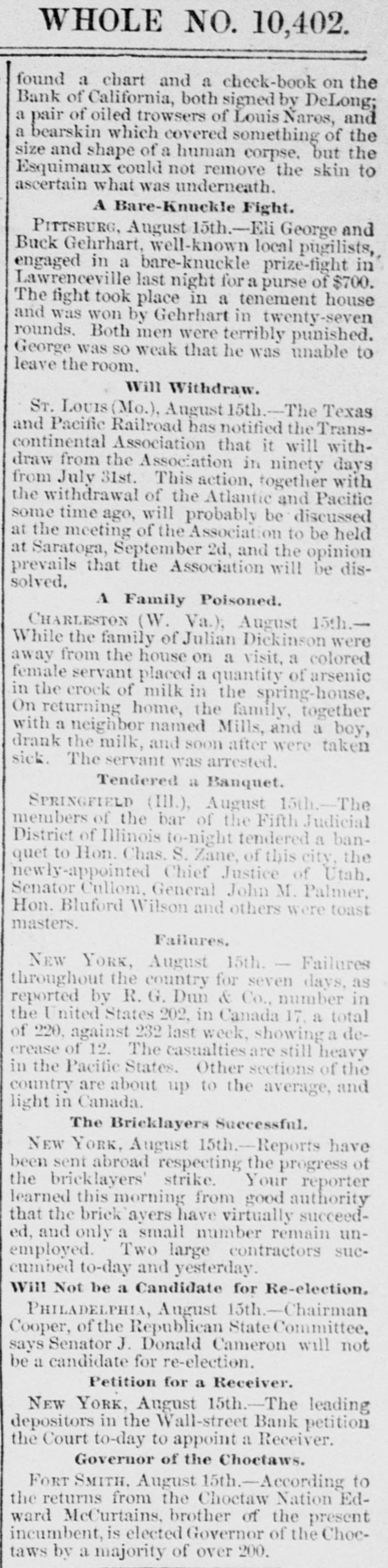 WHOLE NO. 10,402. found a chart and a check-book on the Bank of California, both signed by DeLong; a pair of oiled trowsers of Louis Naros, and a bearskin which covered something of the size and shape of a human corpse, but the Esquimaux could not remove the skin to ascertain what was underneath. A Bare-Knnekle Fight. PITTSBURG, August 15th.-Eli George and Buck Gehrhart, well-known local pugilists, engaged in a bare-knuckle prize-fight in Lawrenceville last night for a purse of $700. The fight took place in a tenement house and was won by Gehrhart in twenty-seven rounds. Both men were terribly punished. George was SO weak that he was unable to leave the room. Will Withdraw. ST. Louis (Mo.), August 15th.-The Texas and Pacific Railroad has notified the Transcontinental Association that it will withdraw from the Association in ninety days from July 31st. This action, together with the withdrawal of the Atlantic and Pacific some time ago, will probably be discussed at the meeting of the Association to be held at Saratoga, September 2d, and the opinion prevails that the Association will be dissolved. A Family Poisoned. CHARLESTON (W. Va.); August 15th.While the family of Julian Dickinson were away from the house on a visit, a colored female servant placed a quantity of arsenic in the crock of milk in the spring-house, On returning home, the family, together with a neighbor named Mills, and a boy, drank the milk, and soon after were taken sick The servant was arrested. Tendered a Banquet. SPRINGFIELD (III.), August 15th.-The members of the bar of the Fifth Judicial District of Illinois to-night tendered a banquet to Hon. Chas. S. Zane, of this city, the newly-appointed Chief Justice of Utah. Senator Cullom, General John M. Palmer, Hon. Bluford Wilson and others were toast masters. Failures. NEW YORK, August 15th. - Failures throughout the country for seven days, as reported by R. G. Dun & Co., number in the United States 202, in Canada 17. a total of 220, against 232 last week, showing a decrease of 12. The casualties are still heavy in the Pacific States. Other sections of the country are about up to the average, and light in Canada. The Bricklayers Successful. NEW YORK, August 15th.-Reports have been sent abroad respecting the progress of the bricklayers' strike. Your reporter learned this morning from good authority that the brick layers have virtually succeeded, and only a small number remain unemployed. Two large contractors succumbed to-day and yesterday. Will Not be a Candidate for Re-election. PHILADELPHIA, August 15th.-Chairman Cooper, of the Republican StateCommittee, says Senator J. Donald Cameron will not be a candidate for re-election. Petition for a Receiver. NEW YORK, August 15th.-The leading depositors in the Wall-street Bank petition the Court to-day to appoint a Receiver. Governor of the Choctaws. FORT SMITH. August 15th.-According to the returns from the Choctaw Nation Edward McCurtains, brother of the present incumbent, is elected Governor of the Choctaws by a majority of over 200.