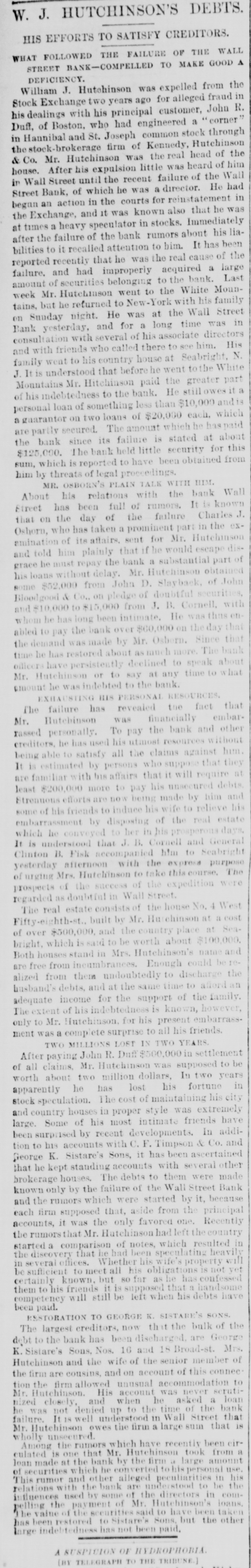 W. J. U HIS EFFORTS TO SATISFY CREDITORS. WHAT FOLLOWED THE FAILURE OF THE WALL STREET BANK-COMPELLED TO MAKE GOOD A DEFICIENCY. William J. Hutchinson was expelled from the Stock Exchange two years ago for alleged fraud in his dealings with his principal customer, John R. Duff, of Boston, who had engineered a "corner in Hannibal and St. Joseph common stock through the stock-brokerage firm of Kennedy, Hutchinson Co. Mr. Hutchinson was the real head of the house. After his expulsion little was heard of him in Wall Street until the recent failure of the Wall Street Bank, of which he was a director. He had began an action in the courts for reinstatement in the Exchange, and it was known also that he was at times a heavy speculator in stocks. Immediately after the failure of the bank rumors about his liabilities to it recalled attention to him. It has been reported recently that he was the real cause of the failure. and had improperly acquired a large amount of securities belonging to the bank. Last week Mr. Hutchinson went to the White Mountains, but he returned to New-York with his family on Sunday night. He was at the Wall Street Bank yesterday, and for a long time was in consultation with several of his associate directors and with friends who called there to see him. His family went to his country house Seabright. N. J.It understood that before he went to the White Mountains Mr. Hitchinson paid the greater part of his indebtedness to the bank. He still owes a personal loan of something less than $10,000 and a gaarantor on two loans of $20,000 each. which partly secured. The amount which he haspaid the bank since its failure is stated at about $125,000. The bank held little security for this sum, which is reported to have been obtained from him by threats of legal proceedings. MR. OSBORN'S PLAIN TALK WITH HIM. About his relations with the bank Wall Street has been full of rumors. It is known that on the day of the failure Charles J. Oshorn, " he has taken a prominent part in the exemination of its affairs. sent for Mr. Hutchinson and told him plainly that if he would escape grace he must repay the bank a substantial part of sloans without delay. Mr. Hutchinson obtained some $52,000 from John D. Slayback, of John Bloodgood & Co., on pledge of doubtful securities, $10,000 to $15,000 from J. B. Cornell, with whom he has long been intimate. He was thus enabled to pay the bank over $60,000 on the day that the demand was made by Mr. Osbern. Since that time he has restored about more. The bank officers have persistently declined to speak about Mr. Hutchinson or to say at any time to what amount he was indebted to the bank. EXHAUSTING HIS PERSONAL RESOURCES The failure has revealed the fact that Mr. Hutebinson was financially embarrassed personally. To pay the bank and other creditors, he has used his utmost resources without being able to satisfy all the claims against him. It is estimated by persons who suppose that they familiar with his affairs that will require at least $200,000 more to pay his unsecured debts Strenuous efforts are now being made by him and some of friends to induce his wife to relieve his embarrassment by disposing of the real estate which he conveyed to her in his prosperous days. It is understood that J. B. Cornell and General Clinton B. Fisk accompanied him to Seabright yesterday afternoon with the express purpose of urging Mrs. Hutchinson to take this course, The prospects of the success of the expedition were regarded as doubtful in Wall Street. The real estate consists of the house No. 4 West Fifty-eighth-st.. built by Mr. Hu chinson at a cost of over $500,000. and the country place at Seabright, which is said to be worth about $100,000. Both houses stand in Mrs. Hutchinson's name and free from incumbrances. Enough could be 10alized from them undoubtedly to discharge the husband's debts, and at the same time to afford an adequate income for the support of the family. exextent of indebtedness is known, however, only to Mr. Hutchinson. for his present embarrassment was a complete surprise to all his friends. TWO MILLIONS LOST IN TWO YEARS. After paying John R. Duff $500,000 in settlement of all claims, Mr. Hutchinson was supposed to be worth about two million dollars, In two years apparently he has lost his fortune in stock speculation. The cost of maintaining his city and country houses in proper style was extremely large. Some of his most intimate friends have been surprised by recent developments. In addition to his accounts with F. Timpson & Co. and George K. Sistare's Sons, it has been ascertained that he kept standing accounts with several other brokerage houses The debts to them were made known only by the failure of the Wall Street Bank and the rumors which were started by it. because each firm supposed that, aside from the principal accounts, it was the only favored one. Recently the rumors tha Mr. Hatchinson had left the country started a comparison of notes, which resulted in the discovery that had been speculating heavil in several offices. Whether his fe's property will be sufficient to meet all his obligations is not yet certainly known. but 80 far as he has confessed them to his friends it is supposed that a handsome competency will still be left when his debts have been paid. RESTORATION TO GEORGE K. SISTARE'S SONS. The largest creditors, now that the bulk of the debt to the bank has been discharged, are George K.Sistare's Sons. Nos. 16 and 18 Broad-st. Mrs. Hutchinson and the wife of the senior member of the firm are cousins, and on account of this connection the firm allowed unusual accommodation to Mr. Hutchinson. His account was never scrutinized closely, and when he asked a loan he was not denied up to the time of the bank failure. It is well understood in Wall Street that Mr.Hutchinson owes the firm a large that 18 wholly unsecured. Among the rumors which have recently been circulated is one that Mr. Hutchinson took from a loan made at the bank by 