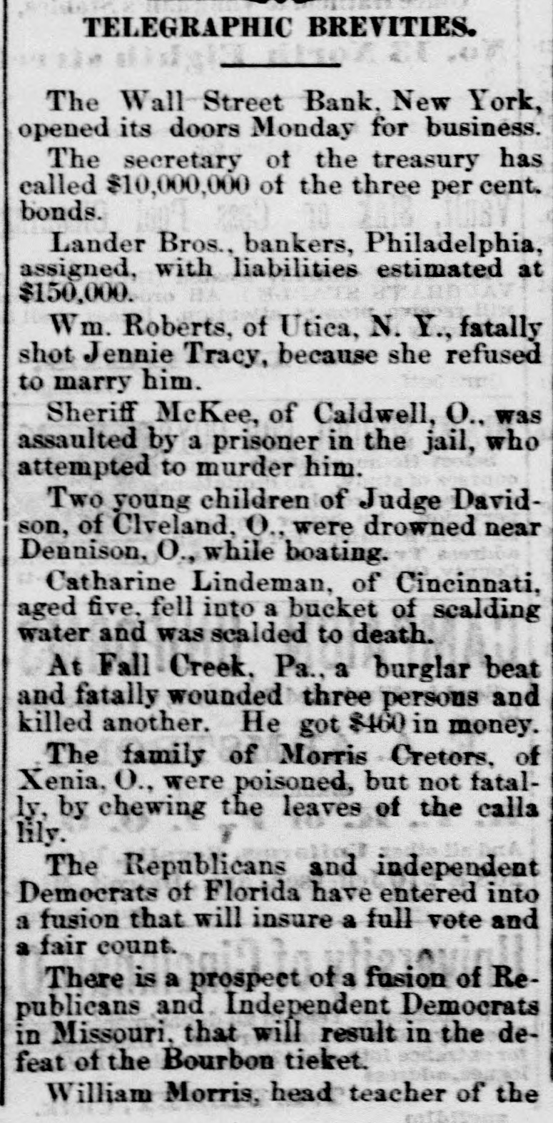 TELEGRAPHIC BREVITIES. The Wall Street Bank, New York, opened its doors Monday for business. The secretary of the treasury has called $10,000,000 of the three per cent. bonds. Lander Bros., bankers, Philadelphia, assigned, with liabilities estimated at $150,000. Wm. Roberts, of Utica, N. Y., fatally shot Jennie Tracy, because she refused to marry him. Sheriff McKee, of Caldwell, O., was assaulted by a prisoner in the jail, who attempted to murder him. Two young children of Judge Davidson, of Clveland, 0., were drowned near Dennison, 0,, while boating. Catharine Lindeman, of Cincinnati, aged five, fell into a bucket of scalding water and was scalded to death. At Fall Creek, Pa., a burglar beat and fatally wounded three persons and killed another. He got $460 in money. The family of Morris Cretors, of Xenia, 0., were poisoned, but not fatally, by chewing the leaves of the calla lily. The Republicans and independent Democrats of Florida have entered into a fusion that will insure a full vote and a fair count. There is a prospect of a fusion of Republicans and Independent Democrats in Missouri, that will result in the defeat of the Bourbon tieket. William Morris, head teacher of the