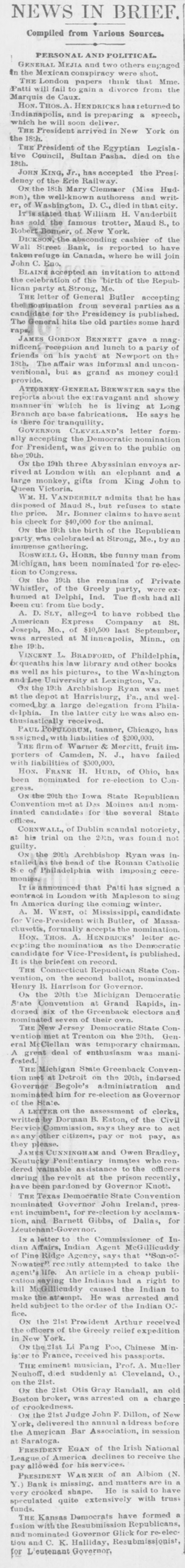 NEWS IN BRIEF Compiled from Various Sources. PERSONAL AND POLITICAL GENERAL MEJIA and others engaged In the Mexican conspiracy were shot. THE London papers think that Mme. Patti will fail to gain a divorce from the Marquis de Caux. HON. THOS. A. HENDRICKS has returned to Indianapolis, and is preparing a speech, which he will soon deliver. THE President arrived in New York on the 18th. THE President of the Egyptian Legisla tive Council, Sultan Pasha. died on the 18th. JOHN KING, Jr., has accepted the Presi dency of the Erie Railway Hud (Miss ON the 18th Mary Clemmer son), the well-known authoress and writer, of W ashington, D. C., died in that city. Iris stated that William H. Vanderbilt has sold the famous trotter, Maud S., to Robert Bonner, of New York. DICKSON, absconding cashier of the Wall Street Bank, is reported to have taken refuge in Canada, where he will join John C. Eno. BLAINE accepted an invitation to attend the celebration of the birth of the Republican party at Me. THE letter of General Butler accepting thelformination from several parties a candidate for the Presidency is published. The General hits the old parties some hard raps, JAMES GORDON BENNETT gave mag nificent reception and lunch to party friends on his yacht at Newport on the 18th. The affair was informal and unconventional, but as grand as money could provide. ATTORNEY BREWSTER says the reports about and showy manner in which he is living at Long Branch are base fabrications. He says is there for tranquility. GOVERNOR CLEVELAND'S letter formally accepting the Democratic nomination for President, was given to the public on the 20th. ON the 19th three Abyssinian envoys rived at London with an elephant and large monkey, gifts from King John to Queen Victoria. WM. H. VANDERBILT admits that he has disposed of Maud S., but refuses to the price. Mr. Bonner claims to his check for $40,000 for the animal. ON the 19th the birth of the Republican party was at Strong, Me., by an immense gathering. ROSWELL G. HORR, the funny man from Michigan, has been nominated 'for re-election to Congress ON the 19th the remains of Private Whistler, of the Greely party, were humed at Delphi, Ind. The flesh had all been cu from the body A. D. SLY, alleged to have robbed the American Express Company at St. Joseph, Mo., of $10,500 last September, on was arrested at M inneapolis, Minn., the 19th. VINCENT L. BRADFORD, of Phildelphia, bequeaths his law library and other books as well as his pictures, to the shington and Lee ersity at Lex ington, Va. ON the 19th Archbishop Ryan was met at the depot at Harrisburg, Pa., and wel comed_by a large delegation from Phila delphia. In the latter city he also thusiastically received. PAUL POPULORUM. tanner, Chicago, has assigned,with liabilities of $200,000. THE firm of Warner & Merritt, fruit importers of Camden, N. J., have failed with liabilities of $300,000. HON. FRANK H. HURD, of Ohio, has been nominated for re-election to Congress. ON the 20th the Iowa State Republican Convention met at Das Moines and nominated candidates for the several State offices. CORNWAL of Dublin scandal notoriety at his trial on the 20th, was found not guilty. ON the 20th Archbishop Ryan was installed as the head of the Roman Catholic See of Philadelphia with imposing ceremonies Ir is announced that Patti has signed contract in London with Mapleson to sing in America during the coming winter. A. M. WEST, of Mississippi, candidate for Vice President with Butler, of Massachusetts, formally accepts the HON. THOS. A. H ENDRICKS' letter cepting the the candidate for Vice President, is published It is the briefest on record. THE Repuolican State Conon the ballot, nominated for B. Harrison Henry ON the 20th the Michigan Democratic State Con at Grand Rapids, dorsed six of the Greenback electors their of nominated seven own. THE New Jersey Democratic State vention met at Trenton on the 20th. General McClellan was temporary chairman A great deal of enthusiasm manifested. THE Michigan State Greenback Convention met at Detroit on the 20th, indersed Governor Begole's administration and nominated him for re-election as Governor of State the on of LETTER clerks, written-by Dorman B. Eaton, of the Civil Service Con they are to act as any other citizens, pay or not pay, as they please. JAMESCUNNINGHA and Owen Bradley, Kentucky Penitentiary inmates who dered valuable sistance to the officers during the revolt at the prison recently, have been pardoned by Governor Knott. THE Texas Democratic State Convention nominated Governor John Ireland present incumbent, for by acclams tion, and Barnett Gibbs, of Dallas, for Lieutenant-0 IN letter to the Commissione of In dian Affairs, Indian Agent McG illicuddy of Pine Ridge Agency, says that "Son-ofNowater" cently attempted to take the agent's life. An article in cheap publication saying the Indians had right to kill McGillieuddy caused the Indian to make the attempt. He was arrested and held subject to the order of the Indian O: fice. ON the 21st President Arthur received the officers of the Greely relief expedition in New York. ON the 21st Li Fang Poo, Chinese Minister to France, his passports. THE eminent musician, Prof. A. Mueller Neuhoff, died suddenly at Cleveland, O., on the 21st. ON the 21st Otis Gray Randall, an old Boston broker, arrested on a charge of crookedness. ON the 21st Judge John F. Dillon, of New York, delivered the annual ddress before the American Bar Association, in session Saratoga. at PRESIDENT EGAN of the Irish National League of America declines to receive the pay allowed for his PRESIDENT W ARNER of an Albion (N. Y.) Bank is missing, and matters very crooked shape. He said to have speculated quite extensively with trust funds. THE Kansas Democrats have formed fusion with the Resubmission Republicans, and nominated Governor Glick for re-electiou and C. K. Halliday, Resubmissionist, for L'eutenant Governor,