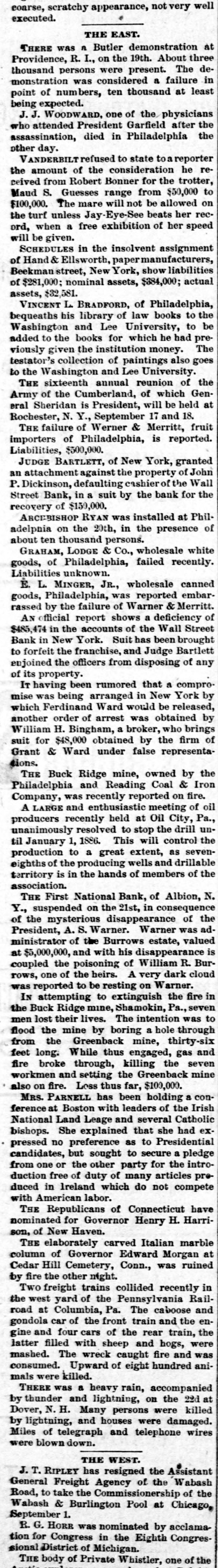 coarse, scratchy appearance, not very well executed. THE EAST. THERE was a Butler demonstration at Providence, R. I., on the 19th. About three thousand persons were present. The demonstration was considered a failure in point of numbers, ten thousand at least being expected. J.J. WOODWARD, one of the physicians who attended President Garfield after the assassination, died in Philadelphia the other day. VANDERBILT refused to state toa reporter the amount of the consideration he received from Robert Bonner for the trotter, Maud S. Guesses range from $50,000 to $100,000. The mare will not be allowed on the turf unless Jay-Eye-See beats her record, when a free exhibition of her speed will be given. SCHEDULES in the insolvent assignment of Hand & Ellsworth, papermanufacturers, Beekman street, New York, show liabilities of $281,000; nominal assets, $384,000; actual assets, $32,581. VINCENT L. BRADFORD, of Philadelphia, bequeaths his library of law books to the Washington and Lee University, to be added to the books for which he had previously given the institution money. The testator's collection of paintings also goes to the Washington and Lee University. THE sixteenth annual reunion of the Army of the Cumberland, of which General Sheridan is President, will be held at Rochester, N. Y., September 17 and 18. THE failure of Werner & Merritt, fruit importers of Philadelphia, is reported. Liabilities, $500,000. JUDGE BARTLETT, of New York, granted an attachment against the property of John P. Dickinson, defaulting cashier of the Wall Street Bank, in a suit by the bank for the recovery of $150,000. ARCEBISHOP RYAN was installed at Philadelpnia on the 20th, in the presence of about ten thousand persons. GRAHAM, LODGE & Co., wholesale white goods, of Philadelphia, failed recently. Liabilities unknown. E. L. MINGER, JR., wholesale canned goods, Philadelphia, was reported embarrassed by the failure of Warner & Merritt. AN official report shows a deficiency of $485,474 in the accounts of the Wall Street Bank in New York. Suit has been brought to forfeit the franchise, and Judge Bartlett enjoined the officers from disposing of any of its property. IT having been rumored that a compromise was being arranged in New York by which Ferdinand Ward would be released, another order of arrest was obtained by William H. Bingham, a broker, who brings suit for $48,000 obtained by the firm of Grant & Ward under false representations. THE Buck Ridge mine, owned by the Philadelphia and Reading Coal & Iron Company, was recently reported on fire. A LARGE and enthusiastic meeting of oil producers recently held at Oil City, Pa., unanimously resolved to stop the drill until January 1, 1886. This will control the production to a great extent, as seveneighths of the producing wells and drillable territory is in the hands of members of the association. THE First National Bank, of Albion, N. Y., suspended on the 21st, in consequence of the mysterious disappearance of the President, A. S. Warner. Warner was administrator of the Burrows estate, valued at $5,000,000, and with his disappearance is coupled the poisoning of William R. Burrows, one of the heirs. A very dark cloud was reported to be resting on Warner. IN attempting to extinguish the fire in the Buck Ridge mine, Shamokin, Pa., seven men lost their lives. The intention was to flood the mine by boring a hole through from the Greenback mine, thirty-six feet long. While thus engaged, gas and fire broke through, killing the seven workmen and setting the Greenback mine also on fire. Loss thus far, $100,000. MRS. PARNELL has been holding a conference at Boston with leaders of the Irish National Land Leage and several Catholic bishops. She explained that she had expressed no preference as to Presidential candidates, but sought to secure a pledge from one or the other party for the introduction free of duty of many articles produced in Ireland which do not compete with American labor. THE Republicans of Connecticut have nominated for Governor Henry H. Harrison, of New Haven. THE elaborately carved Italian marble column of Governor Edward Morgan at Cedar Hill Cemetery, Conn., was ruined by fire the other night. Two freight trains collided recently in the west yard of the Pennsylvania Railroad at Columbia, Pa. The caboose and gondola car of the front train and the engine and four cars of the rear train, the latter filled with sheep and hogs, were mashed. The wreck caught fire and was consumed. Upward of eight hundred animals were killed. THERE was a heavy rain, accompanied by thunder and lightning, on the 22d at Dover, N. H. Many persons were killed by lightning, and houses were damaged. Miles of telegraph and telephone wires were blown down. THE WEST. J. T. RIPLEY has resigned the Assistant General Freight Agency of the Wabash Road, to take the Commissionership of the Wabash & Burlington Pool at Chicago, September 1. R. G. HORR was nominated by acclamation for Congress in the Eighth Congressional District of Michigan. THE body of Private Whistler, one of the