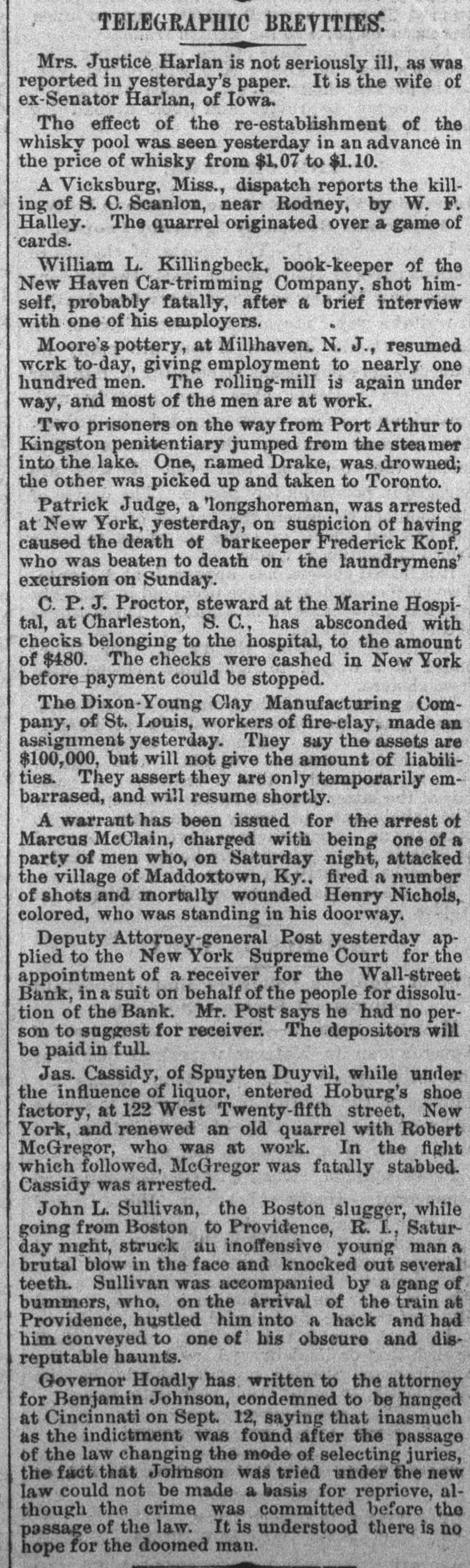 TELEGRAPHIC BREVITIES. Mrs. Justice Harlan is not seriously ill, as was reported in yesterday's paper. It is the wife of ex-Senator Harlan, of Iowa. The effect of the re-establishment of the whisky pool was seen yesterday in an advance in the price of whisky from $1.07 to $1.10. A Vicksburg, Miss., dispatch reports the killing of S. C. Scanlon, near Rodney, by W. F. Halley. The quarrel originated over a game of cards. William L. Killingbeck, book-keeper of the New Haven Car-trimming Company. shot himself, probably fatally, after a brief interview with one of his employers. Moore's pottery, at Millhaven. N. J., resumed work to-day, giving employment to nearly one hundred men. The rolling-mill is again under way, and most of the men are at work. Two prisoners on the way from Port Arthur to Kingston penitentiary jumped from the steamer into the lake. One, named Drake, was drowned; the other was picked up and taken to Toronto. Patrick Judge, a "longshoreman, was arrested at New York, yesterday, on suspicion of having caused the death of barkeeper Frederick Kopf. who was beaten to death on the laundrymens' excursion on Sunday. C. P. J. Proctor, steward at the Marine Hospital, at Charleston, S. C., has absconded with checks belonging to the hospital, to the amount of $480. The checks were cashed in New York before payment could be stopped. The Dixon-Young Clay Manufacturing Company, of St. Louis, workers of fire-clay, made an assignment yesterday. They say the assets are $100,000, but will not give the amount of liabilities. They assert they are only temporarily embarrased, and will resume shortly. A warrant has been issued for the arrest of Marcus McClain, charged with being one of a party of men who, on Saturday night, attacked the village of Maddoxtown, Ky., fired a number of shots and mortally wounded Henry Nichols, colored, who was standing in his doorway. Deputy Attorney-general Post yesterday applied to the New York Supreme Court for the appointment of a receiver for the Wall-street Bank, in a suit on behalf of the people for dissolution of the Bank. Mr. Post says he had no person to suggest for receiver. The depositors will be paid in full. Jas. Cassidy, of Spuyten Duyvil, while under the influence of liquor, entered Hoburg's shoe factory, at 122 West Twenty-fifth street, New York, and renewed an old quarrel with Robert McGregor, who was at work. In the fight which followed, McGregor was fatally stabbed. Cassidy was arrested. John L. Sullivan, the Boston slugger, while going from Boston to Providence, R. I., Saturday mght, struck an inoffensive young man a brutal blow in the face and knocked out several teeth. Sullivan was accompanied by a gang of bummers, who, on the arrival of the train at Providence, hustled him into a hack and had him conveyed to one of his obscure and disreputable haunts. Governor Hoadly has. written to the attorney for Benjamin Johnson, condemned to be hanged at Cincinnati on Sept. 12, saying that inasmuch as the indictment was found after the passage of the law changing the mode of selecting juries, the fact that Johnson was tried under the new law could not be made a basis for reprieve, although the crime was committed before the passage of the law. It is understood there is no hope for the doomed man.