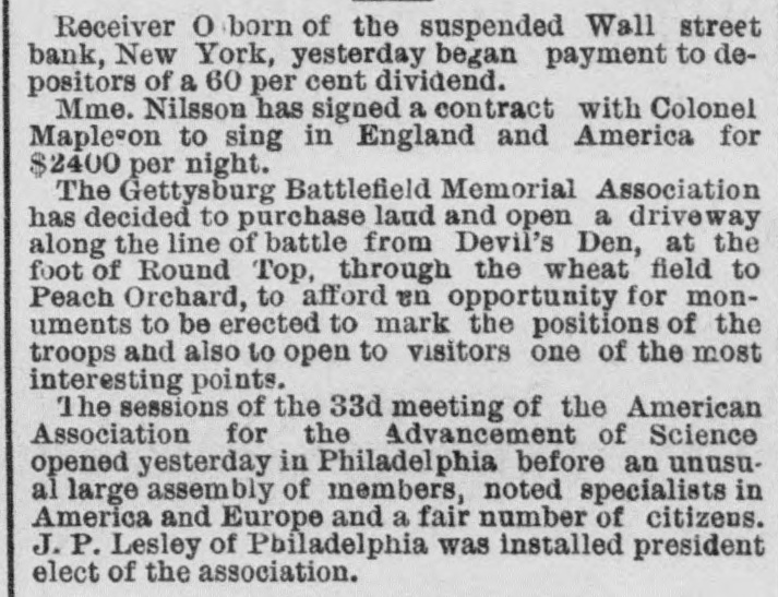 Receiver O born of the suspended Wall street bank, New York, yesterday began payment to depositors of a 60 per cent dividend. Mme. Nilsson has signed a contract with Colonel Maple-on to sing in England and America for $2400 per night. The Gettysburg Battlefield Memorial Association has decided to purchase land and open a driveway along the line of battle from Devil's Den, at the foot of Round Top, through the wheat field to Peach Orchard, to afford an opportunity for monuments to be erected to mark the positions of the troops and also to open to visitors one of the most interesting points. The sessions of the 33d meeting of the American Association for the Advancement of Science opened yesterday in Philadelphia before an unusual large assembly of members, noted specialists in America and Europe and a fair number of citizens. J. P. Lesley of Philadelphia was installed president elect of the association.