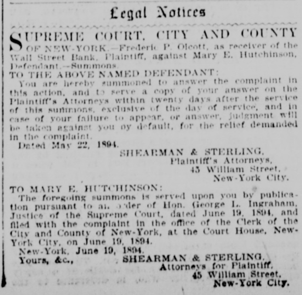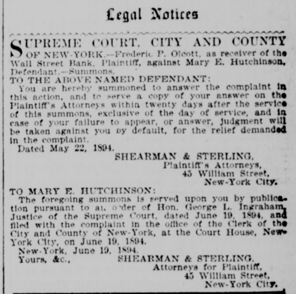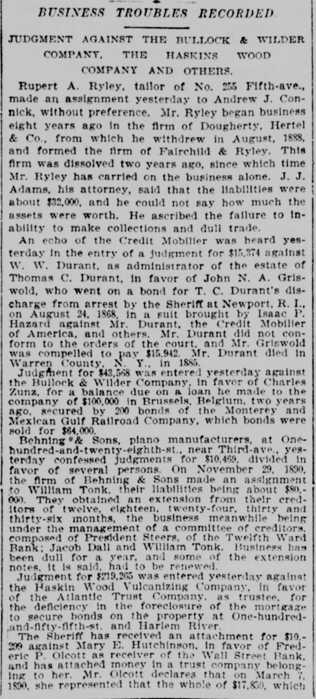 BUSINESS TROUBLES RECORDED JUDGMENT AGAINST THE BULLOCK & WILDER COMPANY, THE HASKINS WOOD COMPANY AND OTHERS. Rupert A. Ryley, tailor of No. 255 Fifth-ave., made an assignment yesterday to Andrew J. Connick, without preference. Mr. Ryley began business eight years ago in the firm of Dougherty, Hertel & Co., from which he withdrew in August, 1888, and formed the firm of Fairchild & Ryley. This firm was dissolved two years ago, since which time Mr. Ryley has carried on the business alone. J. J. Adams, his attorney, said that the liabilities were about $32,000, and he could not say how much the assets were worth. He ascribed the failure to inability to make collections and dull trade. An echo of the Credit Mobilier was heard yesterday In the entry of a judgment for $15,374 against W. W. Durant, as administrator of the estate of Thomas C. Durant, in favor of John N. A. Griswold, who went on a bond for T. C. Durant's discharge from arrest by the Sheriff at Newport, R. I., on August 24, 1868, in a suit brought by Isaac P. Hazard against Mr. Durant, the Credit Mobilier of America, and others. Mr. Durant did not conform to the orders of the court, and Mr. Griswold was compelled to pay $15,942. Mr. Durant died in Warren County, N. Y., in 1885. Judgment for $43,568 was entered yesterday against the Bullock & Wilder Company, in favor of Charles Zunz, for a balance due on a loan he made to the company of $100,000 in Brussels, Belgium, two years ago, secured by 200 bonds of the Monterey and Mexican Gulf Railroad Company, which bonds were sold for $64,000. Behning & Sons, plano manufacturers, at Onehundred-and-twenty-eighth-st., near Third-ave., yesterday confessed judgments for $10,469. divided in favor of several persons. On November 29, 1890, the firm of Behning & Sons made an assignment to William Tonk. their liabilities being about $80,000. They obtained an extension from their creditors of twelve, eighteen. twenty-four, thirty and thirty-six months, the business meanwhile being under the management of a committee of creditors. composed of President Steers, of the Twelfth Ward Bank; Jacob Dall and William Tonk. Business has been dull for a year, and some of the extension notes, it is said, had to be renewed. Judgment for $219,265 was entered yesterday against the Haskin Wood Vulcanizing Company, in favor of the Atlantic Trust Company, as trustee, for the deficiency in the foreclosure of the mortgage to secure bonds on the property at One-hundredand-fifty-fifth-st. and Harlem River. The Sheriff has received an attachment for $10.299 against Mary E. Hutchinson. in favor of Frederic P. Olcott as receiver of the Wall Street Bank. and has attached money in a trust company belonging to her. Mr. Olcott declares that on March 7, 1890, she represented that the whole of $17,850. which
