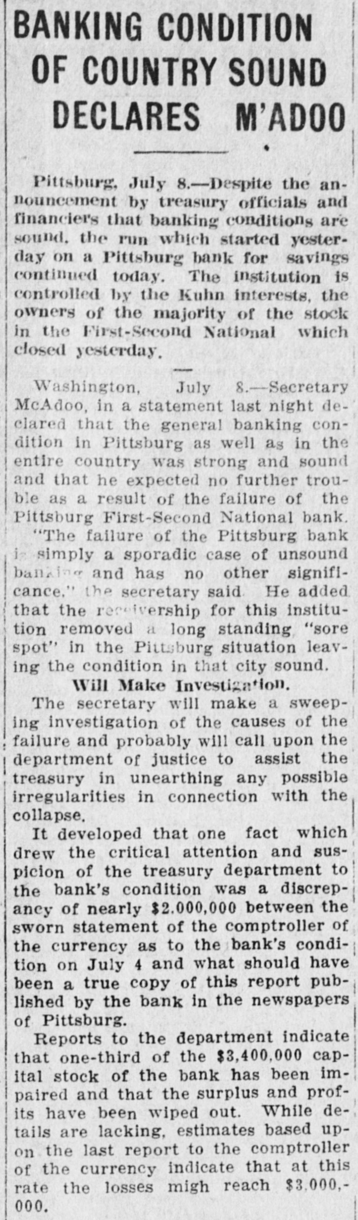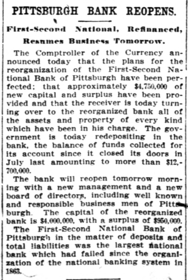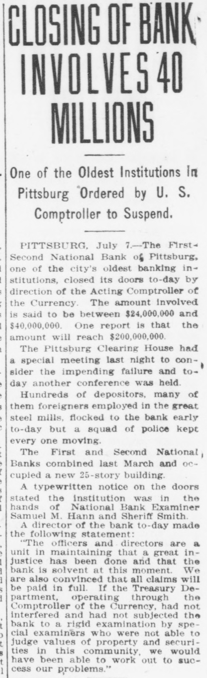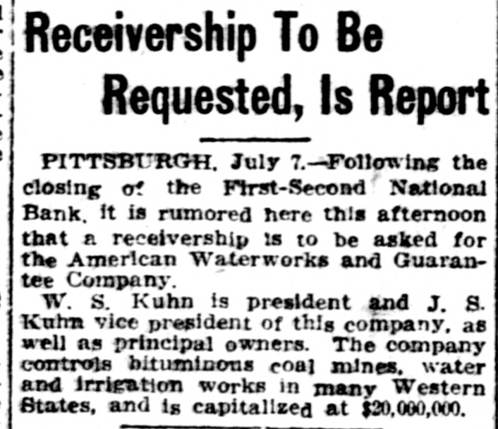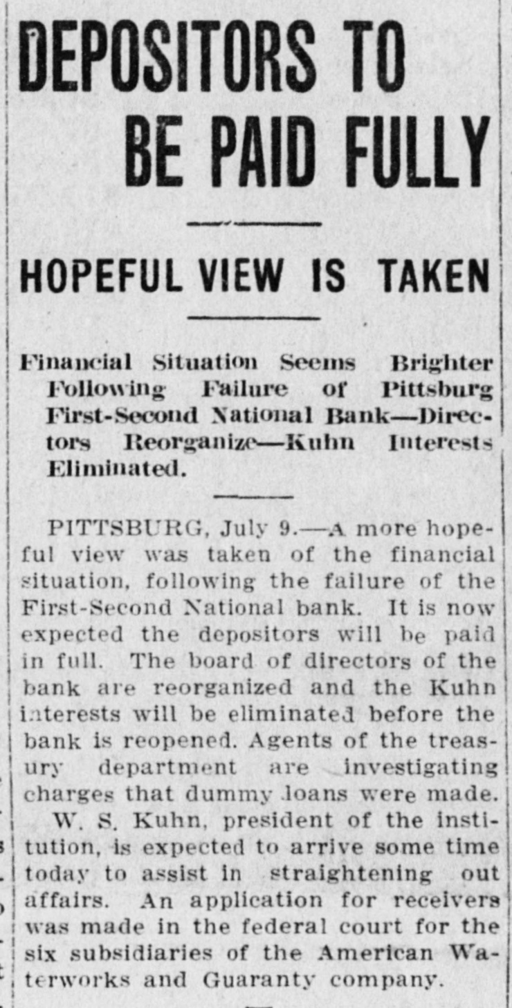 of First-Second National Pittsburgh in Dispute Over Assets. ALLY AT McKEESPORT ALSO DISCONTINUES President of Pittsburgh Institution Head of Business Interests in Eighty Cities. PITTSBURGH, Pa.. July 7.-Differences of long standing with the Treasury Department concerning the character and value of certain assets of the former First National Bank of Pittsburg. which was merged with the Second National Bank last March, un der the title of the First-Second No tional Bank of Pittsburgh. culminated this morning in the closing of the institution by order of T. P. Kane, deputy controller of the currency Unable to Adjust Differences. Directors and officers of the Institu. tion were in session all day yesterday and most of last night with special bank examiners sent here to investigate the bank. and at an early hour this morning notices were posted on the bank doors that it had been ordered closed. The Pittsburgh Clearing House Association has taken charge of the situation generally and announces that no further trouble is expected. A statement will be issued by it later in the day. None of the officials of the bank would make a statement this morning. announcing that affairs were in the nands of the government officials. The First National Bank of McKees po.t, an allied insulution of the FirstSecond National Bank of Pittsourgh, closed its doors later in the day, posung this notice: "On account of the First-Second Na tional Bank of Pittsburgh asking for a receiver, it is thought best for all of our depositors to close this bank for the present.' The notice was unsigned. Last Statement of Condition. The last statement of the First-Second National Bank's condition, made up on ca.1 of the controlier at the close of busi. ness June 4, was as follows: Resources: Loans and discounts, $15,704,801.16. Overdrafts, secured and unsecured, sa. 571.76 United States bonds to secure circuistion, $1,900,000. United States bonds to secure United States deposits, $171,000. United States bonds on hand. $16.000. Premiums on United States bonds, $10, 121.26. Bonds. securities, etc., $8,549,236.93 Banking house, furniture and fixtures, $176,755.04 Other real estate owned, $4,541,977.65 Due from national banks (not reserve agents). $1,178,987.06 Due from state banks and bankers, $1,316,820.23 Due from approved reserve agents, $4,216,447.75. Checks and other cash items, $160.076.23. Exchanges for clearing house, $692,230.42. Notes of other national banks, $360.000. Fractional paper currency, nickele and cents, $13,237.88. Lawful money reserve in bank. viz. specie and legal tender notes, $1,881,023. Redemption fund with United States Treasury (5 per cent of circulation), $93,000 Due from United States Treasurer, other than 5 per cent redemption fund, $87.500. Total, $38,103,886.39. Other Side of Ledger. Liabilities: Capital stock paid in. $3,400.00. Surplus fund. $1,700,000. Undivided profits, less expenses and taxes paid. $250,068.45 National bank notes outstanding, S1.882,900 Due to other national banks. $9.239. 871.82 Due to state banks and bankers, 1. 148,118.71 Due to trust companies and savings banks, Due to $3,712,210.31. approved reserve agents, $232. 535.41 Dividends unpaid. $1.630. Individual deposits subject to check, $15,105,144.50 Demand certificates of deposit, 8385 936.05 Time certificates of deposit. $16,090.30 Certified checks, $472,869.10 Cashier's checks outstanding, $76. 218.30. United States deposits, $149,814.18. Postal savings deposits, $10,458.86 Total, $38,103,886.39 Receivers Appointed. Attorneys this afternoon appeared beJudge C. P. Orr in the federal court fore asked for receivers for the American and Water Works and Guarantee Company. and also for the firm of J. S & W S Kuhn. Inc. these were appointed For the former Juhn, J H. Purdy. J. S. Kuhn. W. S. company. and manager of the this general Samuel Bailey, jr. a bank official of city the Kuhn company was appointed comFor who is treasurer of the pany J. K. Duff, Bonds of $50,000 were ordered filed for each receiver. S. Kuhn. incorporated, known J. S. & W. as the Kuhn interests $500,000. are bankers, incorporate in Delaware James with a Kunn cap. ital stock of board of directors. is chairman of the W. S Kuhn vice S. is and his brother. also president of Water president. James Works and Guar with a the American capital of $20,000.00 and Kuhn W. S. tee Company is vice president of this company. interests have centered The Kuhn in irrigation projects in largely of late also control the West Penn the west. Traction They and Water Power Com-