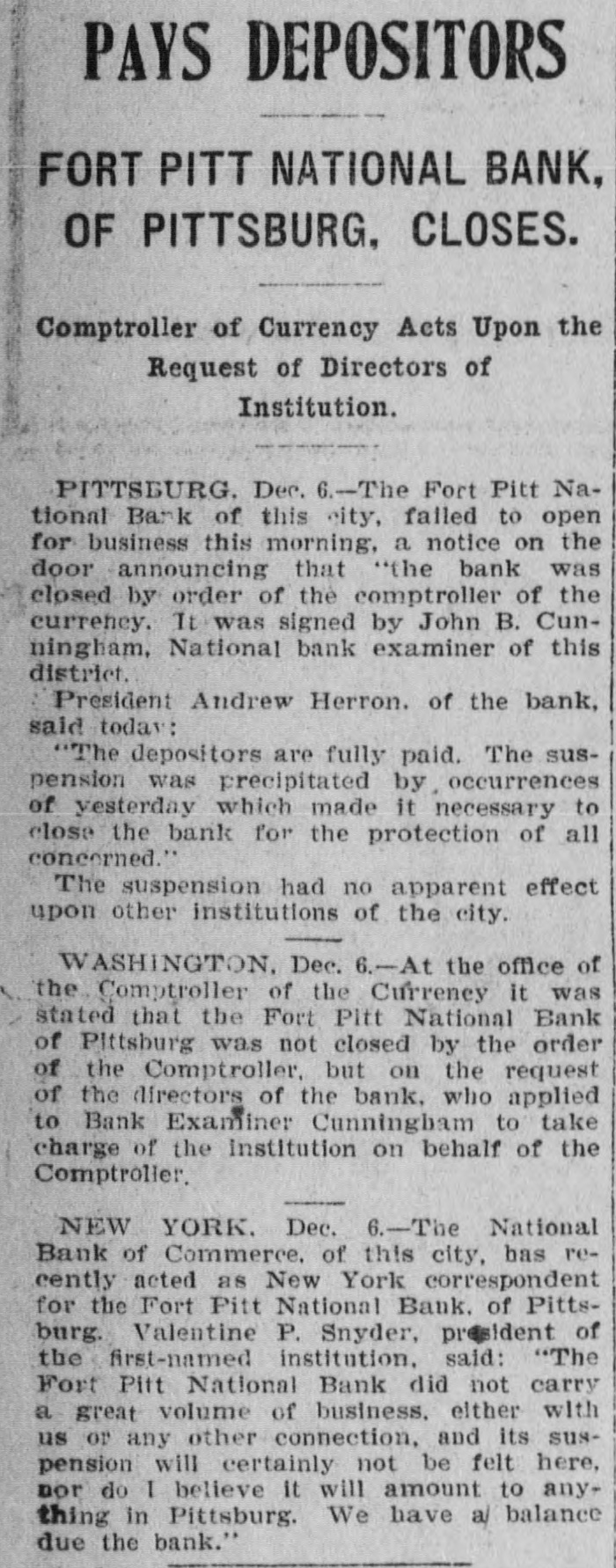 PAYS DEPOSITORS FORT PITT NATIONAL BANK, OF PITTSBURG, CLOSES. Comptroller of Currency Acts Upon the Request of Directors of Institution. PITTSBURG. Dec. 6.-The Fort Pitt National Bank of this city, falled to open for business this morning, a notice on the door announcing that "the bank was closed by order of the comptroller of the currency. It was signed by John B. Cunningham, National bank examiner of this district. President Andrew Herron. of the bank, said today: "The depositors are fully paid. The suspension was precipitated by occurrences of yesterday which made it necessary to close the bank for the protection of all concerned." The suspension had no apparent effect upon other institutions of the city. WASHINGTON, Dec. 6.-At the office of the Comptroller of the Currency it was stated that the Fort Pitt National Bank of Pittsburg was not closed by the order of the Comptroller, but on the request of the directors of the bank, who applied to Bank Examiner Cunningbam to take charge of the institution on behalf of the Comptroller. NEW YORK. Dec. 6.-The National Bank of Commerce. of this city, has recently acted as New York correspondent for the Fort Pitt National Bank. of Pittsburg. Valentine P. Snyder, president of the first-named institution. said: "The Fort Pitt National Bank did not carry a great volume of business. either with us or any other connection, and its suspension will certainly not be felt here, nor do I believe it will amount to anything in Pittsburg. We have a/ balance due the bank."