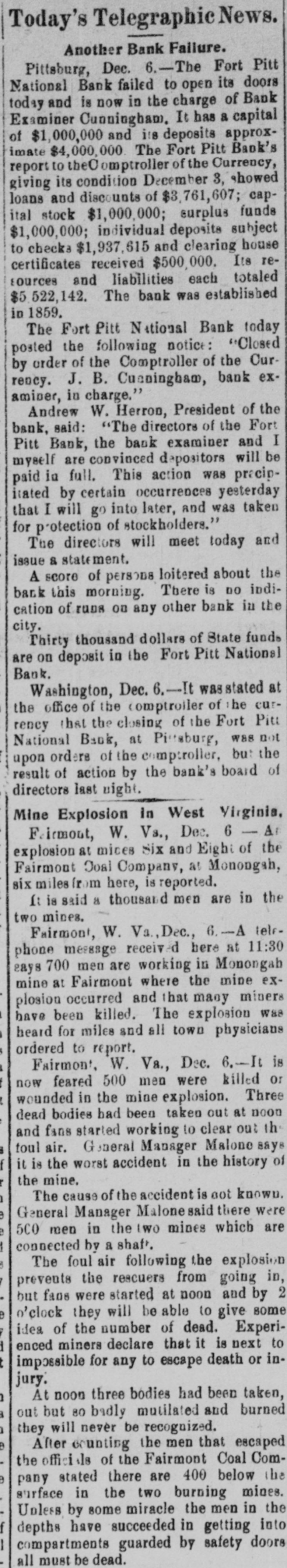 Today's Telegraphic News. Another Bank Failure. Pittsburg, Dec. 6.-The Fort Pitt National Bank failed to open its doors today and is now in the charge of Bank Examiner Cunningham. It has a capital of $1,000,000 and its deposits approximate $4,000,000 The Fort Pitt Baok's report to omptroller of the Currency, giving its condition December 3, showed loans and discounts of $3,761,607; capital stock $1,000,000; surplus funds $1,000,000; individual deposits subject to checks $1,937,615 and clearing house certificates received $500,000. Its resources and liabilities each totaled $5,522,142. The bank was established in 1859. The Fort Pitt National Bank today posted the following notice: "Closed by order of the Comptroller of the Currency. J. B. Cusningham, bank examiner, in charge." Andrew W. Herron, President of the bank, said: "The directors of the Fort Pitt Bank, the bank examiner and I myself are convinced depositors will be paid in full. This action was precipitated by certain occurrences yesterday that I will go into later, and was taken for protection of stockholders." The directors will meet today and issue & statement. A score of persons loitered about the bank this morning. There is no indication of runs on any other bank in the city. Thirty thousand dollars of State funds are on deposit in the Fort Pitt National Bank. Washington, Dec. 6,-It wasstated at the office of the comptroller of he currency that the closing of the Fort Pitt National Bank, at Pittsburg, was not upon orders of the comptroller, but the result of action by the bank's board of directors last night. Mine Explosion in West Virginia, Firmout, W. Vs., Dec. 6 - A explosion at mices Six and Eight of the Fairmont Doal Company, at Monongah, six milesΓ­rom here, is reported. It is said a thousand men are in the two mines. Fairmont, W. Va., Dec., 6.-A telrphone message received here at 11:30 says 700 men are working in Monongah mine at Fairmont where the mine explosion occurred and that many miners have been killed. The explosion was heard for miles and all town physicians ordered to report. Fairmont, W. Va., Dec. 6.-It is now feared 500 men were killed or wounded in the mine explosion. Three dead bodies bad been taken out at noon and fans started working to clear out the toul air. General Manager Malone says it is the worst accident in the history of the mine. The cause of the accident is not known. General Manager Malonesaid there were 5CO men in the two mines which are connected by a shaft. The foul air following the explosion prevents the rescuers from going in, but fans were started at noon and by 2 o'clock they will be able to give some idea of the number of dead. Experienced miners declare that it is next to impossible for any to escape death or injury. At noon three bodies had been taken, out but 80 badly mutilated and burned they will never be recognized. After counting the men that escaped the offici als of the Fairmont Coal Company stated there are 400 below the surface in the two burning mines. Unless by some miracle the men in the depths have succeeded in getting into compartments guarded by safety doors all must be dead.