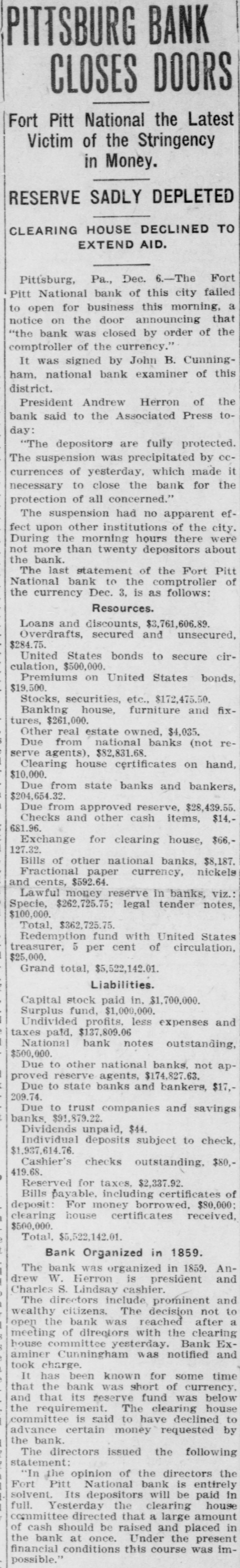 PITTSBURG BANK CLOSES DOORS Fort Pitt National the Latest Victim of the Stringency in Money. RESERVE SADLY DEPLETED CLEARING HOUSE DECLINED TO EXTEND AID. Pittsburg, Pa., Dec. 6.-The Fort Pitt National bank of this city failed to open for business this morning, a notice on the door announcing that "the bank was closed by order of the comptroller of the currency." It was signed by John B. Cunningham, national bank examiner of this district. President Andrew Herron of the bank said to the Associated Press today: "The depositors are fully protected. The suspension was precipitated by occurrences of yesterday, which made it necessary to close the bank for the protection of all concerned." The suspension had no apparent effect upon other institutions of the city. During the morning hours there were not more than twenty depositors about the bank. The last statement of the Fort Pitt National bank to the comptroller of the currency Dec. 3, is as follows: Resources. Loans and discounts, $3,761,606.89. Overdrafts, secured and unsecured, $284.75. United States bonds to secure circulation, $500,000. Premiums on United States bonds, $19,500. Stocks, securities, etc., $172,475.50. Banking house, furniture and fixtures, $261,000. Other real estate owned, $4,035. Due from national banks (not reserve agents), $82,831.68. Clearing house certificates on hand, $10,000. Due from state banks and bankers, $204,654.32. Due from approved reserve, $28,439.55. Checks and other cash items, $14,681.96. Exchange for clearing house, $66,127.32. Bills of other national banks, $8,187. Fractional paper currency, nickels and cents, $592.64. Lawful money reserve in banks, viz.: Specie, $262,725.75; legal tender notes, $100,000. Total, $362,725.75. Redemption fund with United States treasurer, 5 per cent of circulation, $25,000. Grand total, $5,522,142.01. Liabilities. Capital stock paid in. $1,700,000. Surplus fund, $1,000,000. Undivided profits, less expenses and taxes paid, $137,809.06 National bank notes outstanding, $500,000. Due to other national banks, not approved reserve agents, $174,827.63. Due to state banks and bankers, $17,209.74. Due to trust companies and savings banks. $91,879.22. Dividends unpaid, $44. Individual deposits subject to check, $1,937,614.76. Cashier's checks outstanding, $80,419.68. Reserved for taxes. $2,337.92. Bills payable, including certificates of deposit: For money borrowed, $80,000; clearing house certificates received, $500,000. Total. $5,522,142.01. Bank Organized in 1859. The bank was organized in 1859. Andrew W. Herron is president and Charles S. Lindsay cashier. The directors include prominent and wealthy citizens. The decision not to open the bank was reached after a meeting of directors with the clearing house committee yesterday. Bank Examiner Cunningham was notified and took charge. It has been known for some time that the bank was short of currency. and that its reserve fund was below the requirement. The clearing house committee is said to have declined to advance certain money requested by the bank. The directors issued the following statement: "In the opinion of the directors the Fort Pitt National bank is entirely solvent. Its depositors will be paid in full. Yesterday the clearing house committee directed that a large amount of cash should be raised and placed in the bank at once. Under the present financial conditions this course was im-