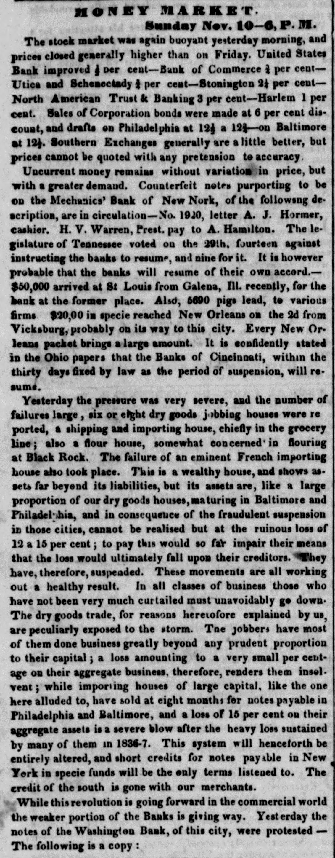 # MONEY MARKET. Sunday Nov. 10-6, P. M. The stock market was again buoyant yesterday morning, and prices closed generally higher than on Friday. United States Bank improved ¼ per cent-Bank of Commerce ¾ per cent-Utica and Schenectady ⅜ per cent-Stonington 2¼ per cent-North American Trust & Banking 3 per cent-Harlem 1 per cent. Sales of Corporation bonds were made at 6 per cent discount, and drafts on Philadelphia at 12¼ a 12½-on Baltimore at 12¼. Southern Exchanges generally are a little better, but prices cannot be quoted with any pretension to accuracy. Uncurrent money remains without variation in price, but with a greater demand. Counterfeit notes purporting to be on the Mechanics' Bank of New Nork, of the following description, are in circulation-No. 1920, letter A. J. Hormer, cashier. H. V. Warren, Prest. pay to A. Hamilton. The legislature of Tennessee voted on the 29th, fourteen against instructing the banks to resume, and nine for it. It is however probable that the banks will resume of their own accord.-$50,000 arrived at St Louis from Galena, Ill. recently, for the bank at the former place. Also, 5690 pigs lead, to various firms. $20,00 in specie reached New Orleans on the 2d from Vicksburg, probably on its way to this city. Every New Orleans packet brings a large amount. It is confidently stated in the Ohio papers that the Banks of Cincinnati, within the thirty days fixed by law as the period of suspension, will resume. Yesterday the pressure was very severe, and the number of failures large, six or eight dry goods jobbing houses were reported, a shipping and importing house, chiefly in the grocery line; also a flour house, somewhat concerned in flouring at Black Rock. The failure of an eminent French importing house also took place. This is a wealthy house, and shows assets far beyond its liabilities, but its assets are, like a large proportion of our dry goods houses, maturing in Baltimore and Philadelphia, and in consequence of the fraudulent suspension in those cities, cannot be realised but at the ruinous loss of 12 a 15 per cent; to pay this would so far impair their means that the loss would ultimately fall upon their creditors. They have, therefore, suspended. These movements are all working out a healthy result. In all classes of business those who have not been very much curtailed must unavoidably go down. The dry goods trade, for reasons heretofore explained by us, are peculiarly exposed to the storm. Tne jobbers have most of them done business greatly beyond any prudent proportion to their capital; a loss amounting to a very small per centage on their aggregate business, therefore, renders them insel-vent; while importing houses of large capital, like the one here alluded to, have sold at eight months for notes payable in Philadelphia and Baltimore, and a loss of 15 per cent on their aggregate assets is a severe blow after the heavy loss sustained by many of them in 1836-7. This system will henceforth be entirely altered, and short credits for notes payable in New York in specie funds will be the only terms listened to. The credit of the south is gone with our merchants. While this revolution is going forward in the commercial world the weaker portion of the Banks is giving way. Yesterday the notes of the Washington Bank, of this city, were protested - The following is a copy: