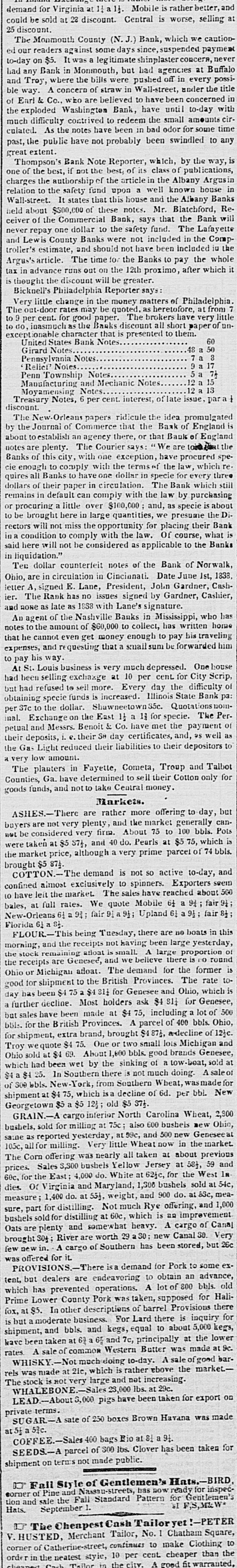 demand for Virginia at 1: all. Mobile is rather better, and at could be sold at 28 discount. Central is worse, selling 25 discount County (N.J.) Bank, which we cautioned readers against some days since, on $5. It was a legitimate shinplaster The our Monmouth suspended concern, payment Buffalo to-day had Bank in Monmouth, but had agencies at possiand any Troy, where the bills were pushed off in every the title ble way. A concern of straw in Wall-street, under Earl & Co., who are believed to have been concerned with in of the exploded Washington Bank, have until amounts to-day cirmuch difficulty contrived to redeem the small time culated. As the notes have been in bad odor for some past, the public have not probably been swindled to any great extent. Thompson's Bank Note Reporter, which, by publications, the way, is one the authorship of the article in the in charges of the best, if not the best of its class known of Albany house Argusin relation to the safety fund upon a well Banks Wall-street. It states that this house and the Albany Reabout $500,000 of these notes. Mr. Blatchford, will held of the Commercial Bank, says that the Bank ceiver repay one dollar to the safety fund. The Lafayette never and Lewis County Banks were not included in the Comp- ju the troller's estimate, and should not have been included Argus's article. The time for the Banks to pay the whole tax in advance runs out on the 12th proximo, after which it is thought the discount will be greater. Bicknell's Philadelphia Reporter says: little change in the money matters of Philadelphia from 7 Very out-door rates may be quoted as heretofore, at little to The cent. for good paper. The brokers have very of un9 per , inasmuch as the Banks discount all short paper 60 exceptionable character that is presented to them. United States Bank Notes. 48 50 Girard Notes Pennsylvania Notes Relief Notes. 7A Penn Township Notes 15 Manufacturing and Mechanic Notes 13 i Treasury Moyamensing Notes, 6 Notes. per cent. interest, of late issue, par discount. The New-Orleans papers ridicule the idea promulgated is the Journal of Commerce that the Bank of England about by to establish an agency there, or that Bank of England one with this exception, notes are plenty. The Courier says: We have are procured total spe- the cie Banks enough of to city comply with the terms of the law, which three re quires all Banks to have one dollar in specie for every still dollars of their paper in circulation. The Bank which remains in default can comply with the law by purchasing procuring a little over $100,000 and, as specie is about Dior to be brought here in large quantities, we presume the rectors will not miss the opportunity for placing their what Bank is in a condition to comply with the law. Of course, Banks said here will not be considered as applicable to the in liquidation.' Tec dollar counterfeit notes of the Bank of Norwalk, Ohio, are in circulation in Cincianati. Date June 1st, Cash- 1833, A, signed E. Lane, President, John Gardner, letter The Rank has no issues signed by Gardner, Cashier, ier. and none as late as 1858 with Lane's signature. An of the Nashville Banks in Mississippi, who home has agent to the amount of $60,000 to collect, has written notes he cannot even get money enough to pay bis traveling him that expenses, and requesting that a small be forwarded pay his way Louis business is very much depressed. One house At been St. selling exchange at 10 per cent for City Scrip, had had refused to sell more. Every day the difficulty Bank pa: of but obtaining specie funds is increased. Illinois Quotationsnoin- State 37c to the dollar. Shawneetown35c. The Perper Exchange on the East 11 a 13 for specie. inal. and Messrs. Benoit & Co. have met the payment of petual deposits, 1. e. their SH day certificates, and, 95 well as to the their Gas Light reduced their liabilities to their depositors very low amount. planters in Fayette, Cometa, Troup and Talbot for Counties, The Ga. have determined to sel their Cotton only goods funds, and not to take Central money. Markets. ASHES.-There are rather more offering to day, but are not very plenty, and the market generally bbls. can- Pots buyers considered very firm. About 75 to 100 which not be taken at $5 ST1, and 40 do. Pearls at $5 75, bbls. is the were market price, although a very prime parcel of 74 brought $5 87 COTTON. The demand is not so active to-day, and almost exclusively to spinners. reached Exporters about seem 500 confined left the market. The sales have to have full rates. We quote Mobile 64 a 91 fair bales, New-Orleans at 61 92; fair 91 a 9 ; Upland 61 a 91 fair 81 61 a s} Florida FLOUR-This being Tuesday, there are no boats yesterday, in this and the receipts not having been large proportion morning, the stock remaining afloat small. A large there is PO round of the afloat. The demand for the or to the British Provinces. to- is Ohio receipts for Michigan shipment are Genesee, and we believe The former which rate is been $4.75 a 4811 for Genesee Most holders ask $4.81 been made at $4 75, a but good day further sales has have decline. including and Ohio, for bbls. lot Genesee, of Ohio, 500 for the B ritish Provinces. A parcel of 400 bbls. extra brand, brought $4873, adecline of 12tc. and for shipment, $4 75. One or two small lots Michigan we quote 69. About 1,800 bbls. good brands Ohio been wet by the sinking of a sale of In Southern there is not much doing. which Troy $4 25. sold had at $4 tow-boat, was Genesee, made A sold for at bbls. New-York, from Southern Wheat, New of shipment S00 at $4 75, which is decline of 6d. per bbl. Georgetown $5 $5 12 old $5 STR. go inferior North Carolina Wheat, 2,300 for milling at 75c: also 600 bushels, GRAIN.-A reported sold yesterday at 99c, and 500 bushels new new Geneseeal market. Ohio, saine as Very little Wheat now in the was nearly all taken at and S,S00 bushels Yellow Jersey at 58j, 105c, The Corn all for Sales offering milling. about the West pre