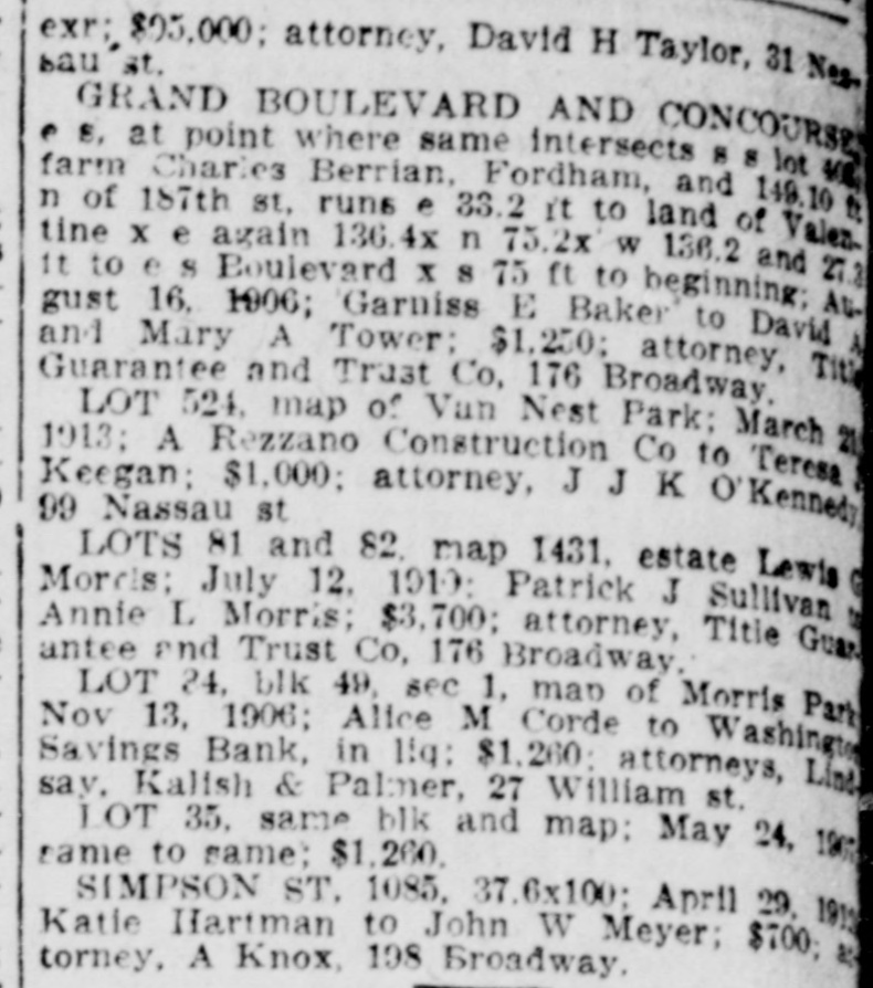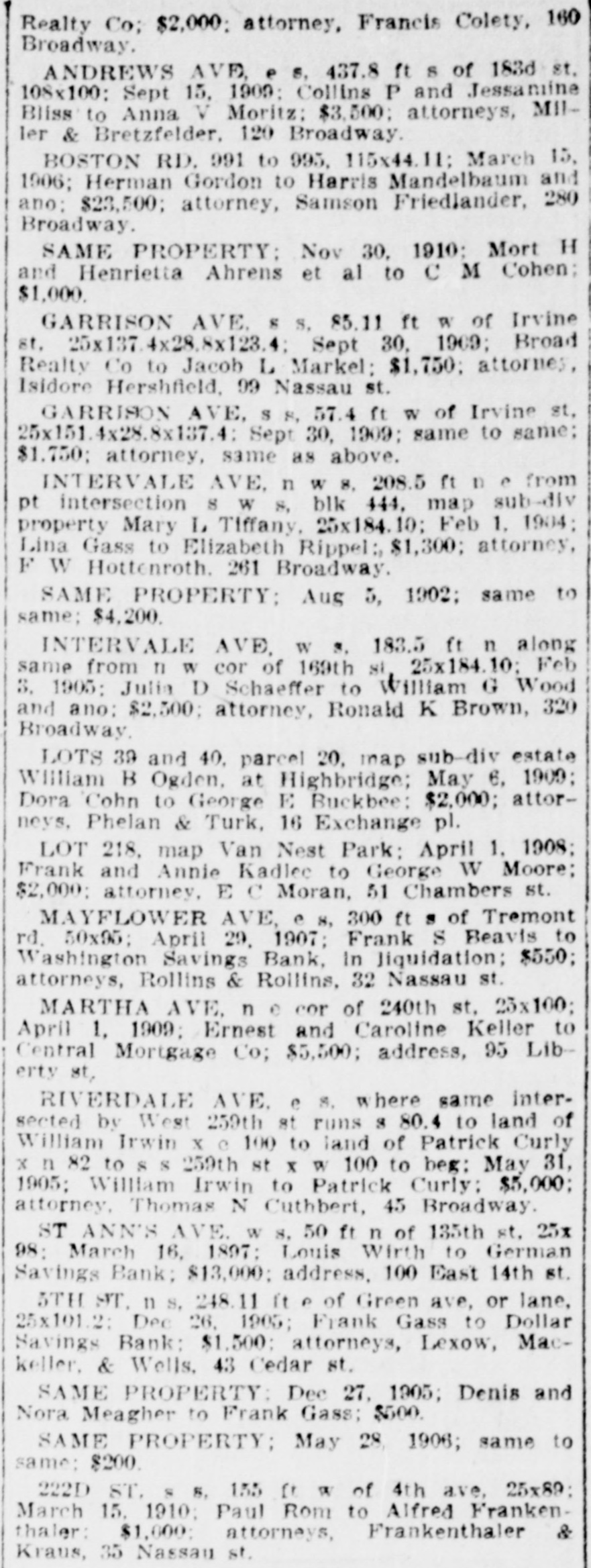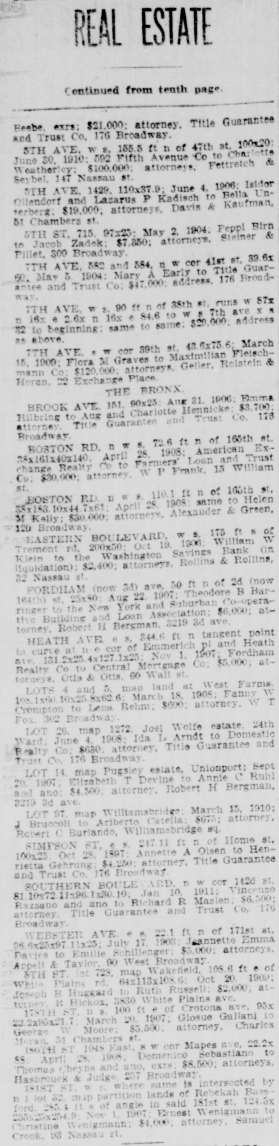 REAL ESTATE Continued from tenth page. Beebe, exrs: $21,000; attorney. Title Guarantee and Trust Co, 176 Broadway. 5TH AVE, w s. 155.5 ft n of 47th st. 100x20: June 30, 1910: 592 Fifth Avenue Co to Charlotte Weatherley: $100.000; attorneys, Fettretch & Seybel, 147 Nassau st. 5TH AVE, 1429, 110x37.9; June 4, 1906; Isidor Ollendorf and Lazarus P Kadisch to Bella Unterberg: $19,000; attorneys, Davis & Kaufman, 51 Chambers st. 5TH ST, 715. 97x25: May 2, 1904. Peppi Birn to Jacob Zadek: $7.350; attorneys, Steiner & Pillet, 300 Broadway. 7TH AVE, 582 and 584, n w cor 41st st. 39.6x 60. May 5. 1904: Mary A Early to Title Guarantee and Trust Co; $47,000; address, 176 Broadway. 7TH AVE, w s. 90 ft n of 38th st, runs w 87x n 16x e 2.6x n 16x e 84.6 to w s 7th ave x s 32 to beginning; same to same: $20,000; address as above. 7TH AVE, s w cor 39th st. 43.6x75.6; March 15, 1909; Flora M Graves to Maximilian Fleischmann Co: $120.000; attorneys, Geller, Rolstein & Horan. 22 Exchange Place. THE BRONX. BROOK AVE, 151, 90x25: Aug 31. 1906; Emma Hilbring to Aug and Charlotte Hennicke: $3.700; attorney. Title Guarantee and Trust Co. 178 Broadway. BOSTON RD, n w s. 72.6 ft n of 165th st. 38x161x40x140; April 28, 1908: American Exchange Realty Co to Farmers' Loan and Trust Co: $30,000; attorney, W P Frank, 15 William st. BOSTON RD. n w s. 110.1 ft n of 165th st. 38x183.10x44.7x61: April 28. 1908: same to Helen M Kelly: $30.000; attorneys, Alexander & Green, 120 Broadway. EASTERN BOULEVARD, w s. 175 ft s of Tremont rd., 200x50: Oct 19. 1906: William W Klein to the Washington Savings Bank (in liquidation); $2,400; attorneys, Rollins & Rollins, 32 Nassau st. FORDHAM (now 3d) ave. 50 ft n of 2d (now 164th) st, 25x80; Aug 22. 1907; Theodore B Barringer to the New York and Suburban Co-operative Building and Loan Association; $6,000; attorney, Robert H Bergman, 3219 3d ave. HEATH AVE. e s, 344.6 ft n tangent point in curve at n e cor of Emmerich pl and Heath ave, 131.2x25.4x127.1x25: Nov 1, 1907; Fordham Realty Co to Central Mortgage Co; $5,000; attorneys, Otis & Otis, 60 Wall st. LOTS 4 and 5, map land at West Farms. 108.1x60.10x25.8x62.6: March 18, 1908; Fanny W Crenipton to Lena Rehm: $600; attorney. W T Fox. 302 Broadway. LOT 26, map 1272. Joel Wolfe estate, 24th Ward; June 4, 1908; Ida L. Arndt to Domestic Realty Co: $680; attorney, Title Guarantee and Trust Co. 176 Broadway. LOT 14, map Pugsley estate, Unionport; Sept 20, 1907: Elizabeth T Devine to Annie C Ruhl and ano: $4.500; attorney, Robert H Bergman, 3219 3d ave. LOT 97, map Williamsbridge: March 15, 1910; J Bruccoli to Ariberto Catella: $675; attorney, Robert Burlando, Williamsbridge sq. SIMPSON ST, e s. 247.11 ft n of Home st. 100x25. Oct 28, 1897: Annette A Olsen to Henrietta Gehrung: $4.250; attorney, Title Guarantee and Trust Co. 176 Broadway. SOUTHERN BOULEVARD. n w cor 142d st, 81.10x72.11x96.1x30.10; Jan 10, 1911; Vincenzo Razzano and ano to Richard R Maslen: $6,500; attorney. Title Guarantee and Trust Co. 176 Broadway. WEBSTER AVE. e s, 22.1 ft n of 171st st, 96.6x25x97.11x25; July 17, 1903: Jeannette Emma Davies to Emilie Schillenger: $5.000; attorneys, Appell & Taylor, 90 West Broadway. 178TH ST. lot 728, map Wakefield, 108.6 ft e of White Plains rd. 64x115x108.6: Oct 20, 1909; Joseph B Huggard to Ruth Russell: $2,000; attorney. R. Hickox, 3830 White Plains ave. 178TH ST. n s. 100 ft e of Crotona ave, 95x 22.2x96x21.7 March 20. 1907; Glosue Gallani to George W Moore: $5.500; attorney, Charles Moran, 51 Chambers st. 180TH ST. 1048 East, s w cor Mapes ave, 22.2x 88. April 28, 1908, Domenico Sebastiano to Thomas Cheyne and ano, exrs; $8,500; attorneys, Hasbrouck & Judge, 257 Broadway. 181ST ST, w s. where same is intersected by n 1 lot 32. map partition lands of Rebekah Bassford. 285.4 ft s of angle in said 181st st, 124.5x 255x25x254.9: Nov 1, 1907: Ernest Weniginann to Christine Wenigmann; $4,000; attorney, Samuel Crook. 98 Nassau st.