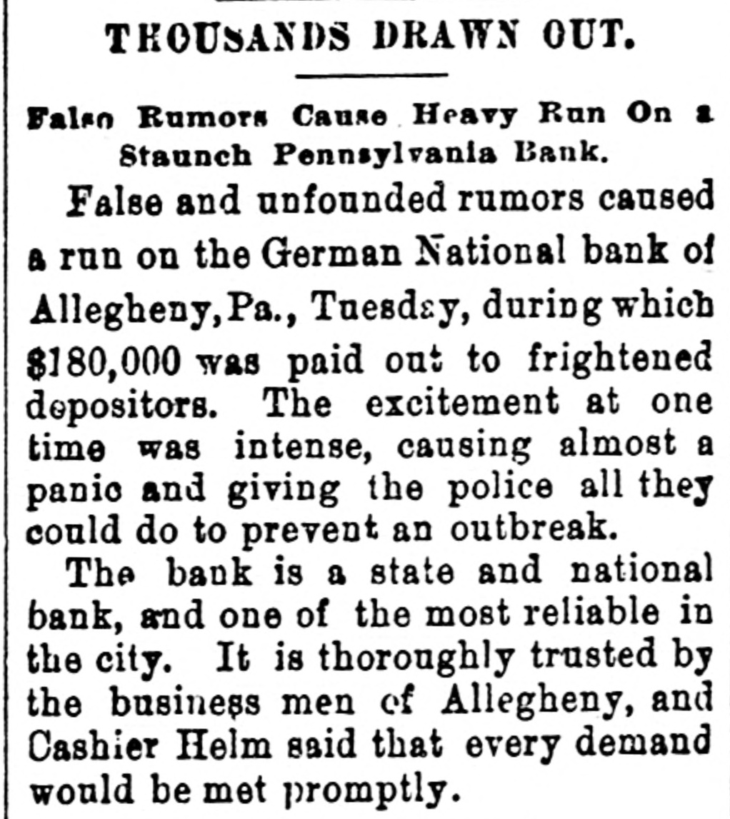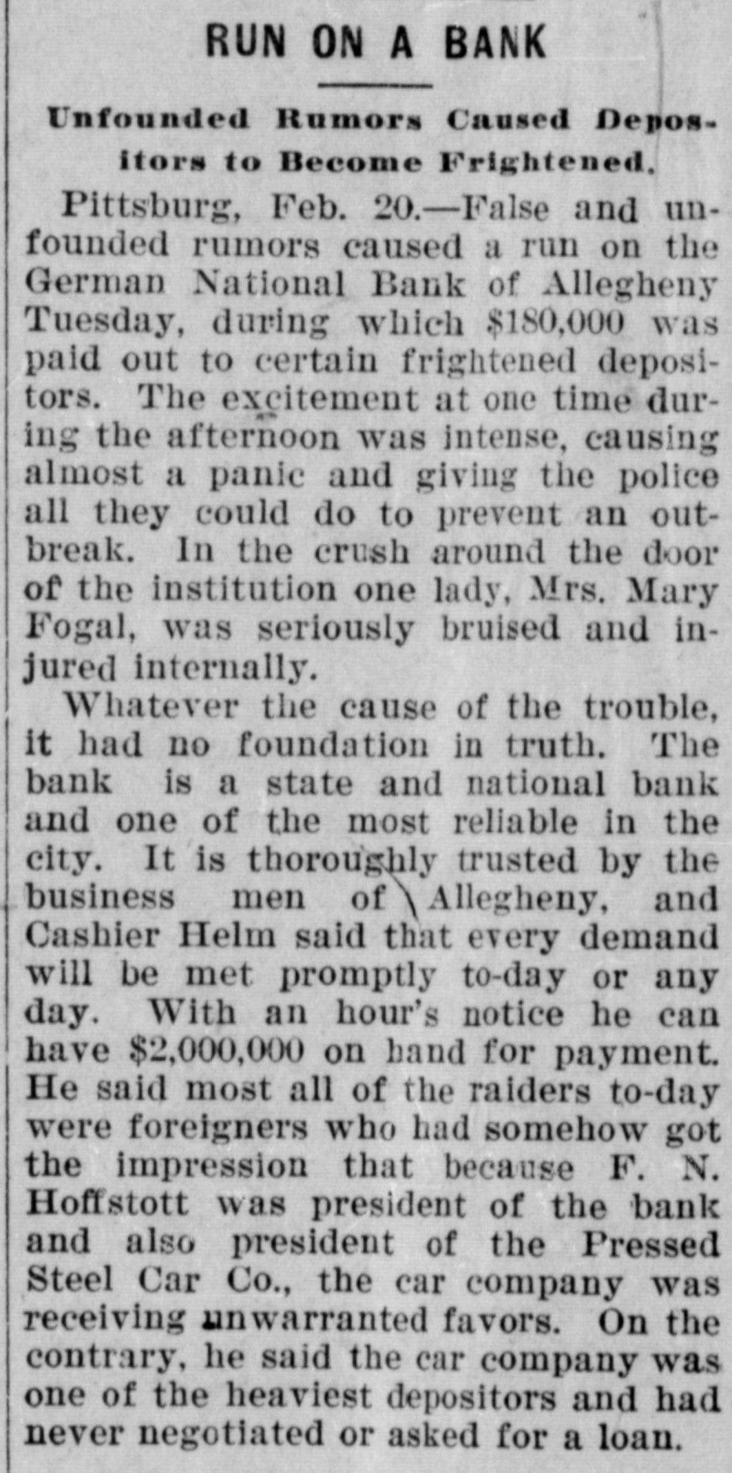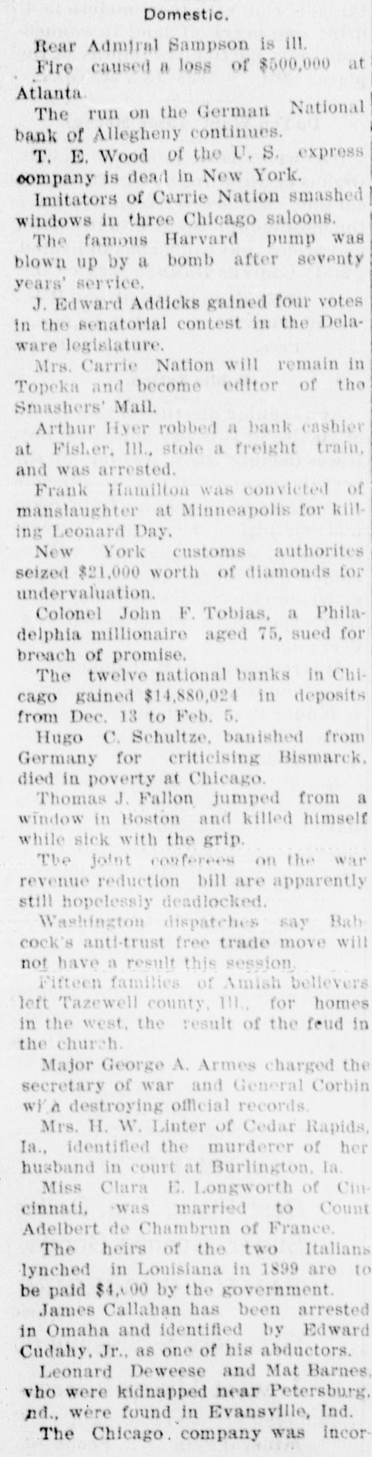 Domestic. Rear Admiral Sampson is ill. Fire caused a loss of $500,000 at Atlanta The run on the German National bank of Allegheny continues. T. E. Wood of the U. S. express company is dead in New York. Imitators of Carrie Nation smashed windows in three Chicago saloons. The famous Harvard pump was blown up by a bomb after seventy years' service. J. Edward Addicks gained four votes in the senatorial contest in the Delaware legislature. Mrs. Carrie Nation will remain in Topeka and become editor of the Smashers' Mail. Arthur Hyer robbed a bank cashier at Fisher. III., stole a freight train, and was arrested. Frank Hamilton was convicted of manslaughter at Minneapolis for killing Leonard Day. New York customs authorites seized $21,000 worth of diamonds for undervaluation. Colonel John F. Tobias, a Philadelphia millionaire aged 75, sued for breach of promise. The twelve national banks in Chicago gained $14,880,024 in deposits from Dec. 13 to Feb. 5. Hugo C. Schultze, banished from Germany for criticising Bismarck. died in poverty at Chicago. Thomas J. Fallon jumped from a window in Boston and killed himself while sick with the grip. The joint conferees on the war revenue reduction bill are apparently still hopelessly deadlocked. Washington dispatches say Babcock's anti-trust free trade move will not have a result this session. Fifteen families of Amish believers left Tazewell county, III., for homes in the west, the result of the feud in the church. Major George A. Armes charged the secretary of war and General Corbin win destroying official records. Mrs. H. W. Linter of Cedar Rapids, Ia., identified the murderer of her husband in court at Burlington, la. Miss Clara E. Longworth of Cincinnati, was married to Count Adelbert de Chambrun of France. The heirs of the two Italians lynched in Louisiana in 1899 are to be paid $4,000 by the government. James Callaban has been arrested in Omaha and identified by Edward Cudahy. Jr., as one of his abductors. Leonard Deweese and Mat Barnes. who were kidnapped near Petersburg. nd., wère found in Evansville, Ind. The Chicago. company was Incor-