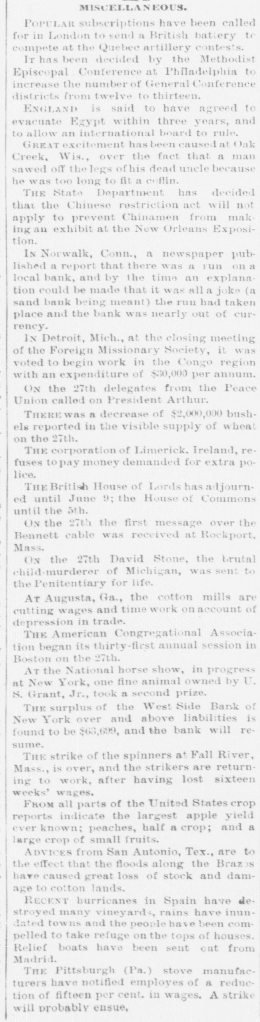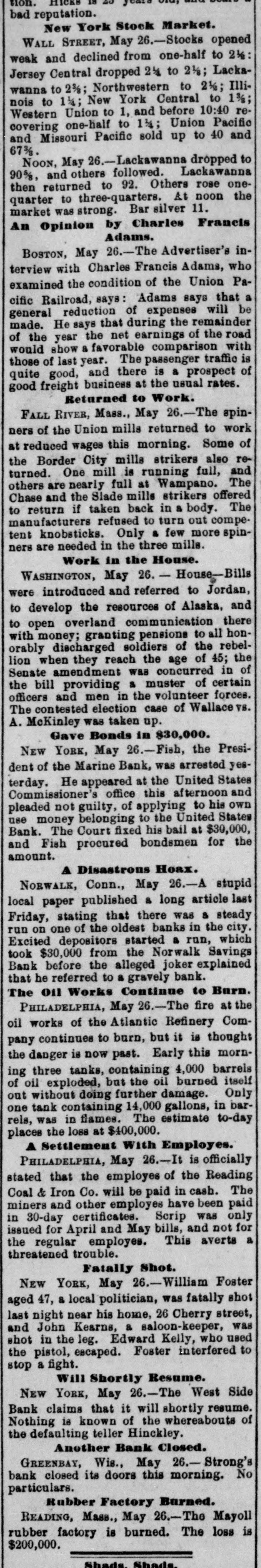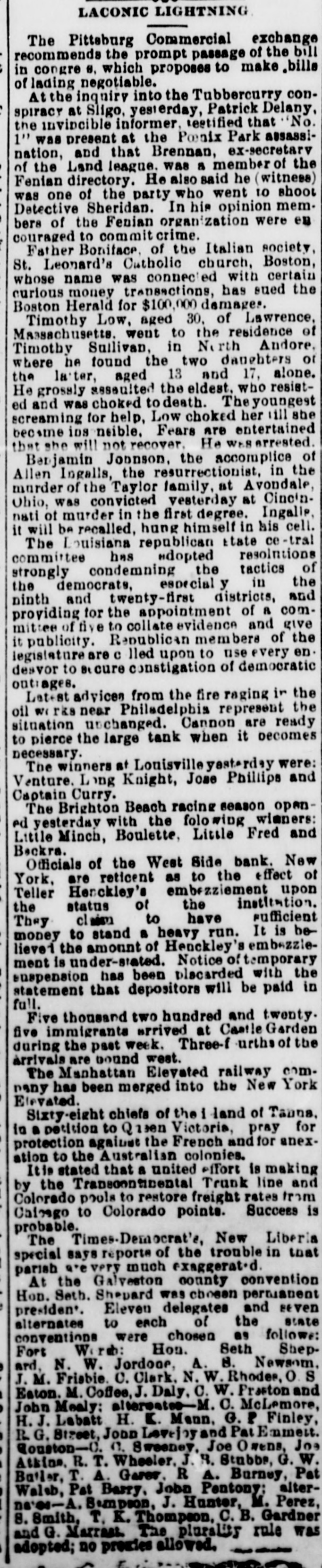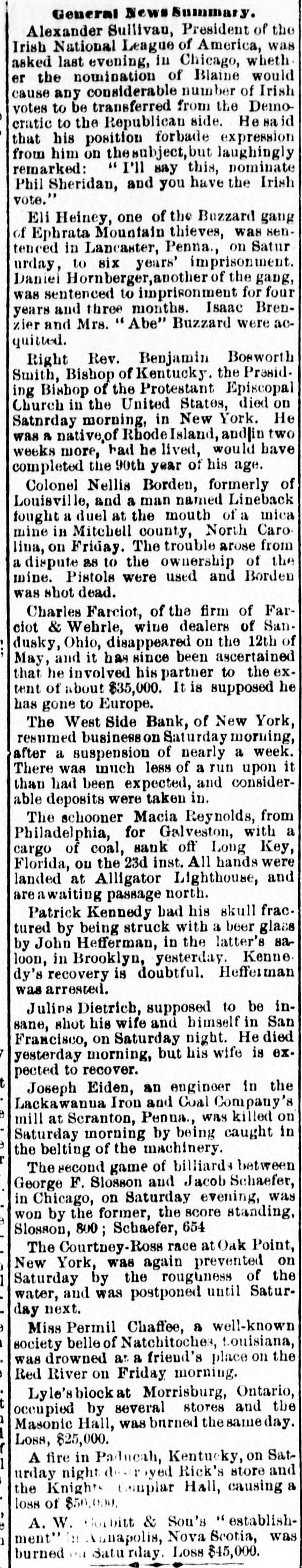 General Summary. Alexander Sullivan, President of the Irish National League of America, was asked last evening, in Chicago, wheth er the nomination of Blaine would cause any considerable number of Irish votes to be transferred from the Democratic to the Republican side. Hesaid that his position forbade expression from him on the subject, but laughingly remarked: I'll say this, nominate Phil Sheridan, and you have the Irish vote." Eli Heiney, one of the Buzzard gang of Ephrata Mountain thieves, was sentenced in Lancaster, Penna., on Satur urday, to six years' imprisonment. Daniel Hornberger,another of the gang, was sentenced to imprisonment for four years and three months. Isaac Brenzier and Mrs. 'Abe" Buzzard were acquitted. Right Rev. Benjamin Boeworth Smith, Bishop of Kentucky. the Presiding Bishop of the Protestant Episcopal Church in the United States, died on Satnrday morning, in New York. He was a native, of RhodeIsland, andlin two weeks more, had he lived, would have completed the 90th year of his age. Colonel Nellis Borden, formerly of Louisville, and a man named Lineback fought a duel at the mouth of a inica mine in Mitchell county, North Caro lina, on Friday. The trouble arose from a dispute as to the ownership of the mine. Pistols were used and Borden was shot dead. Charles Farciot, of the firm of Farciot & Wehrle, wine dealers of Sandusky, Ohio, disappeared on the 12th of May, and it has since been ascertained that he involved his partner to the extent of about $35,000. It is supposed he has gone to Europe. The West Side Bank, of New York, resumed business on Saturday morning, after a suspension of nearly a week. There was much less of a run upon it than had been expected, and considerable deposits were taken in. The schooner Macia Reynolds, from Philadelphia, for Galveston, with a cargo of coal, sank off Long Key, Florida, ou the 23d inst. All hands were landed at Alligator Lighthouse, and areawaiting passage north. Patrick Kennedy bad his skull frac. tured by being struck with a beer glass by John Hefferman, in the latter's saloon, in Brooklyn, yesterday. Kenne dy's recovery is doubtful. Hefferman was arrested. Julins Dietrich, supposed to be insane, shot his wife and bimself in San Francisco, on Saturday night. He died yesterday morning, but his wife is expected to recover. Joseph Eiden, an engineer in the Lackawanua Iron and Coal Company's mill at Scranton, Penna., was killed on Saturday morning by being caught in the belting of the machinery. The second game of billiards between George F. Slosson and Jacob Schaefer, in Chicago, on Saturday evening, was won by the former, the score standing, Slosson, 800; Schaefer, 654 The Courtney-Ross race at Oak Point, New York, was again prevented on Saturday by the roughness of the water, and was postponed until Saturday next. Miss Permil Chaffee, a well-known society belle of Natchitoches, Louisiana, was drowned at a friend's place on the Red River on Friday morning. Lyle's block at Morrisburg, Ontario, occupied by several stores and the Masonic Hall, was burned the ameday. Loss, $25,000. A fire in Paducah, Kentucky, on Saturday night dear yed Rick's store and the Knight complar Hall, causing a loss of $50,000. A. W. Corbitt & Son's establish2 ment" Aunapolis, Nova Scotia, was burned Satu rday. Loss $45,000.