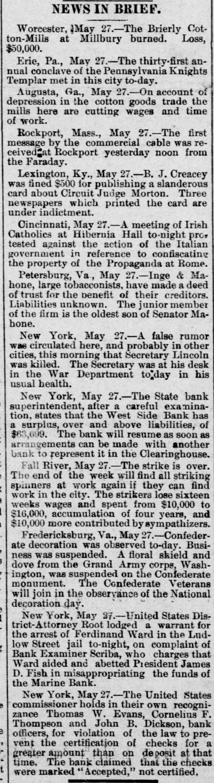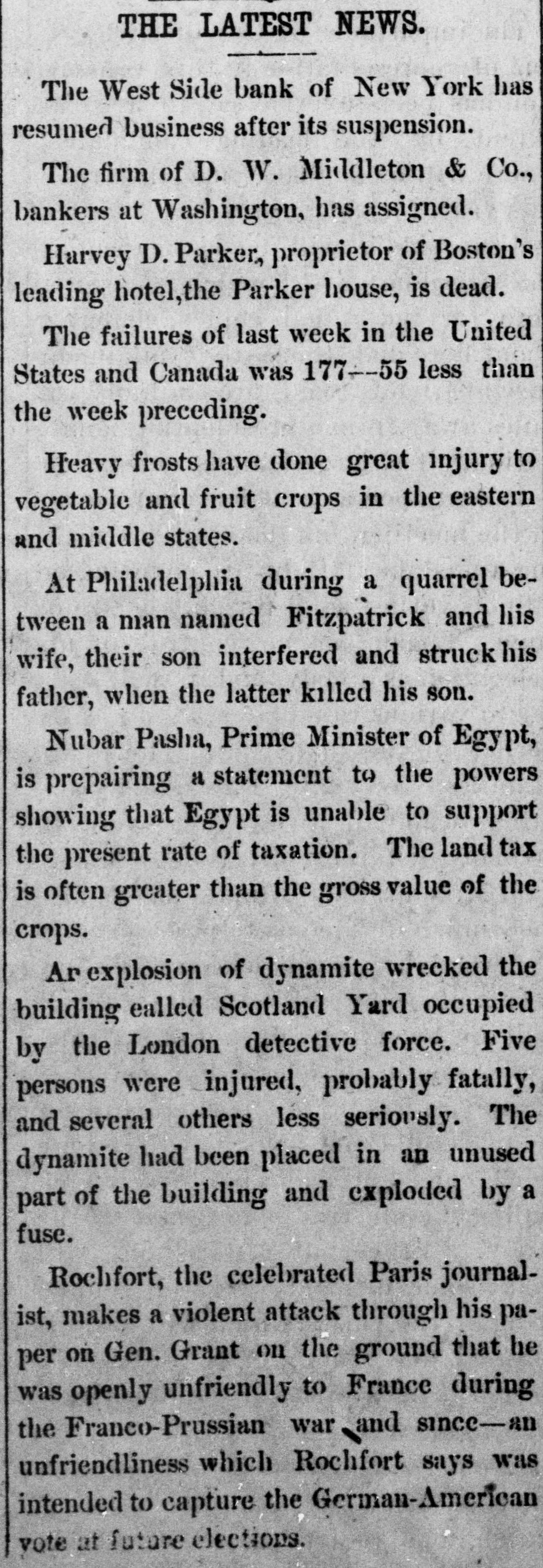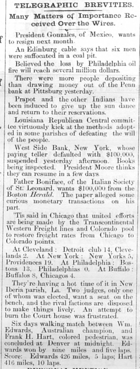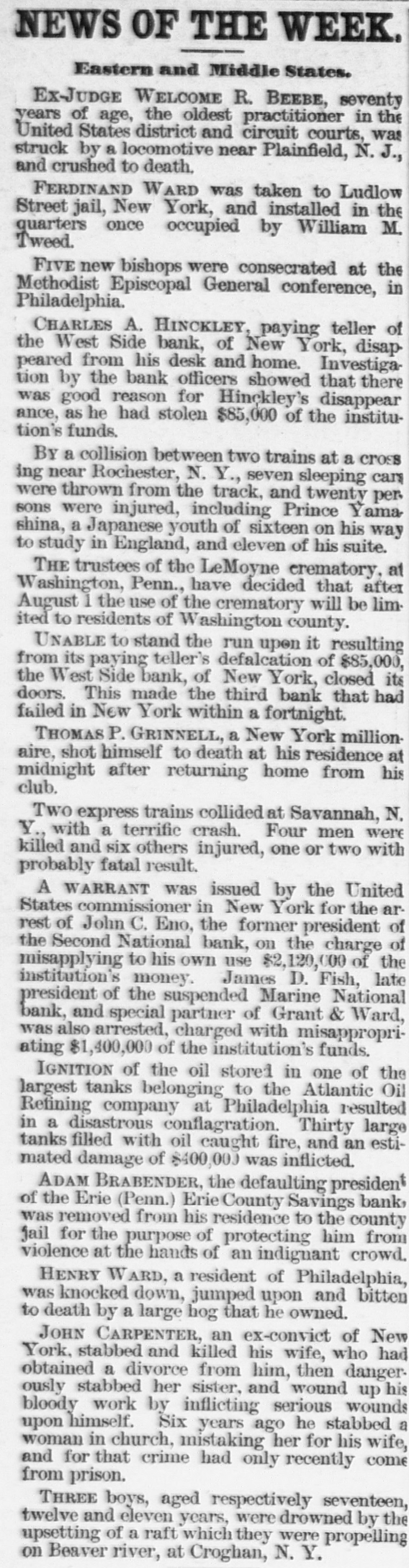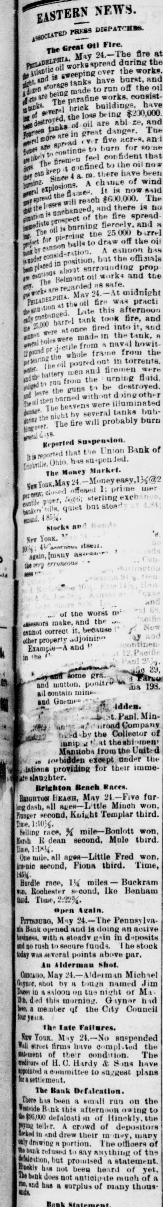 General Summary. Alexander Sullivan, President of the Irish National League of America, was asked last evening, in Chicago, wheth er the nomination of Blaine would cause any considerable number of Irish votes to be transferred from the Democratic to the Republican side. Hesaid that his position forbade expression from him on the subject, but laughingly remarked: I'll say this, nominate Phil Sheridan, and you have the Irish vote." Eli Heiney, one of the Buzzard gang of Ephrata Mountain thieves, was sentenced in Lancaster, Penna., on Satur urday, to six years' imprisonment. Daniel Hornberger,another of the gang, was sentenced to imprisonment for four years and three months. Isaac Brenzier and Mrs. 'Abe" Buzzard were acquitted. Right Rev. Benjamin Boeworth Smith, Bishop of Kentucky. the Presiding Bishop of the Protestant Episcopal Church in the United States, died on Satnrday morning, in New York. He was a native, of RhodeIsland, andlin two weeks more, had he lived, would have completed the 90th year of his age. Colonel Nellis Borden, formerly of Louisville, and a man named Lineback fought a duel at the mouth of a inica mine in Mitchell county, North Caro lina, on Friday. The trouble arose from a dispute as to the ownership of the mine. Pistols were used and Borden was shot dead. Charles Farciot, of the firm of Farciot & Wehrle, wine dealers of Sandusky, Ohio, disappeared on the 12th of May, and it has since been ascertained that he involved his partner to the extent of about $35,000. It is supposed he has gone to Europe. The West Side Bank, of New York, resumed business on Saturday morning, after a suspension of nearly a week. There was much less of a run upon it than had been expected, and considerable deposits were taken in. The schooner Macia Reynolds, from Philadelphia, for Galveston, with a cargo of coal, sank off Long Key, Florida, ou the 23d inst. All hands were landed at Alligator Lighthouse, and areawaiting passage north. Patrick Kennedy bad his skull frac. tured by being struck with a beer glass by John Hefferman, in the latter's saloon, in Brooklyn, yesterday. Kenne dy's recovery is doubtful. Hefferman was arrested. Julins Dietrich, supposed to be insane, shot his wife and bimself in San Francisco, on Saturday night. He died yesterday morning, but his wife is expected to recover. Joseph Eiden, an engineer in the Lackawanua Iron and Coal Company's mill at Scranton, Penna., was killed on Saturday morning by being caught in the belting of the machinery. The second game of billiards between George F. Slosson and Jacob Schaefer, in Chicago, on Saturday evening, was won by the former, the score standing, Slosson, 800; Schaefer, 654 The Courtney-Ross race at Oak Point, New York, was again prevented on Saturday by the roughness of the water, and was postponed until Saturday next. Miss Permil Chaffee, a well-known society belle of Natchitoches, Louisiana, was drowned at a friend's place on the Red River on Friday morning. Lyle's block at Morrisburg, Ontario, occupied by several stores and the Masonic Hall, was burned the ameday. Loss, $25,000. A fire in Paducah, Kentucky, on Saturday night dear yed Rick's store and the Knight complar Hall, causing a loss of $50,000. A. W. Corbitt & Son's establish2 ment" Aunapolis, Nova Scotia, was burned Satu rday. Loss $45,000.