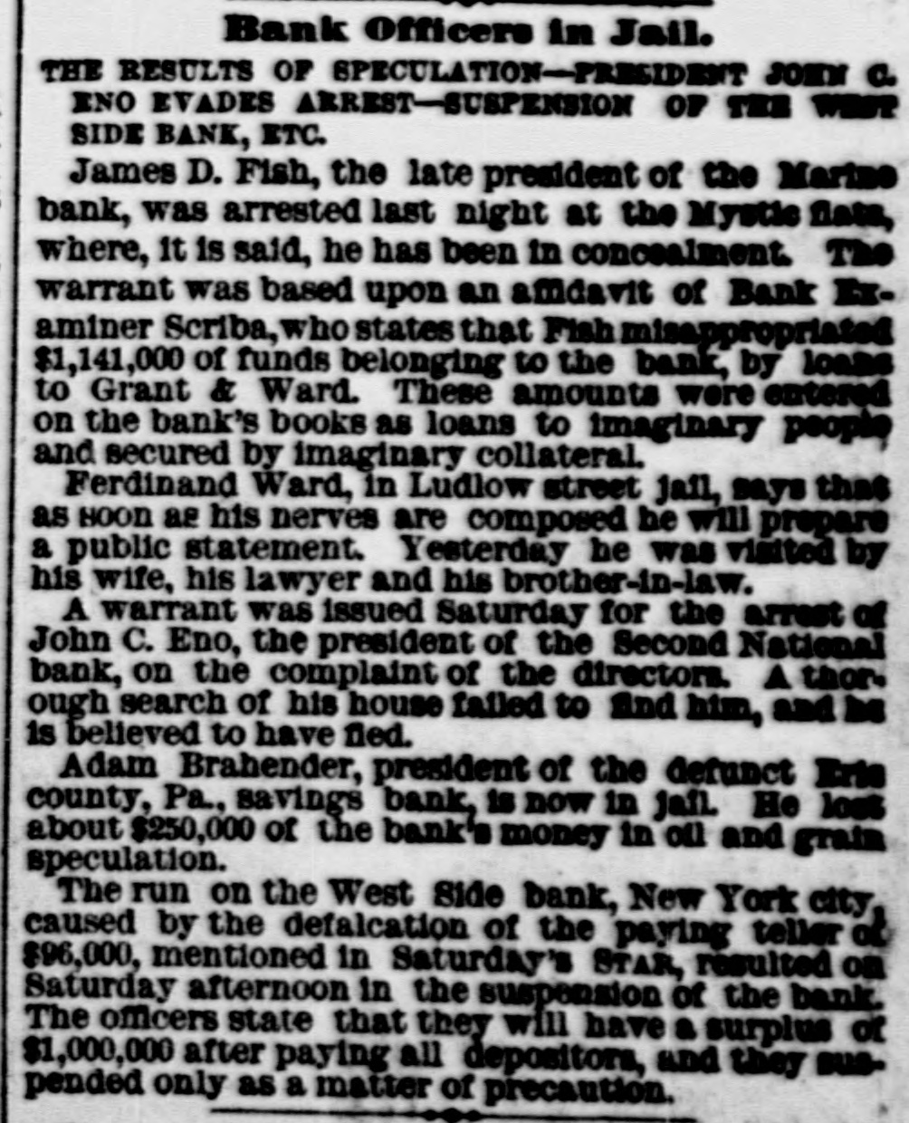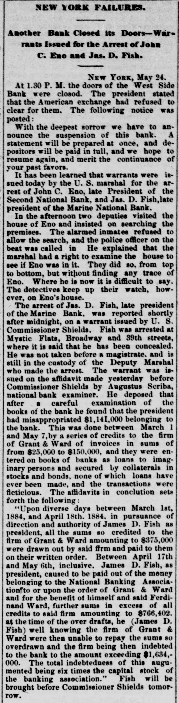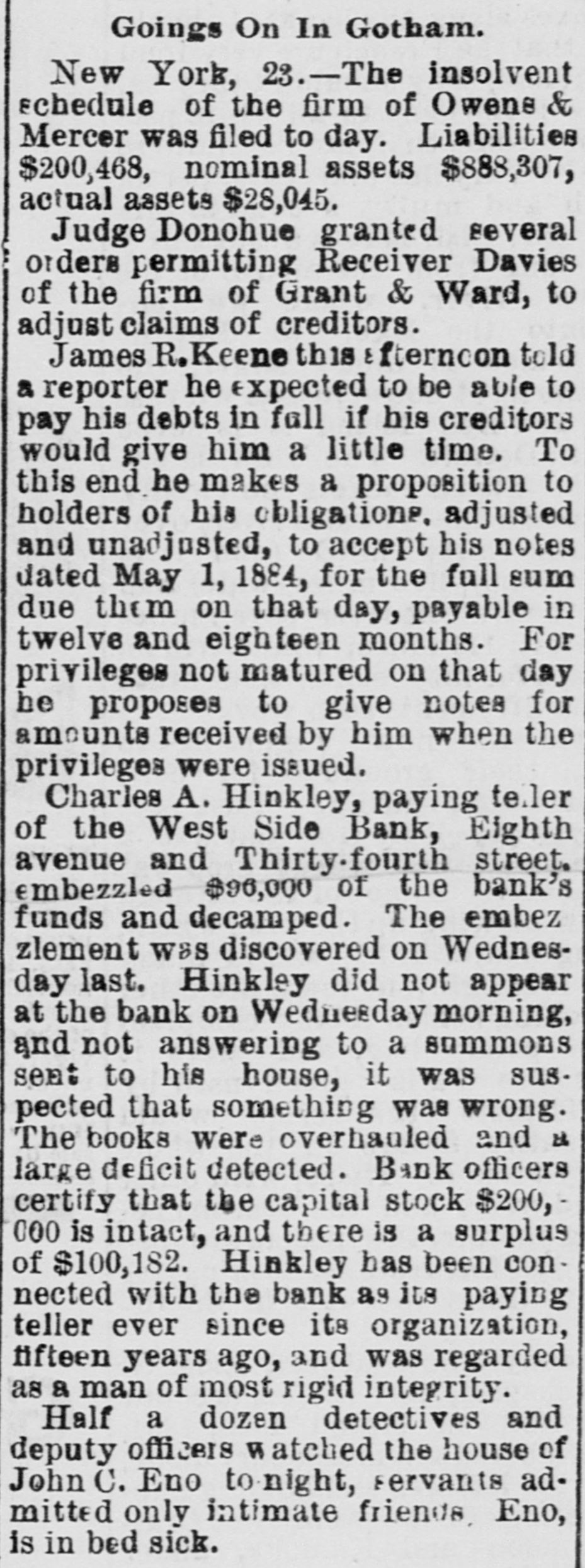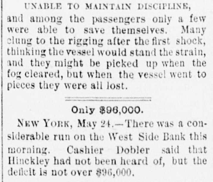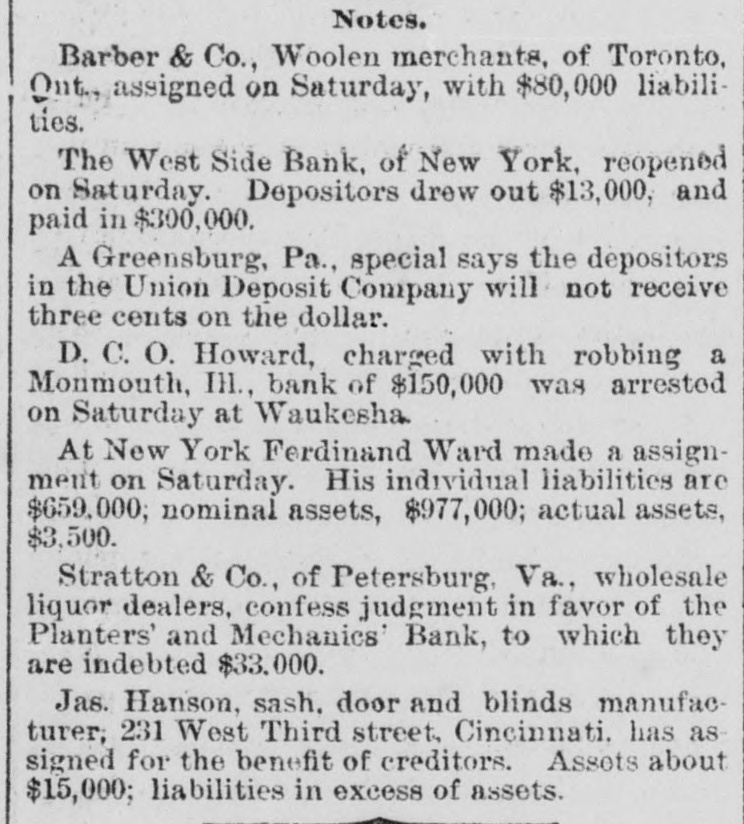 General Summary. Alexander Sullivan, President of the Irish National League of America, was asked last evening, in Chicago, wheth er the nomination of Blaine would cause any considerable number of Irish votes to be transferred from the Democratic to the Republican side. Hesaid that his position forbade expression from him on the subject, but laughingly remarked: I'll say this, nominate Phil Sheridan, and you have the Irish vote." Eli Heiney, one of the Buzzard gang of Ephrata Mountain thieves, was sentenced in Lancaster, Penna., on Satur urday, to six years' imprisonment. Daniel Hornberger,another of the gang, was sentenced to imprisonment for four years and three months. Isaac Brenzier and Mrs. 'Abe" Buzzard were acquitted. Right Rev. Benjamin Boeworth Smith, Bishop of Kentucky. the Presiding Bishop of the Protestant Episcopal Church in the United States, died on Satnrday morning, in New York. He was a native, of RhodeIsland, andlin two weeks more, had he lived, would have completed the 90th year of his age. Colonel Nellis Borden, formerly of Louisville, and a man named Lineback fought a duel at the mouth of a inica mine in Mitchell county, North Caro lina, on Friday. The trouble arose from a dispute as to the ownership of the mine. Pistols were used and Borden was shot dead. Charles Farciot, of the firm of Farciot & Wehrle, wine dealers of Sandusky, Ohio, disappeared on the 12th of May, and it has since been ascertained that he involved his partner to the extent of about $35,000. It is supposed he has gone to Europe. The West Side Bank, of New York, resumed business on Saturday morning, after a suspension of nearly a week. There was much less of a run upon it than had been expected, and considerable deposits were taken in. The schooner Macia Reynolds, from Philadelphia, for Galveston, with a cargo of coal, sank off Long Key, Florida, ou the 23d inst. All hands were landed at Alligator Lighthouse, and areawaiting passage north. Patrick Kennedy bad his skull frac. tured by being struck with a beer glass by John Hefferman, in the latter's saloon, in Brooklyn, yesterday. Kenne dy's recovery is doubtful. Hefferman was arrested. Julins Dietrich, supposed to be insane, shot his wife and bimself in San Francisco, on Saturday night. He died yesterday morning, but his wife is expected to recover. Joseph Eiden, an engineer in the Lackawanua Iron and Coal Company's mill at Scranton, Penna., was killed on Saturday morning by being caught in the belting of the machinery. The second game of billiards between George F. Slosson and Jacob Schaefer, in Chicago, on Saturday evening, was won by the former, the score standing, Slosson, 800; Schaefer, 654 The Courtney-Ross race at Oak Point, New York, was again prevented on Saturday by the roughness of the water, and was postponed until Saturday next. Miss Permil Chaffee, a well-known society belle of Natchitoches, Louisiana, was drowned at a friend's place on the Red River on Friday morning. Lyle's block at Morrisburg, Ontario, occupied by several stores and the Masonic Hall, was burned the ameday. Loss, $25,000. A fire in Paducah, Kentucky, on Saturday night dear yed Rick's store and the Knight complar Hall, causing a loss of $50,000. A. W. Corbitt & Son's establish2 ment" Aunapolis, Nova Scotia, was burned Satu rday. Loss $45,000.